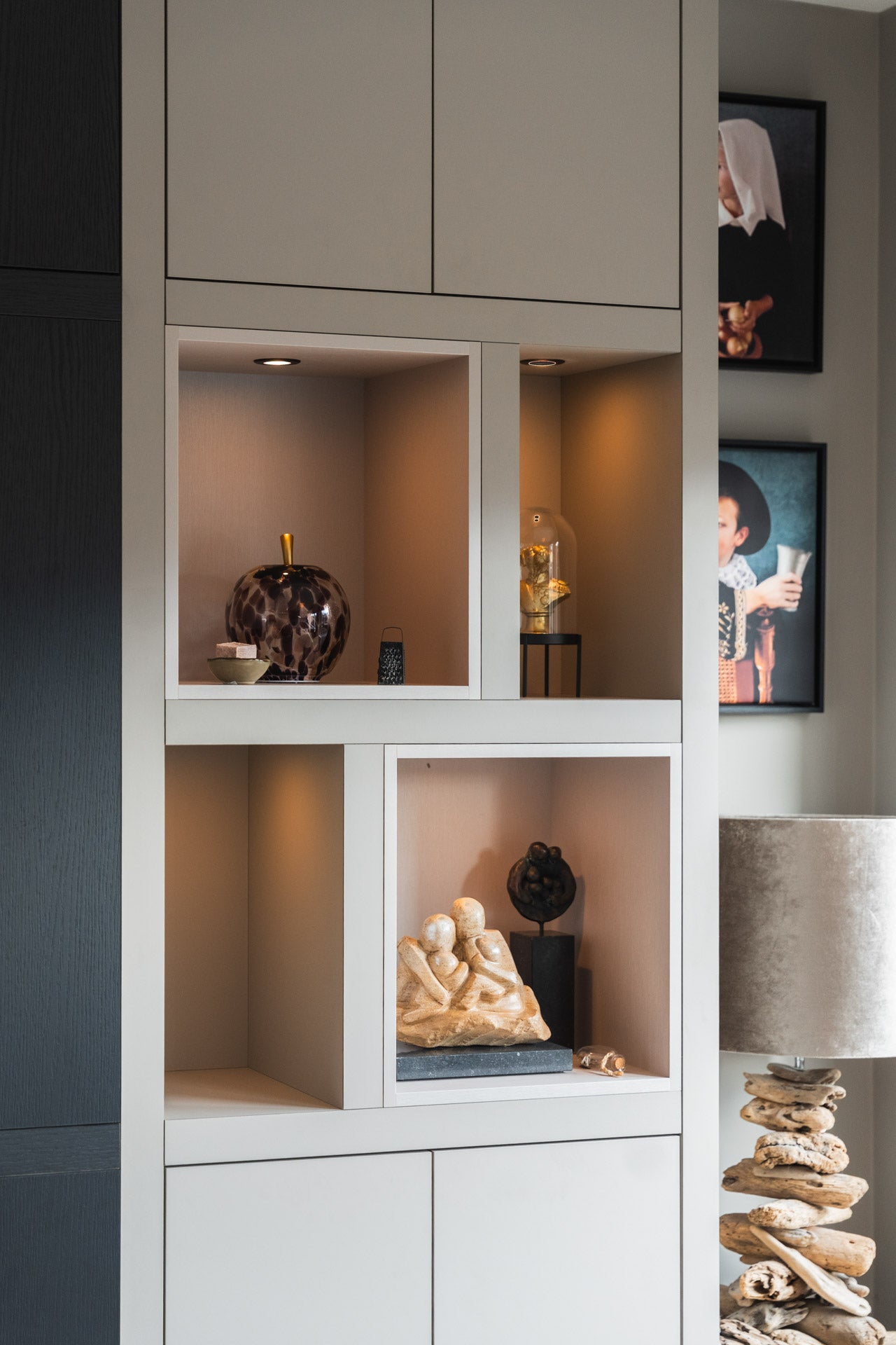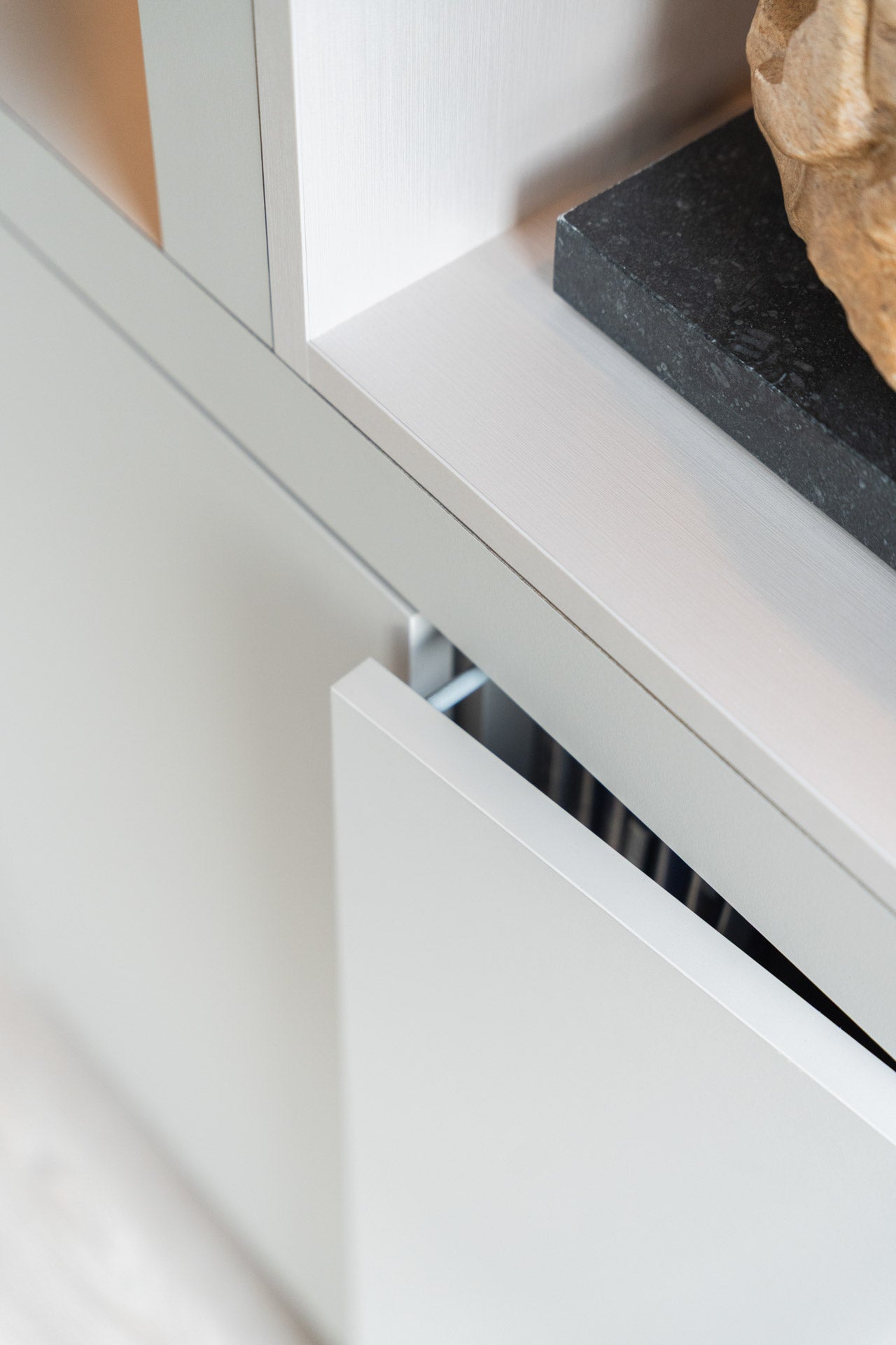 De volledige kast is opgebouwd uit Decolegno plaatmateriaal en bestaat uit een combinatie van contrasterende materialen en verfijnde details. Voor het tv-gedeelte is gekozen voor U129 Quercia zwart houtstructuur, wat een krachtig en modern accent geeft. De omliggende niskasten zijn uitgevoerd in UB05 Talco zandkleurige unikleur, gecombineerd met nisdetails in FB76 Reflex met lichte metallic structuur. De open nissen zijn voorzien van dimbare ronde spots met warm-wit licht, waardoor decoratieve items subtiel worden uitgelicht. Daarnaast zijn alle kastdeuren uitgerust met een push-to-open mechanisme, wat zorgt voor een strak en greeploos design dat perfect past bij de minimalistische uitstraling van de cinewall.