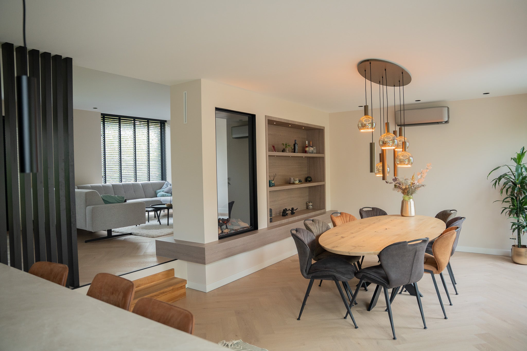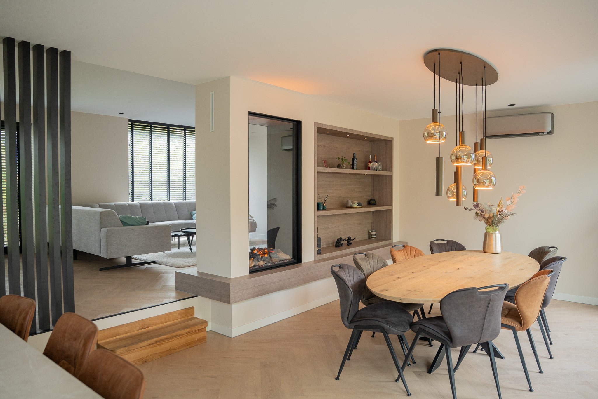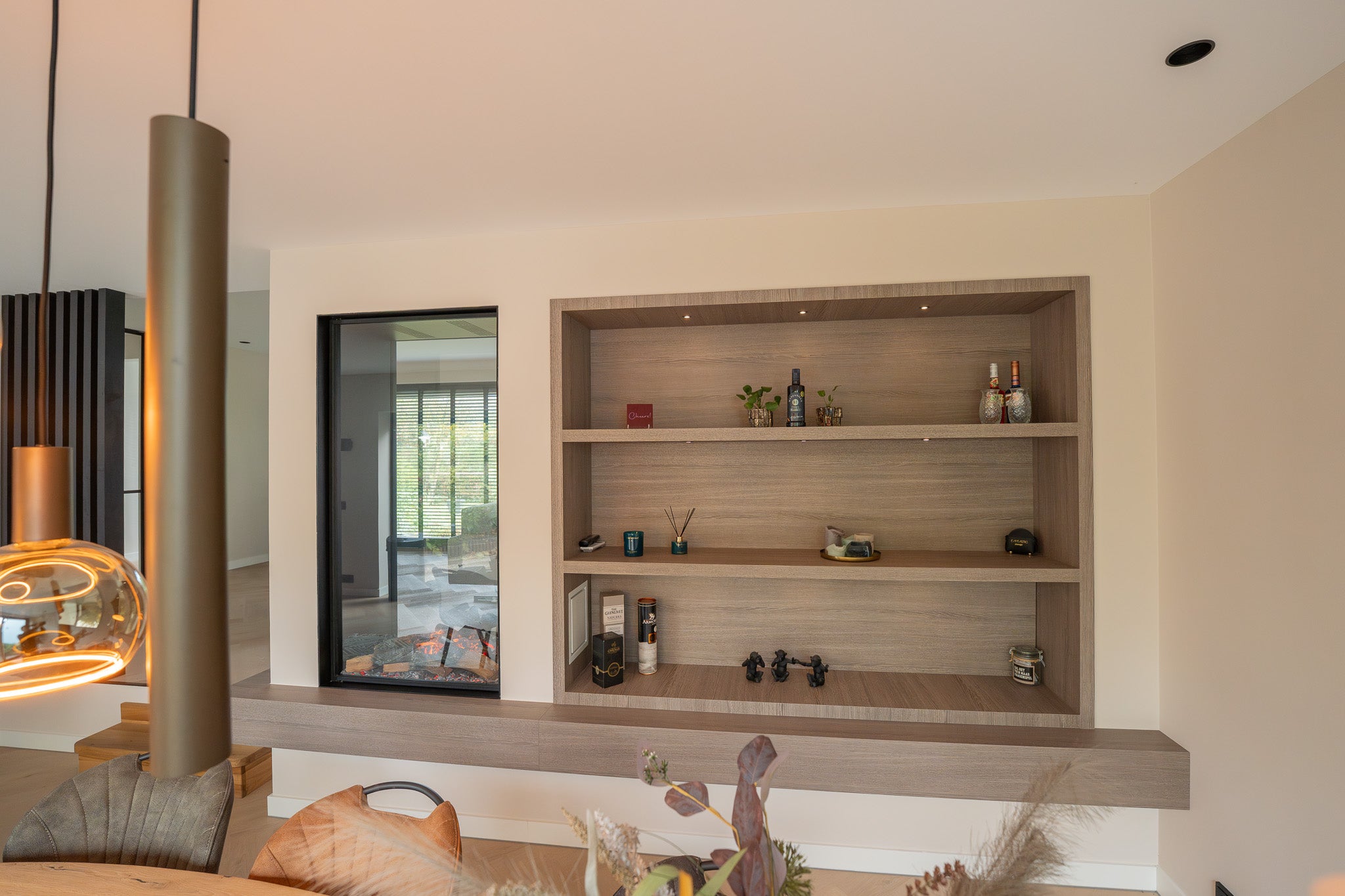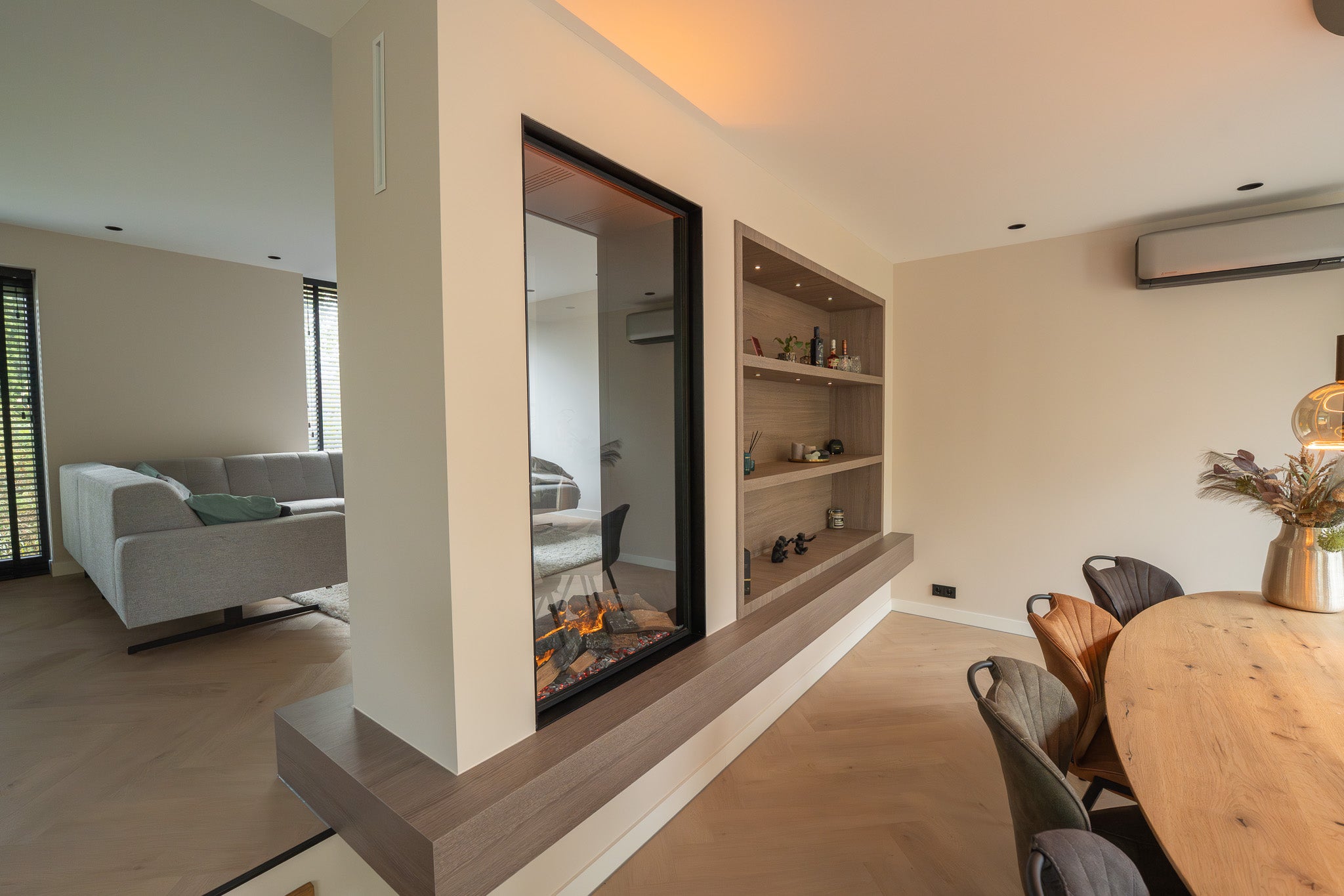 In deze woning hebben we een exclusieve roomdivider gerealiseerd waarin een Faber waterdamp haard stijlvol is geïntegreerd. De roomdivider scheidt de woonkamer subtiel van de eetkamer en behoudt tegelijkertijd het open karakter van de ruimte. De ingebouwde haard zorgt voor een realistisch vlambeeld dankzij de innovatieve waterdamstechnologie van Faber, waarmee u kunt genieten van sfeer en warmte zonder echte verbranding. Aan één zijde is de kast voorzien van een ingebouwde verwarming, zodat de haard niet alleen visueel warmte biedt, maar ook daadwerkelijk comfort toevoegt aan de ruimte.
