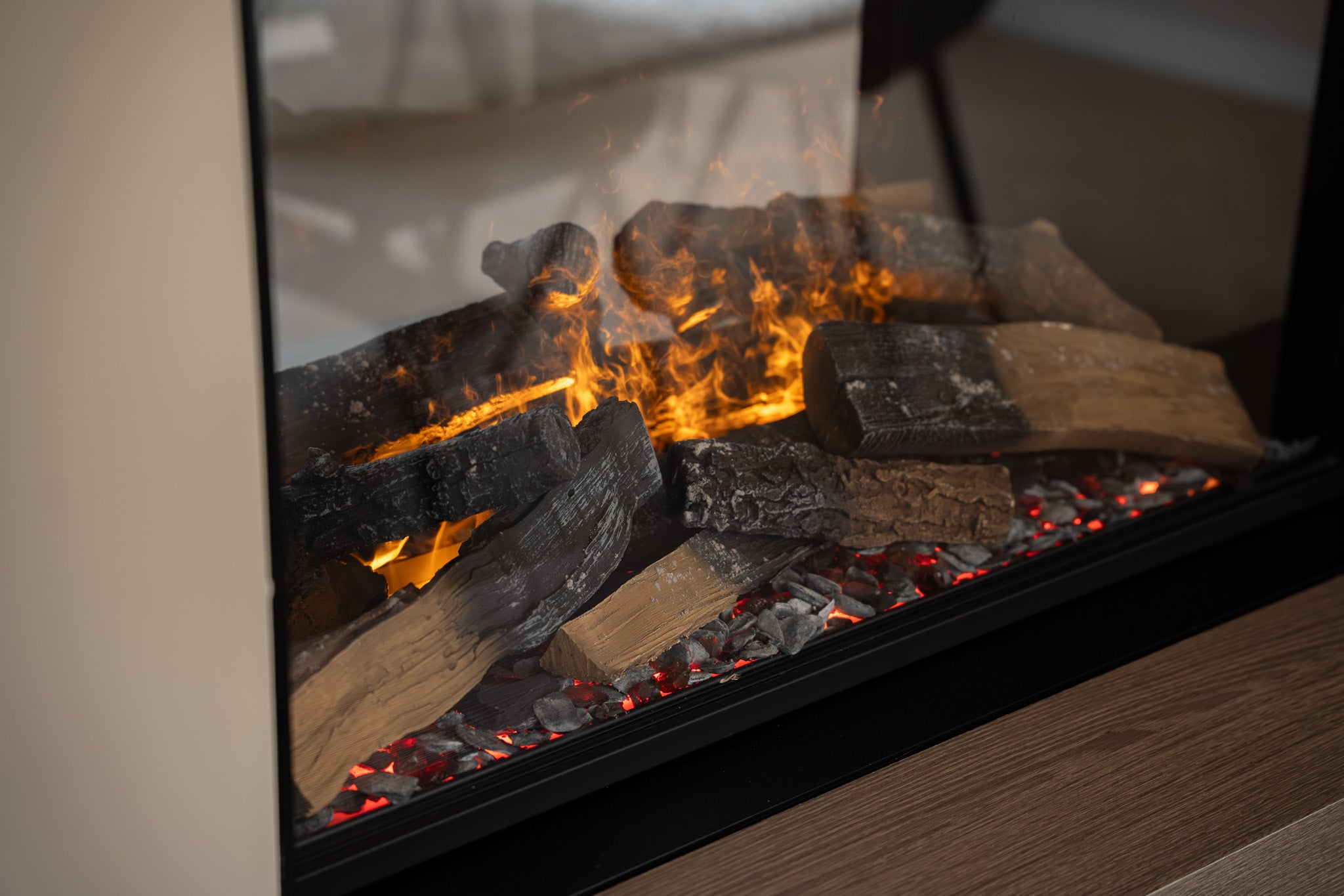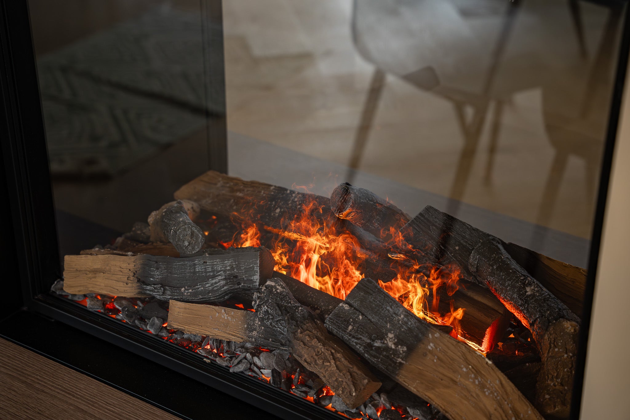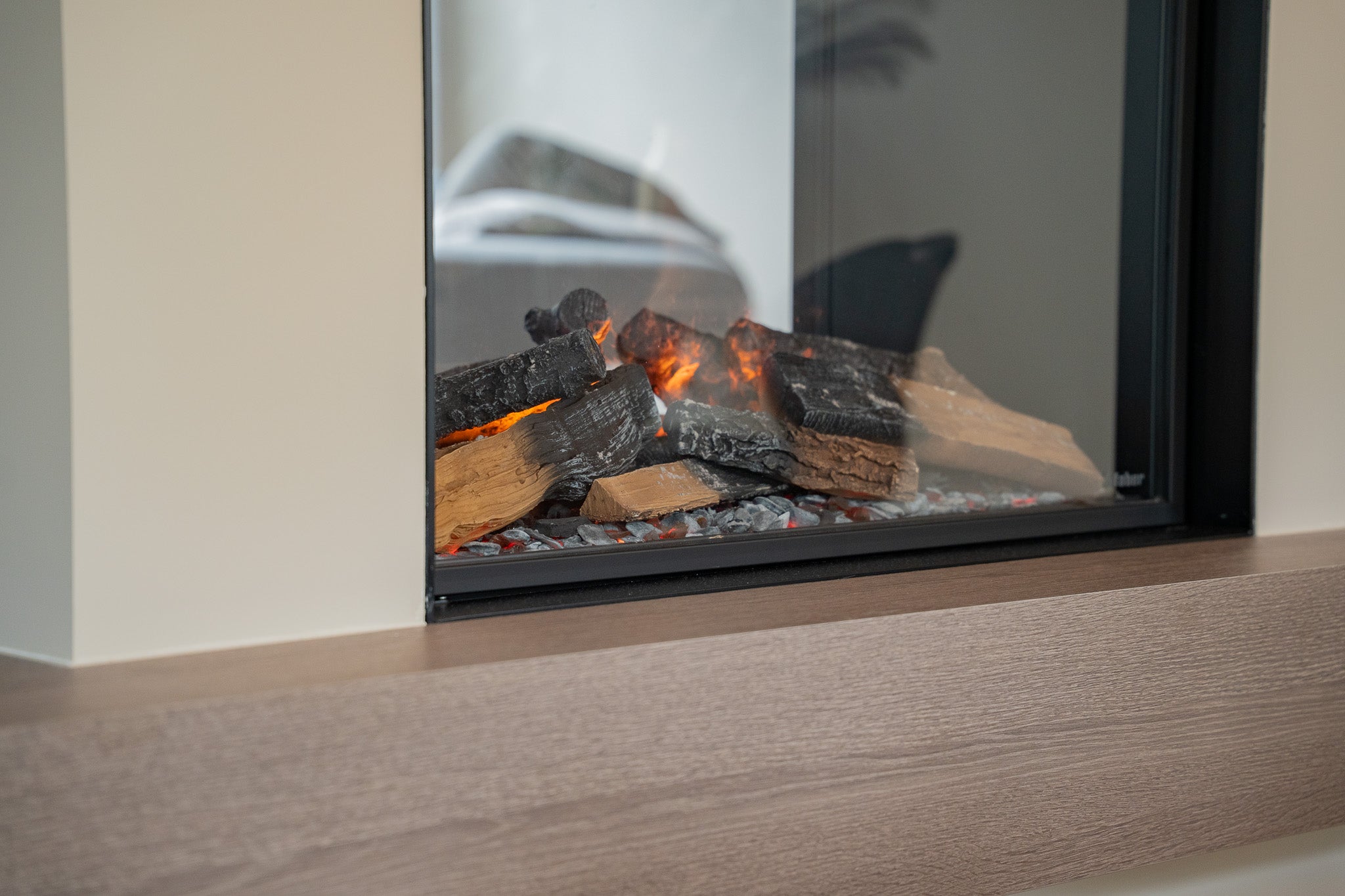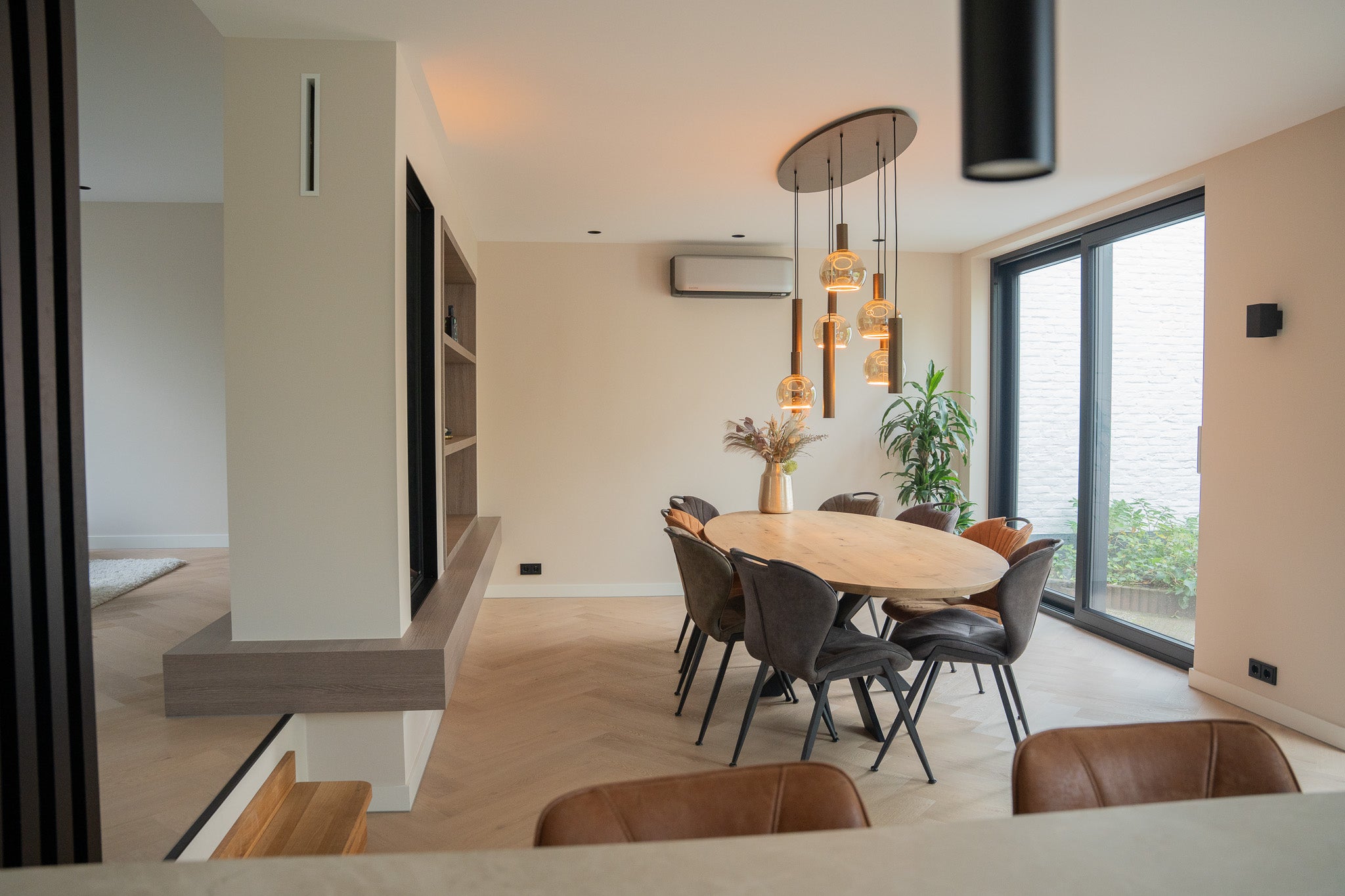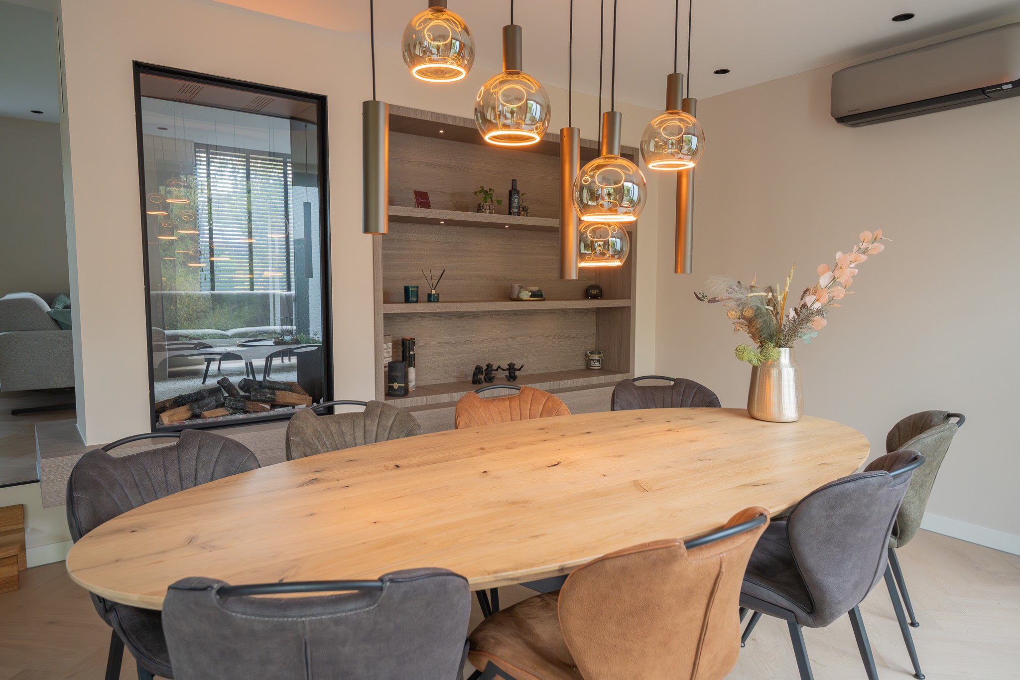 In deze woning hebben we een exclusieve roomdivider gerealiseerd waarin een Faber waterdamp haard stijlvol is geïntegreerd. De roomdivider scheidt de woonkamer subtiel van de eetkamer en behoudt tegelijkertijd het open karakter van de ruimte. De ingebouwde haard zorgt voor een realistisch vlambeeld dankzij de innovatieve waterdamstechnologie van Faber, waarmee u kunt genieten van sfeer en warmte zonder echte verbranding. Aan één zijde is de kast voorzien van een ingebouwde verwarming, zodat de haard niet alleen visueel warmte biedt, maar ook daadwerkelijk comfort toevoegt aan de ruimte.