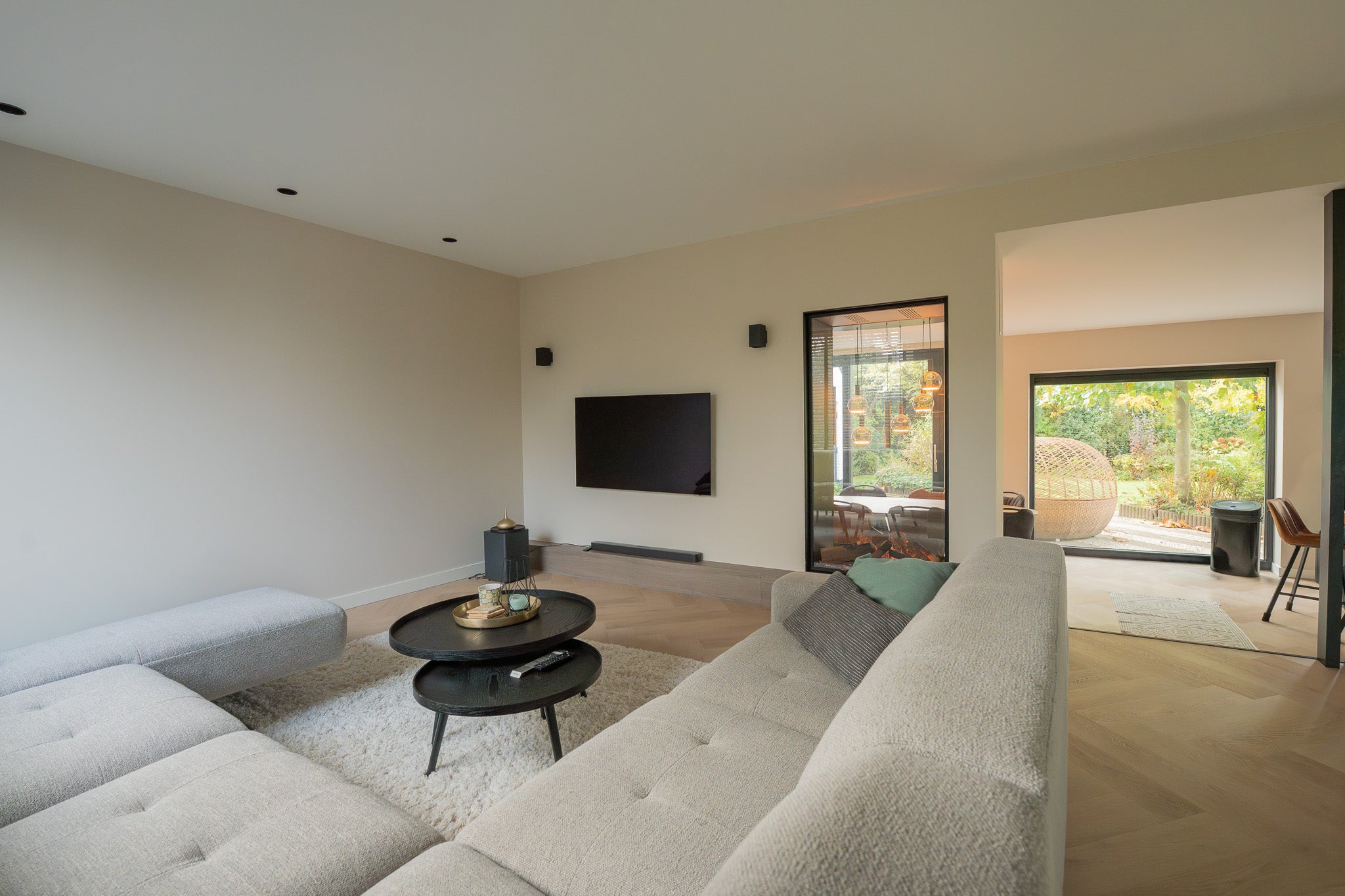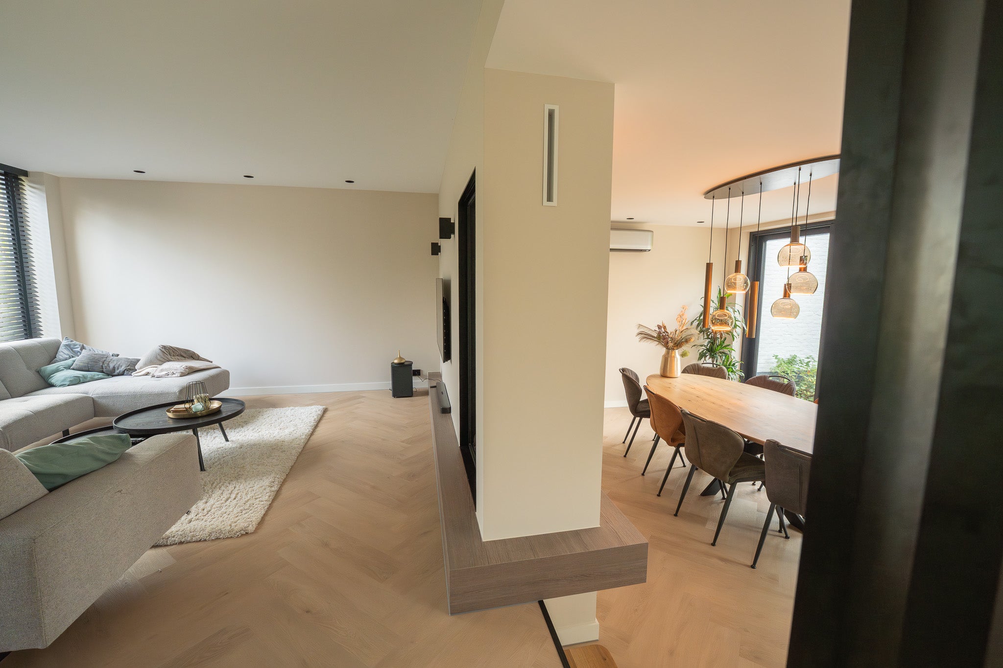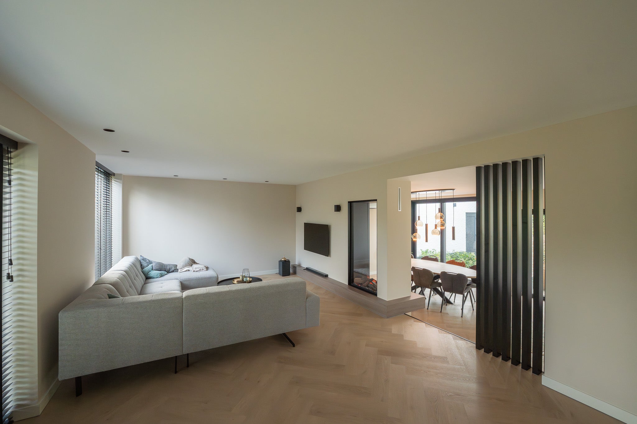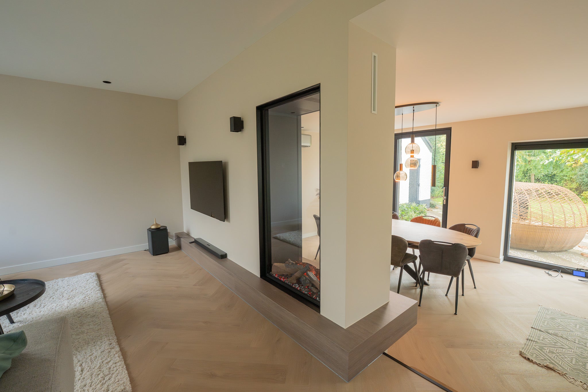 Roomdivider met haard, tv en afwerking op maat
