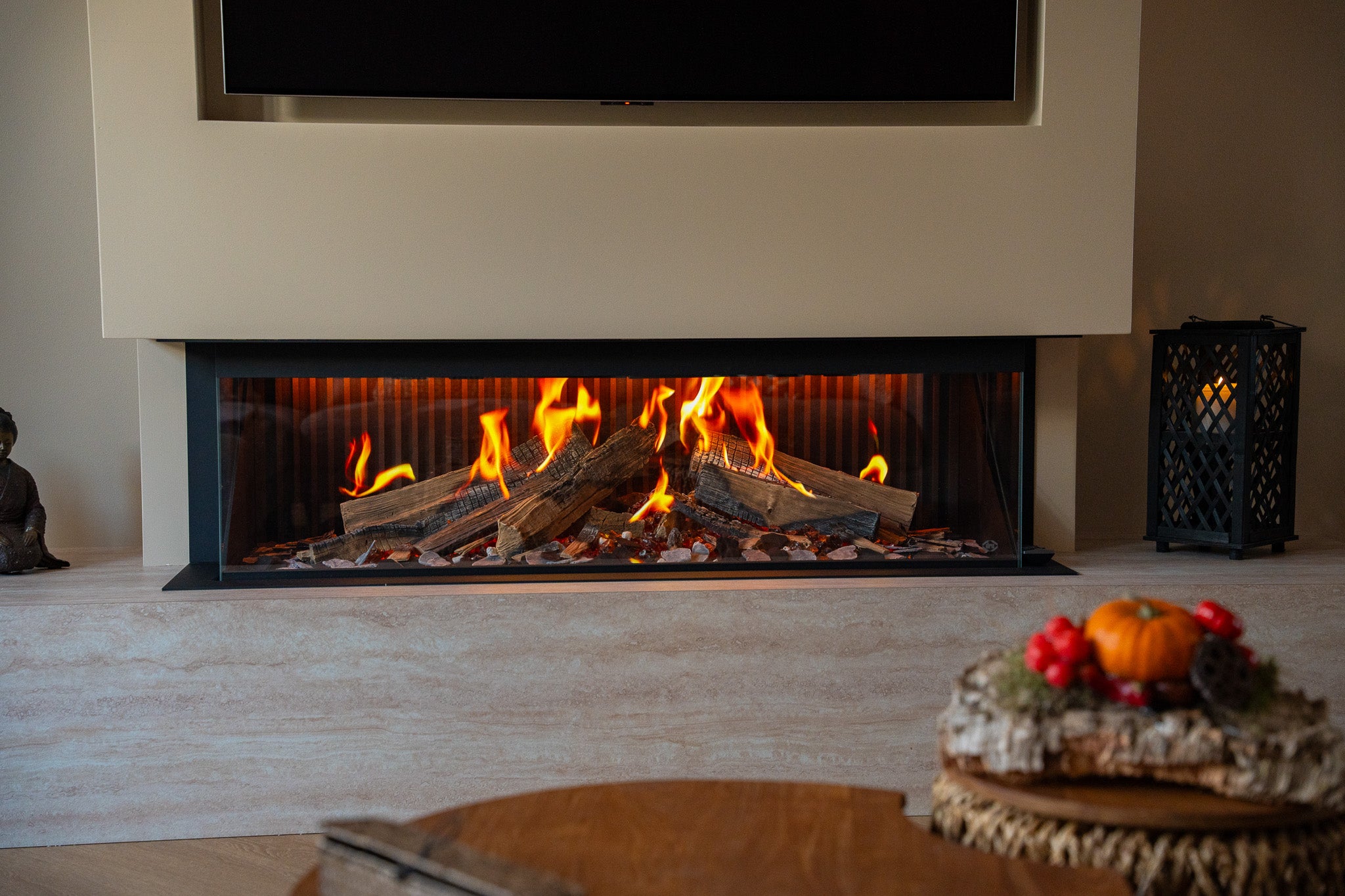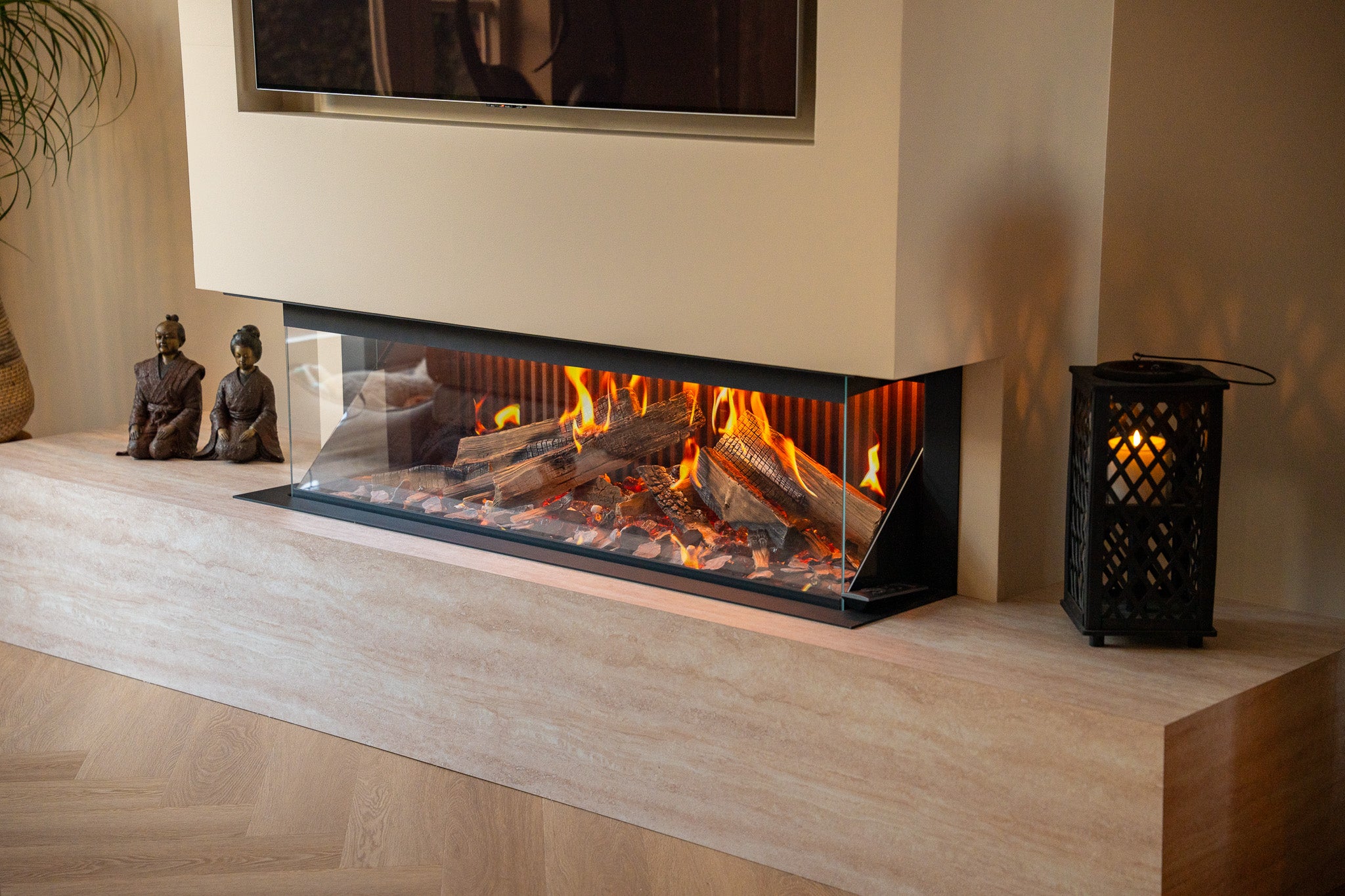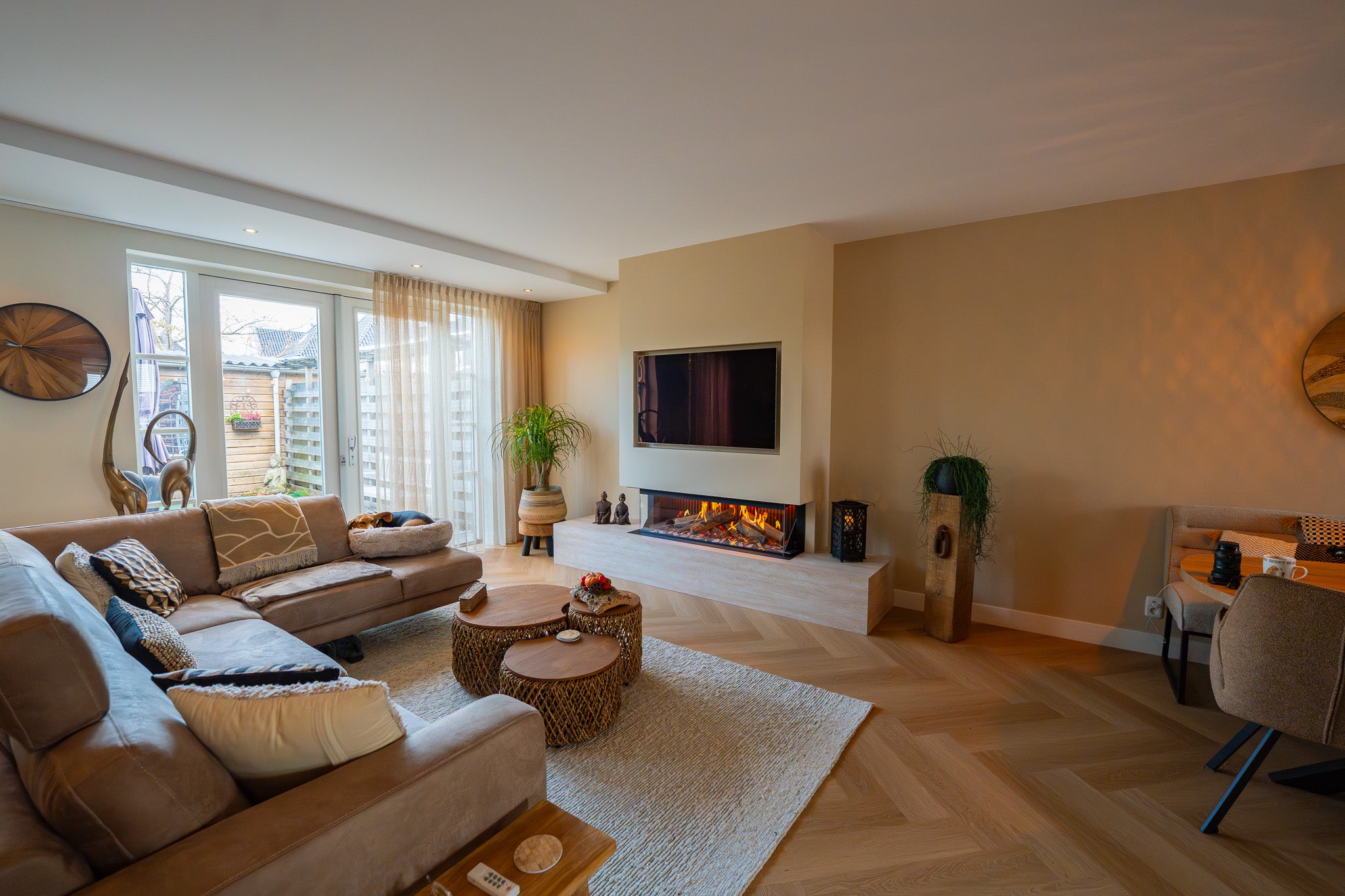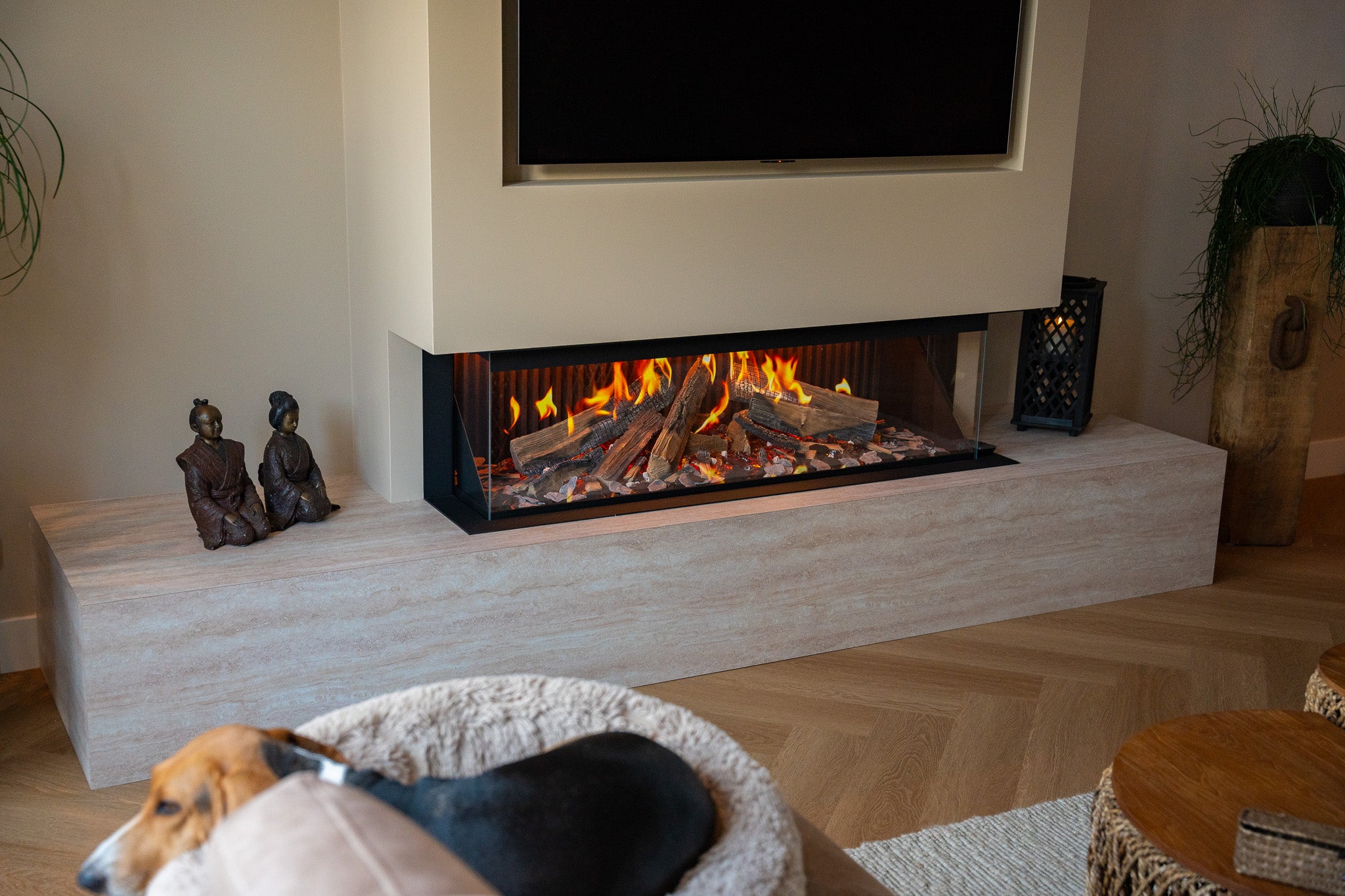 Boven het onderblok is een strak vormgegeven geverfde koof geplaatst, waarin de DRU Virtuo Evolve hologramhaard is geïntegreerd. Voor een perfect eindresultaat is de koof opgebouwd uit gegrond MDF, zodat deze volledig verfklaar was en een egale, hoogwaardige afwerking kreeg. De DRU Virtuo Evolve zorgt met zijn realistische vlambeeld en moderne technologie voor sfeer en comfort, zonder rookafvoer. Het resultaat is een tijdloos haardmeubel in Spaarndam waarin design, innovatie en maatwerk samenkomen en dat fungeert als echte blikvanger in de woonruimte.