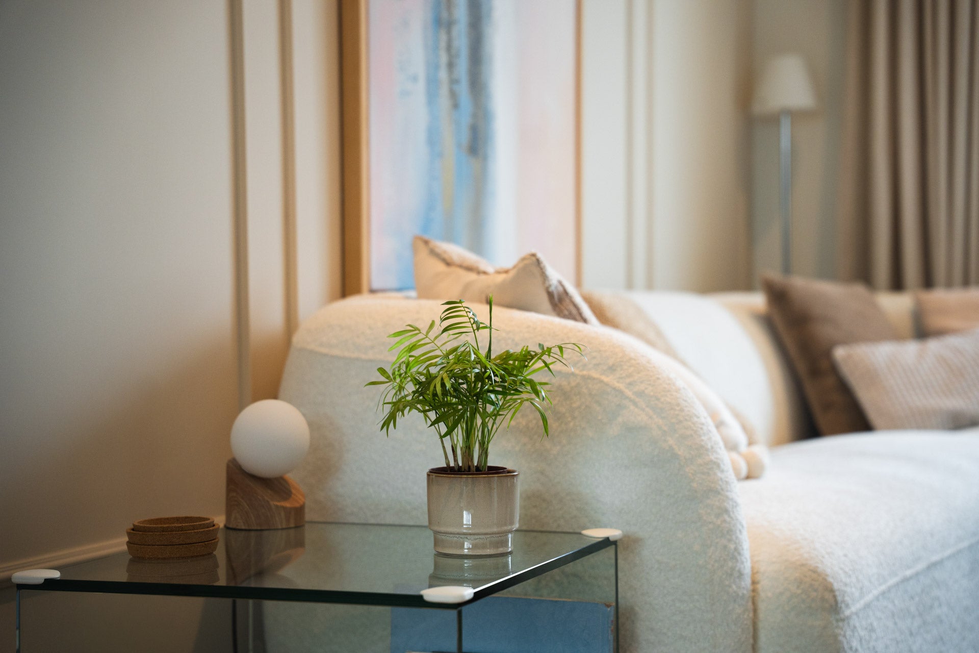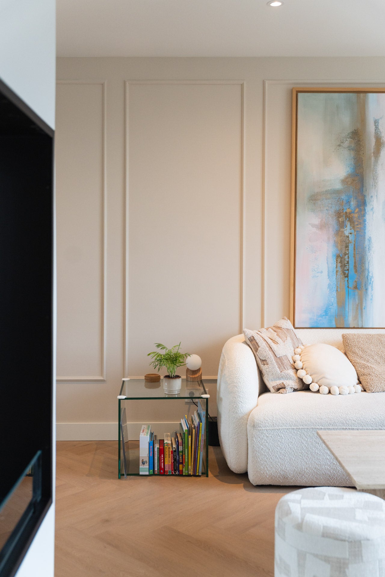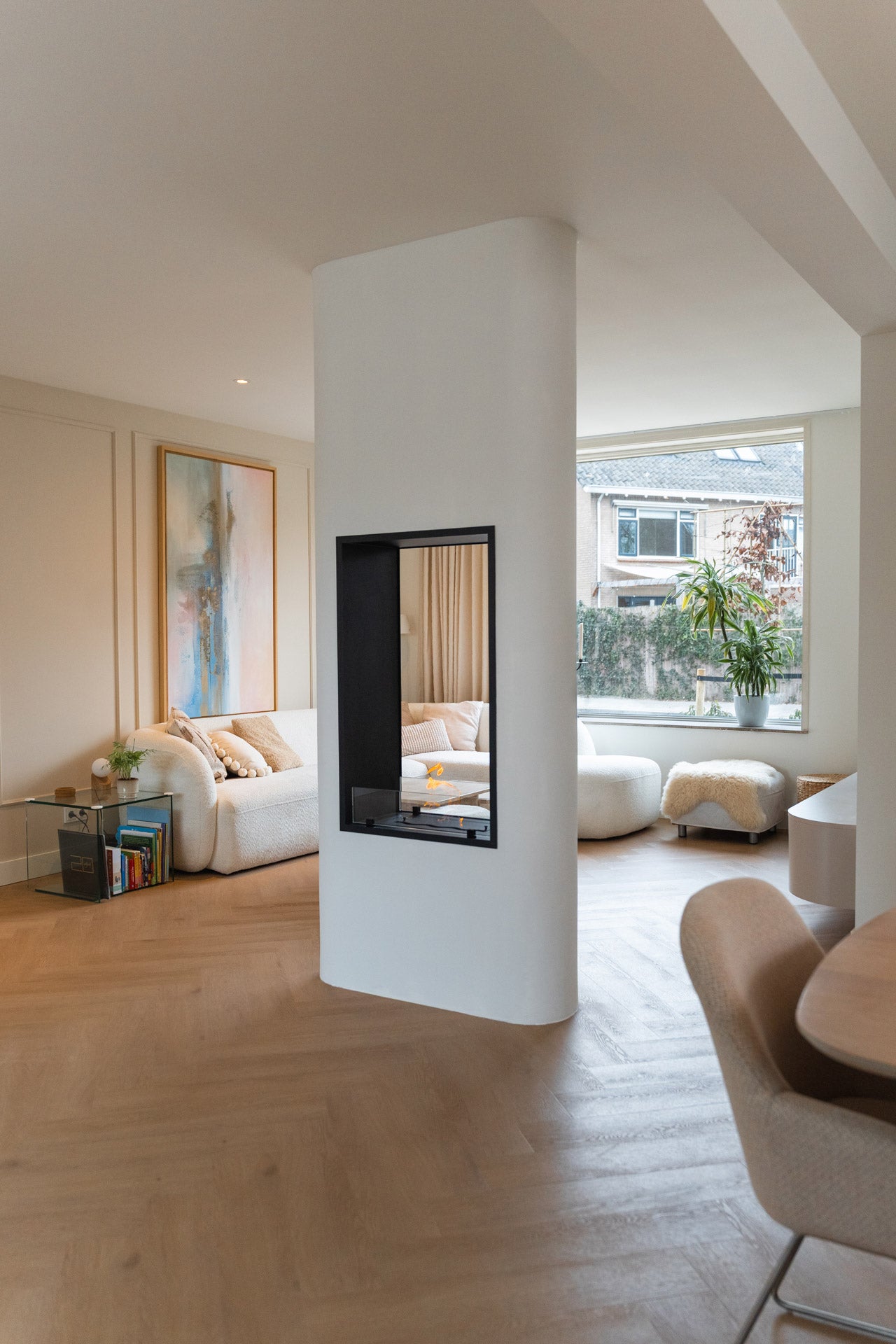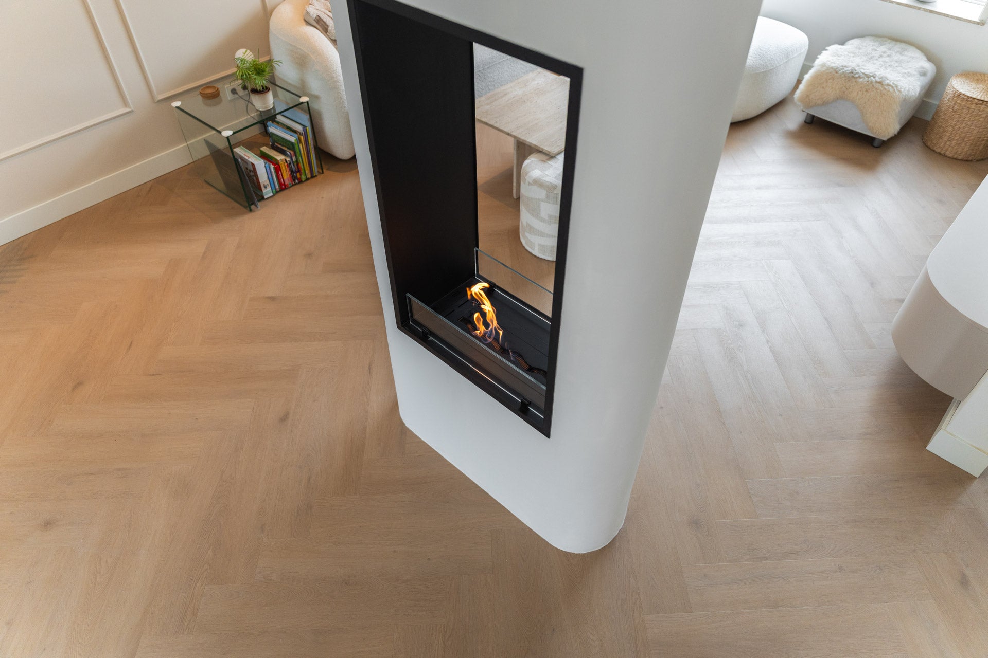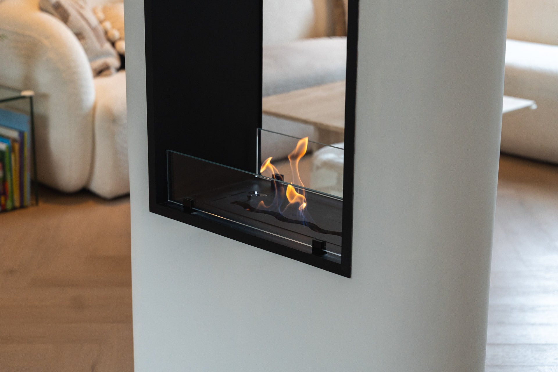 De ombouw van de roomdivider is opgebouwd uit brandvertragend Promasil, een materiaal dat zeer geschikt is voor haardconstructies met echt vuur en warmte-afgifte. Het geheel is stuc-klaar opgeleverd, zodat de stucadoor de roomdivider naadloos kon afwerken. Vervolgens is de ombouw door de schilder strak wit geschilderd, waardoor de haard perfect opgaat in het interieur en een minimalistische en rustige uitstraling krijgt. Zo vormt de roomdivider een stijlvolle scheiding tussen de ruimtes, terwijl het warme vlammenspel voor extra sfeer zorgt.