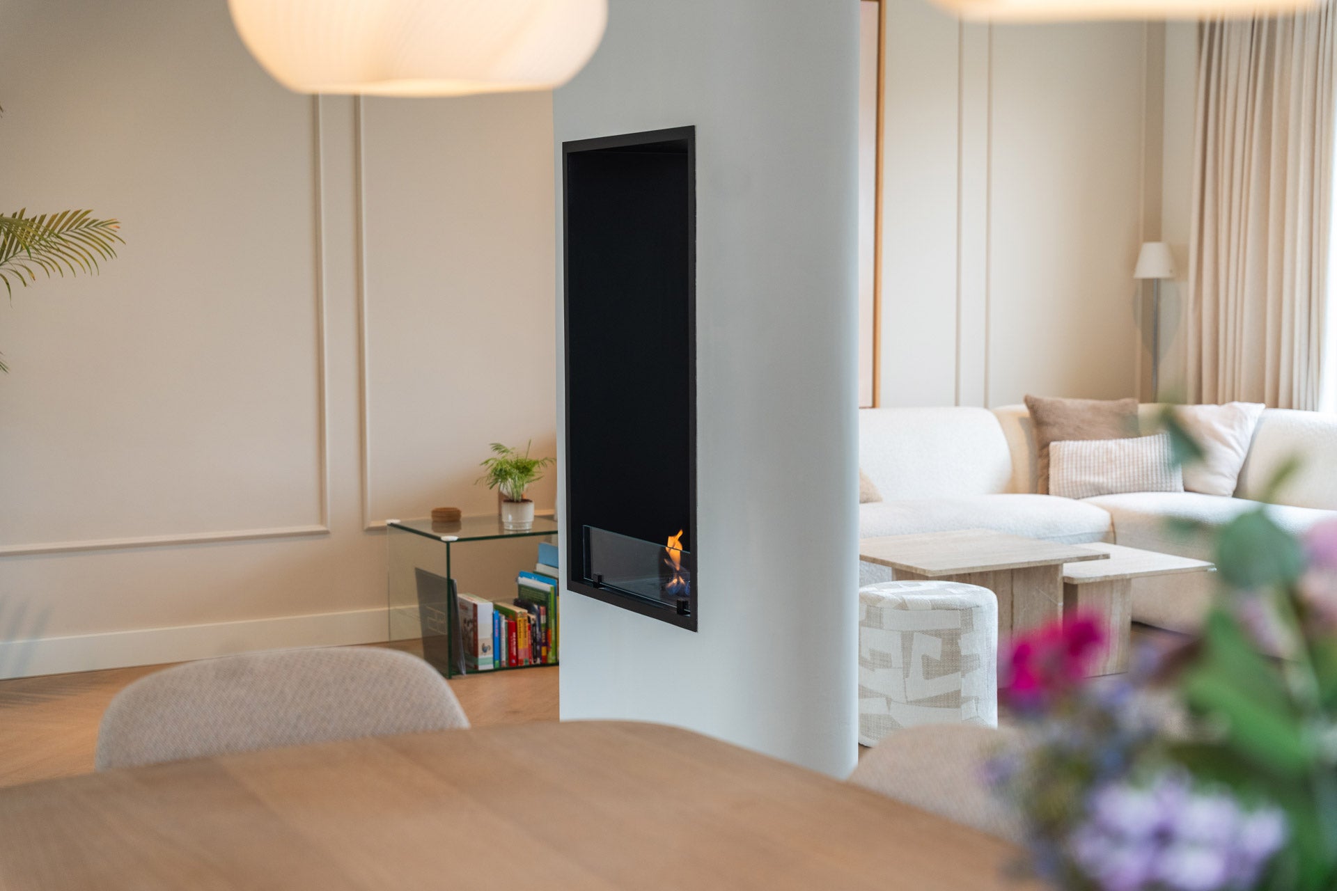 In dit project hebben wij een stijlvolle roomdivider met een verticale doorkijkhaard gerealiseerd die de ruimte op een subtiele manier opdeelt zonder het open karakter te verliezen. In de roomdivider is een Infire Vertical bio-ethanol doorkijkhaard geplaatst met afmetingen van 140 cm hoog en 70 cm breed. Door het verticale ontwerp ontstaat een bijzonder en elegant vlammenspel dat zowel vanuit beide zijden van de ruimte zichtbaar is. Hierdoor fungeert de haard niet alleen als sfeermaker, maar ook als een opvallend architectonisch element in het interieur.