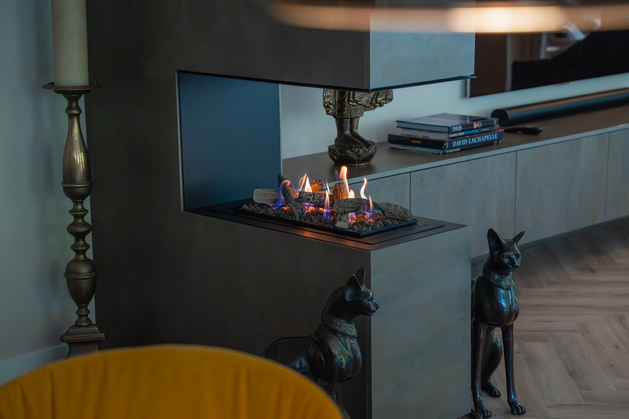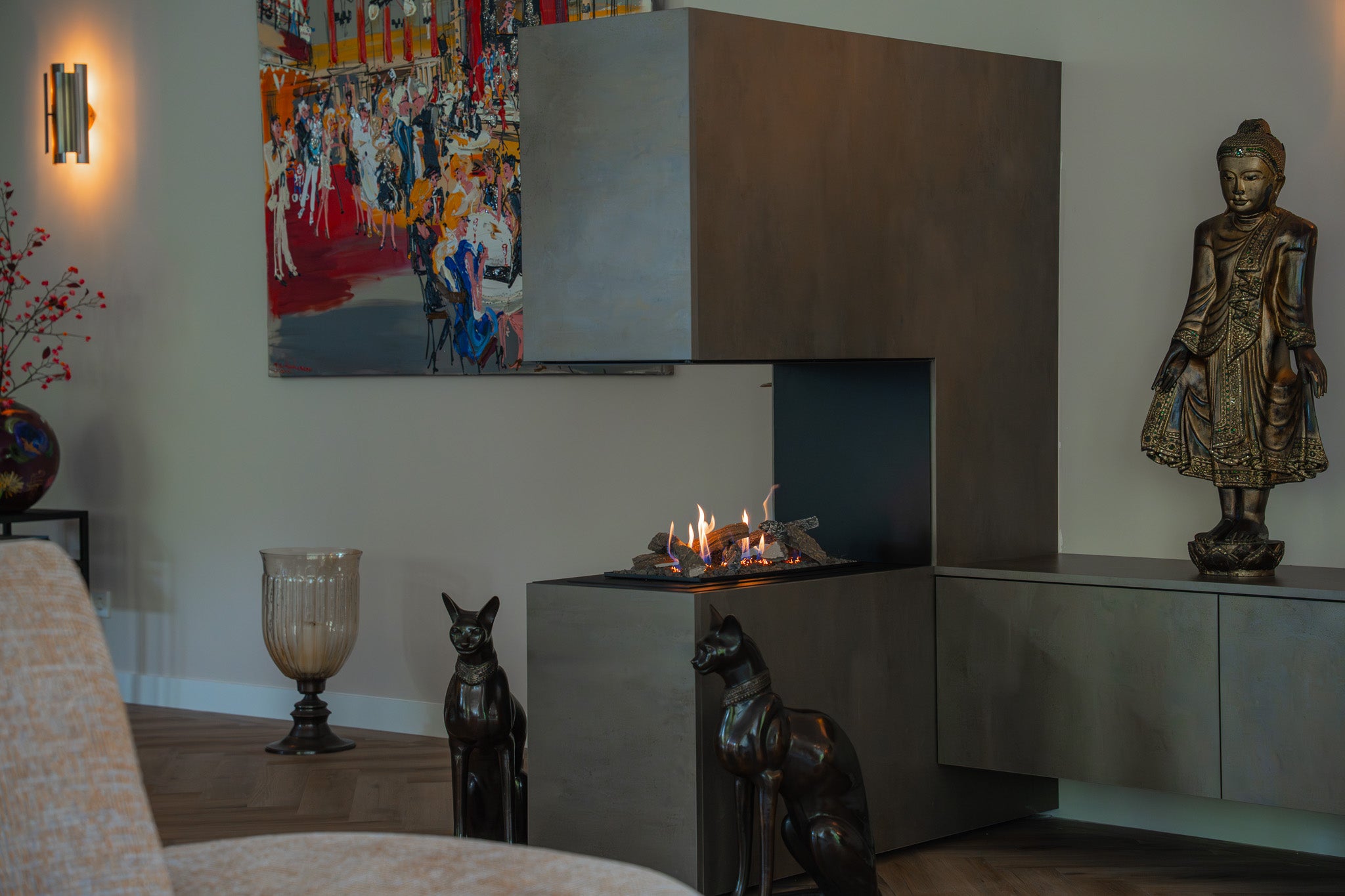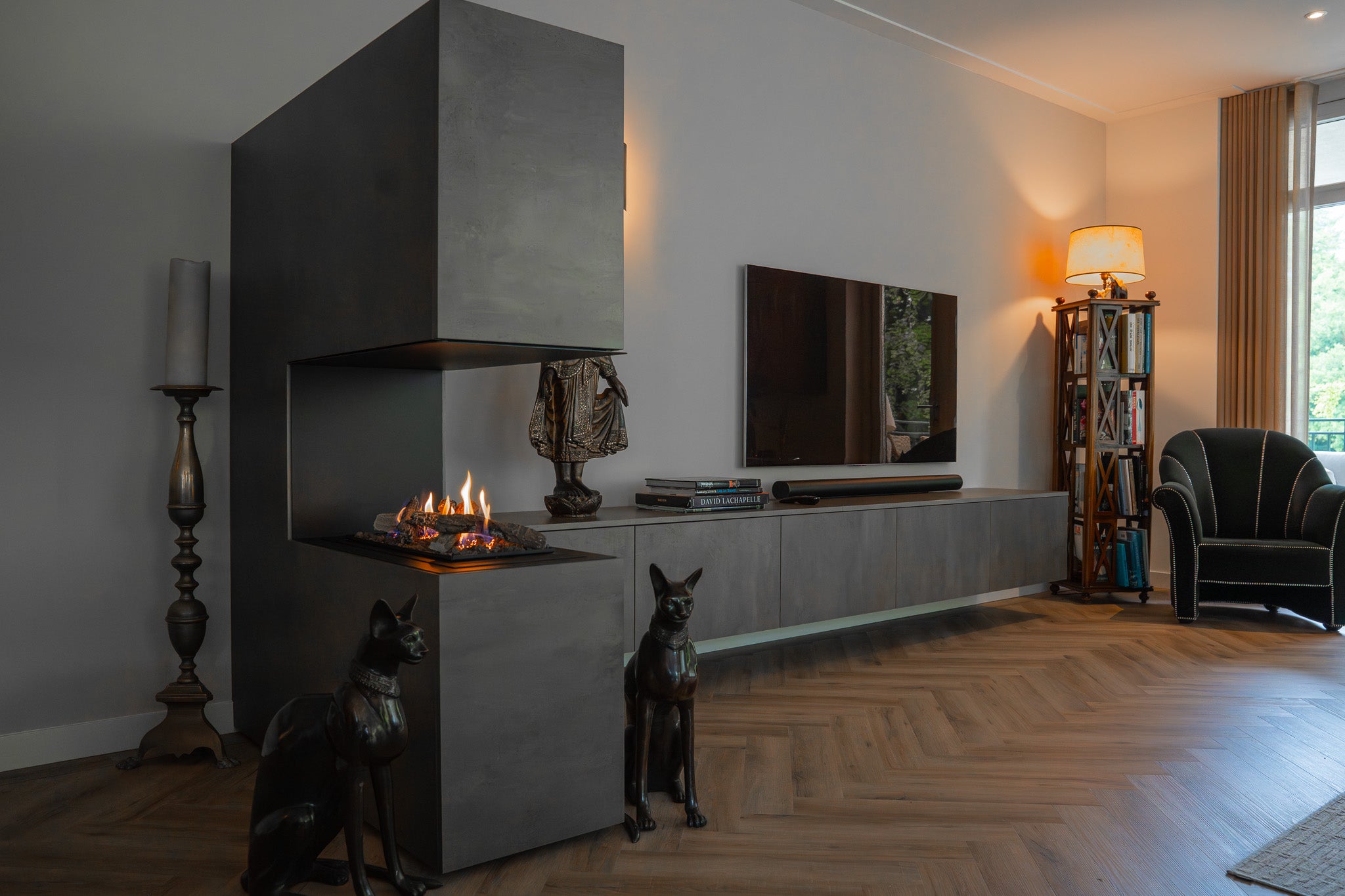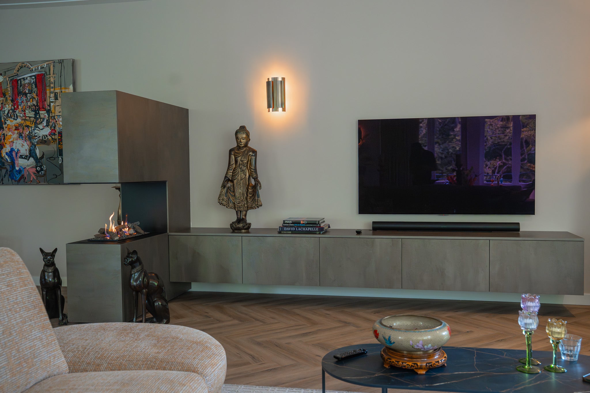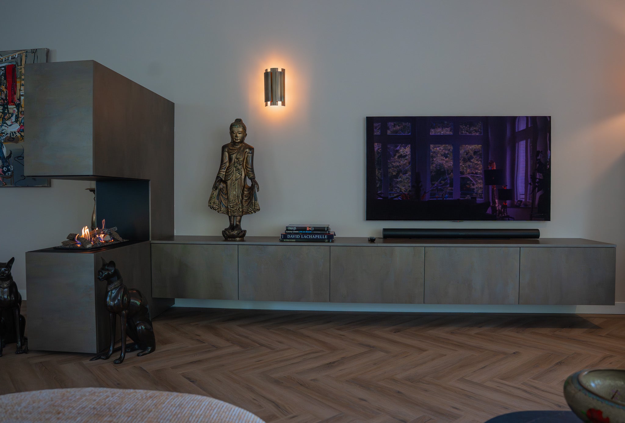 De geïntegreerde Neverdark bio-ethanol haard biedt een realistisch en levendig vlambeeld, zonder de noodzaak van een rookkanaal. Hierdoor is de haard eenvoudig te plaatsen en onderhoudsarm, ideaal voor moderne woonruimtes. Voor dit project in Bakkum hebben we het haardmeubel dressoir volledig afgestemd op de wensen van de bewoners, met oog voor detail en balans tussen design en gebruiksgemak. Het resultaat is een uniek meubelstuk dat warmte, elegantie en praktische functionaliteit samenbrengt in één harmonieuze opstelling.