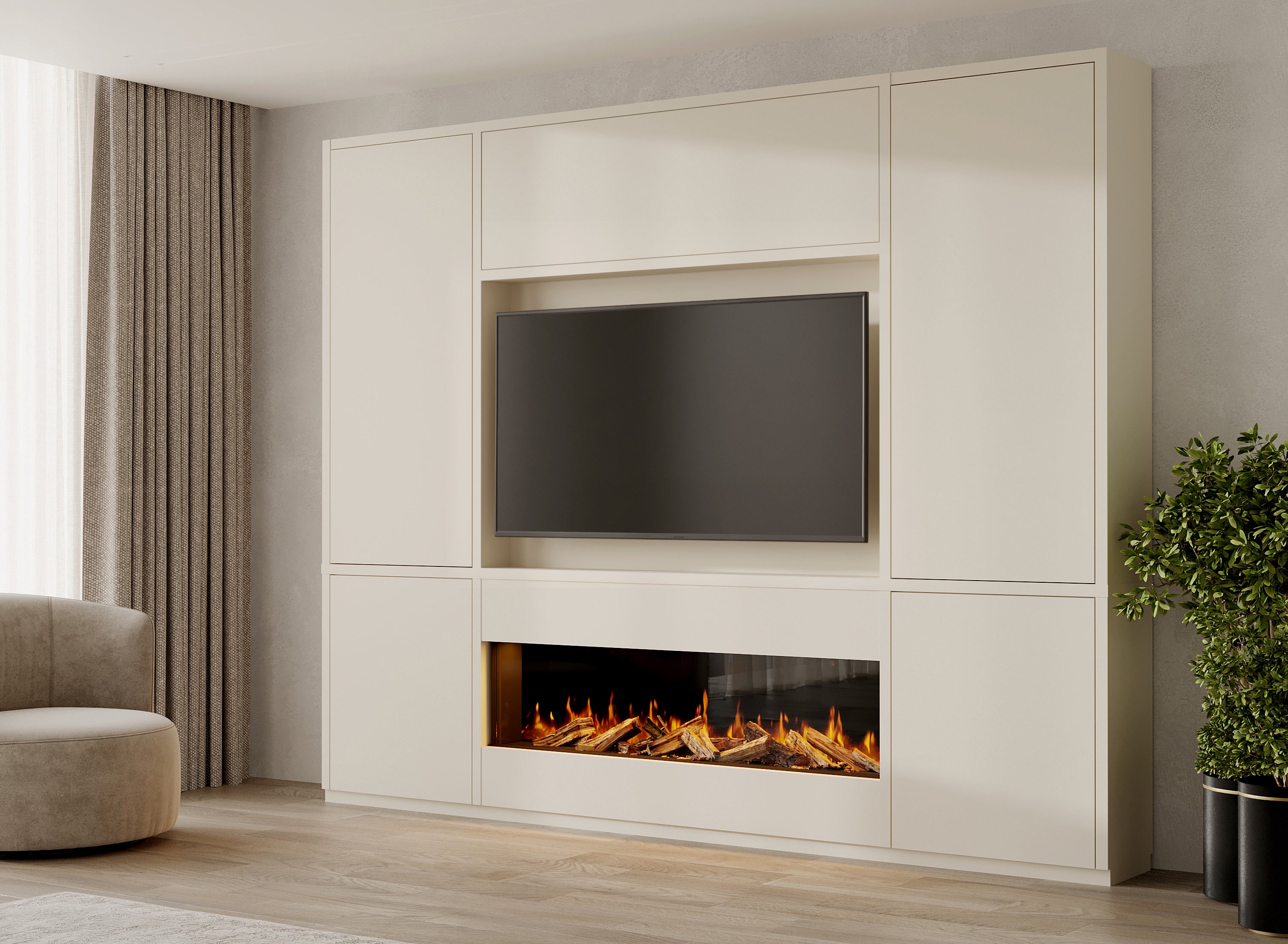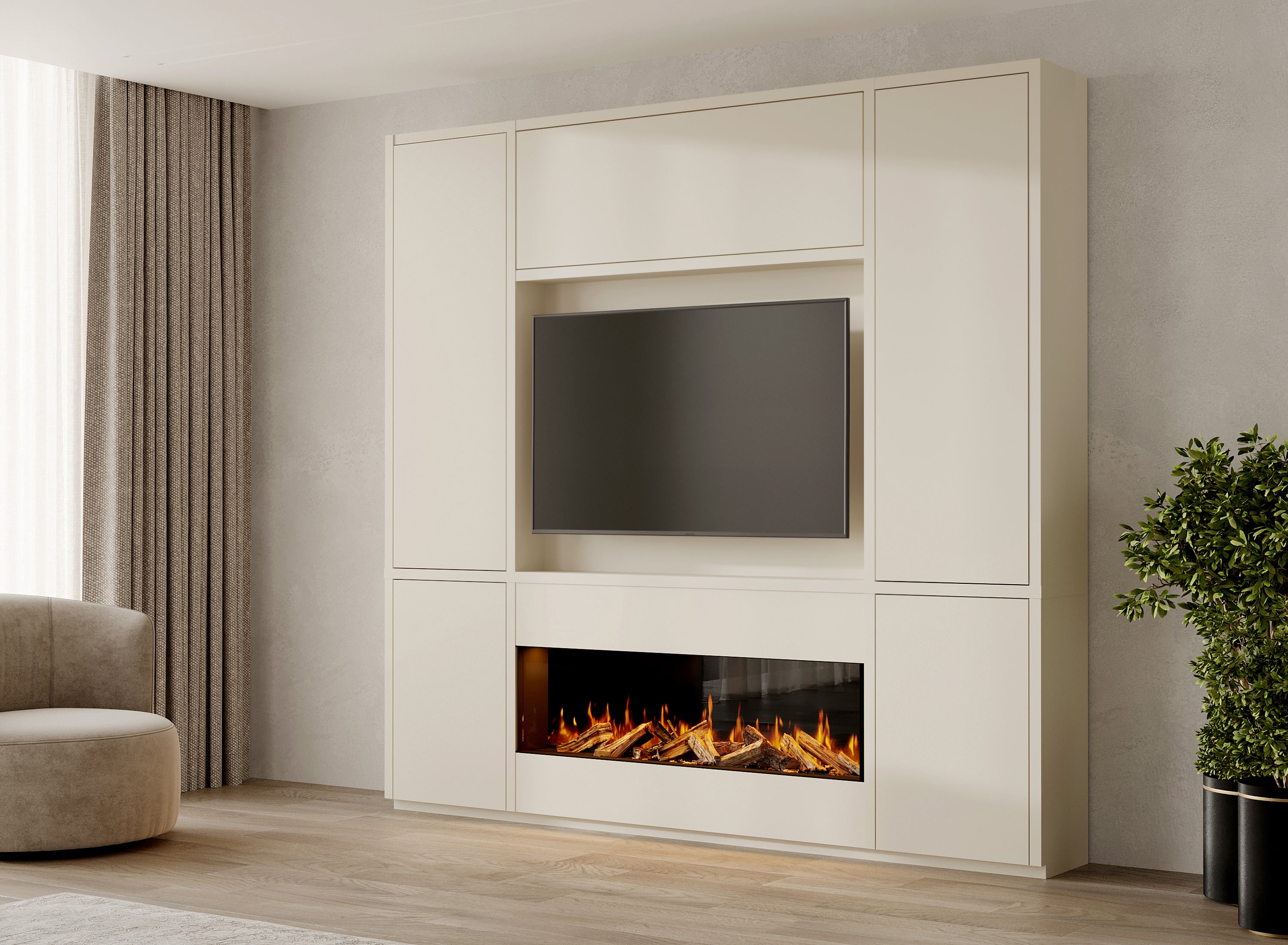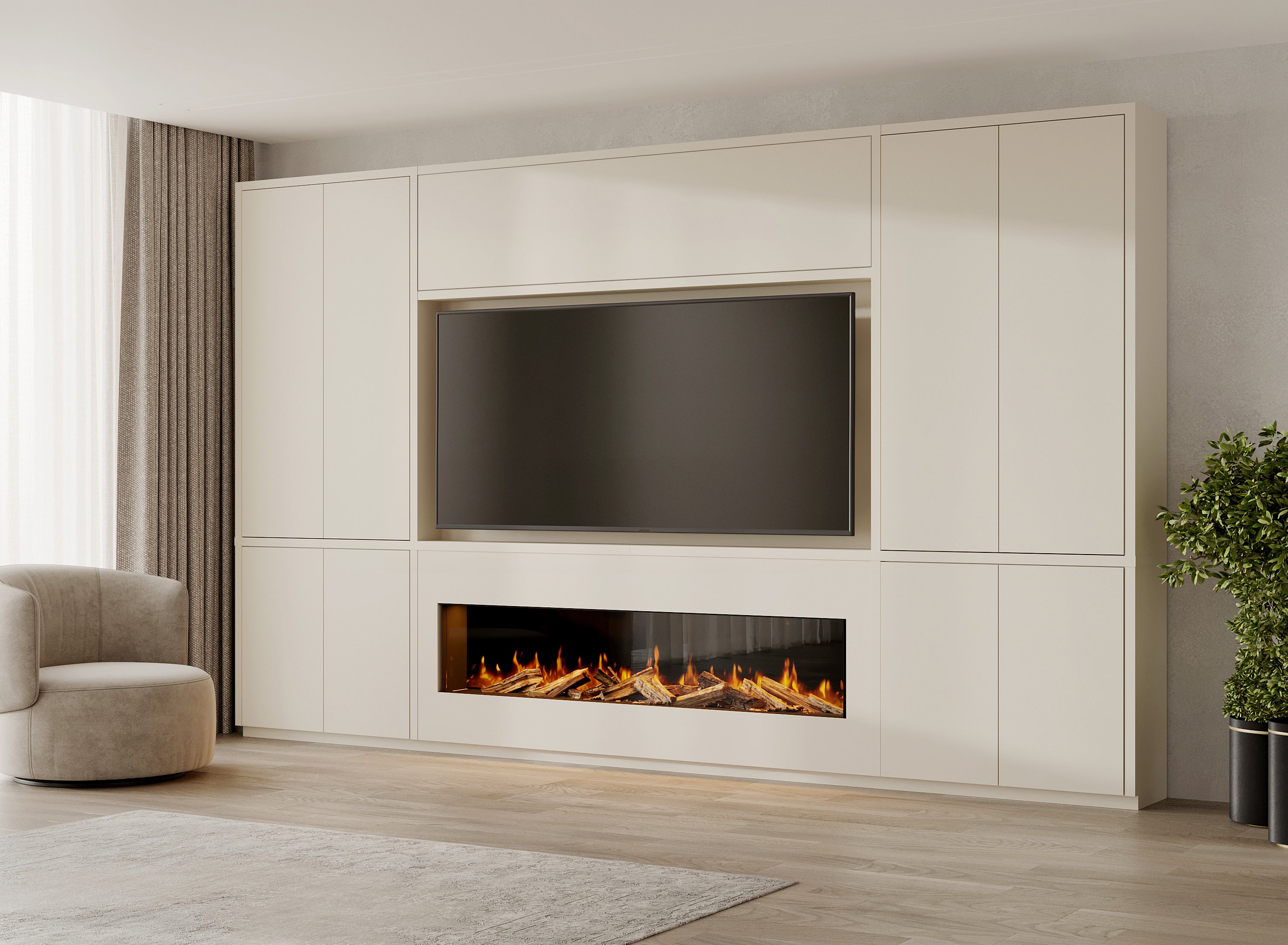 Transformeer uw woonkamer met een cinewall die warmte en elegantie uitstraalt. De open nissen geven ruimte aan persoonlijke accenten en decoraties, terwijl subtiel geplaatste verlichting het vuur en de inrichting laat stralen. Zo brengt u TV meubel design en gezelligheid samen, met een unieke blikvanger die volledig past in uw interieur.