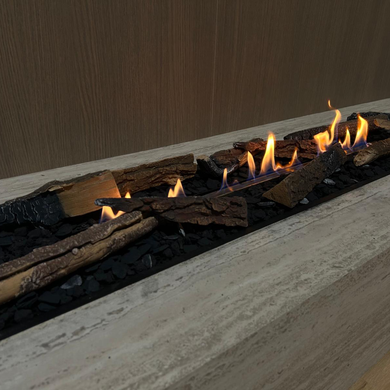 Geef uw haard een indrukwekkende upgrade met onze nieuwe Deluxe Decoratieset. Deze luxe bodemdecoratie bestaat uit zwarte lavastenen, zwarte en grijze chips én een handgemaakte keramische houtset met een uiterst realistische uitstraling. De keramische houtblokken lijken deels verbrand, compleet met boomschors en as – zo lijkt uw bio-ethanol haard net een gashaard!