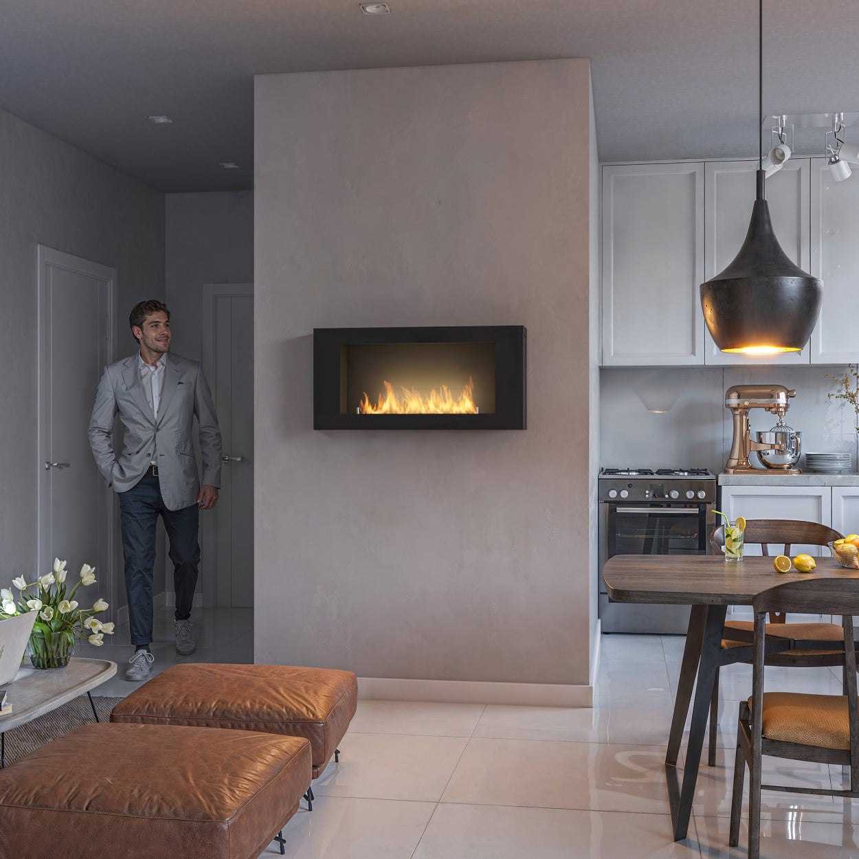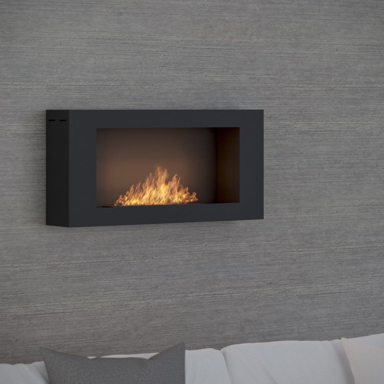 Dankzij de geïntegreerde zijkanten en het volledig afgewerkte ontwerp kunt u deze haard gewoon aan de muur hangen, zonder inbouwnis. Dat bespaart ruimte én installatietijd.