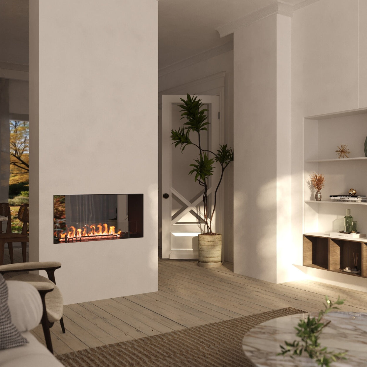 Deze klassieke Botan-uitvoering doet dienst als subtiele scheidingswand tussen twee leefruimtes. De centrale plaatsing en glazen doorkijkhaard brengen sfeer aan beide zijden. Ideaal voor wie openheid én gezelligheid wil combineren.