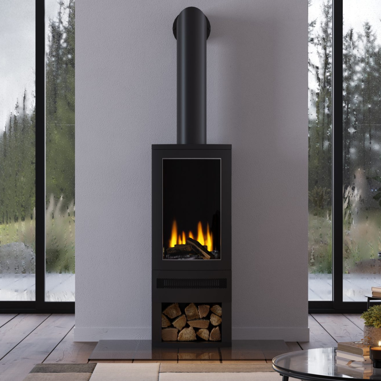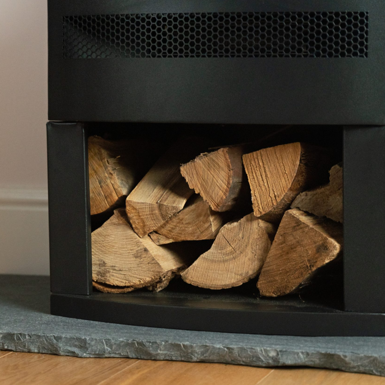 U bepaalt zelf hoe u deze elektrische kachel plaatst: vrijstaand op een sokkel, met een praktische houtopbergbox, of stijlvol aan de muur bevestigd.