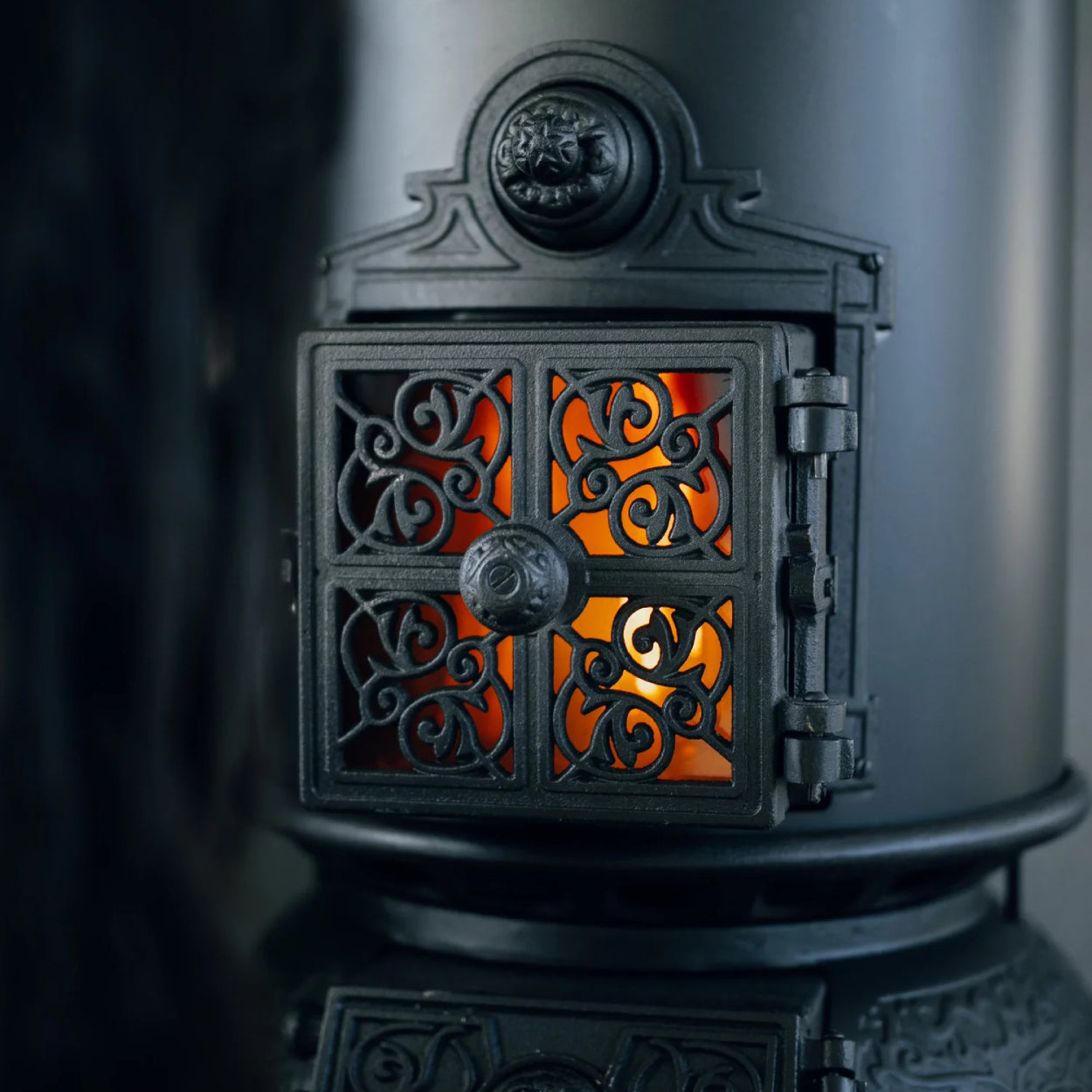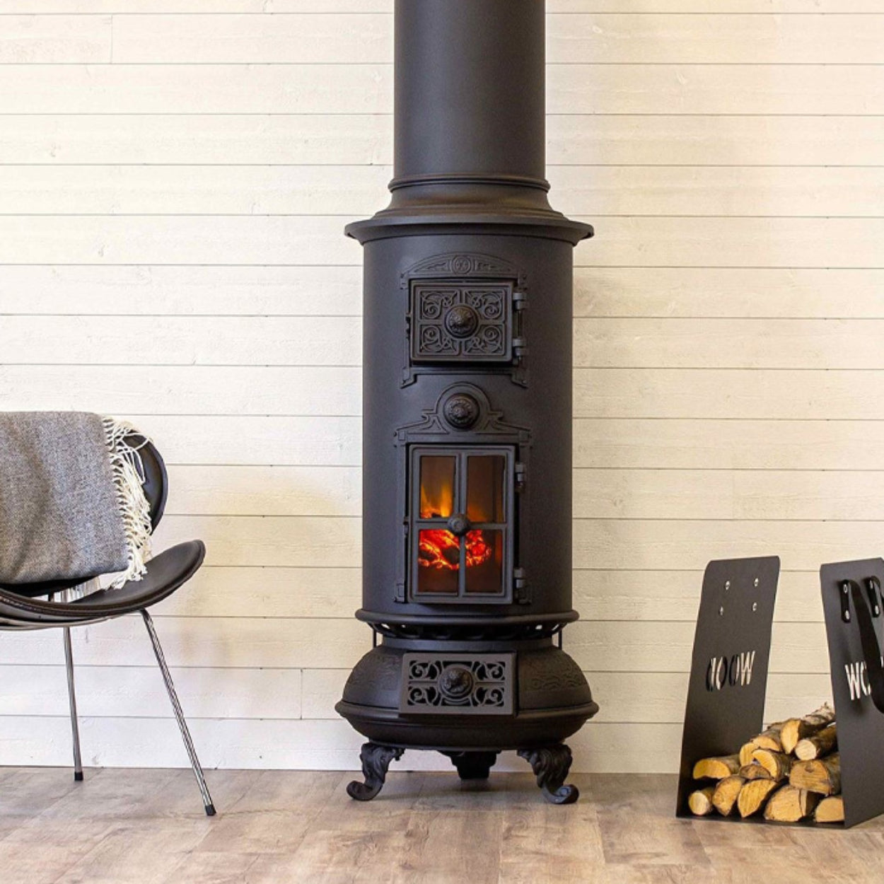 Geniet van de klassieke uitstraling van een authentieke gietijzeren houtkachel, ideaal voor een warm en sfeervol interieur.