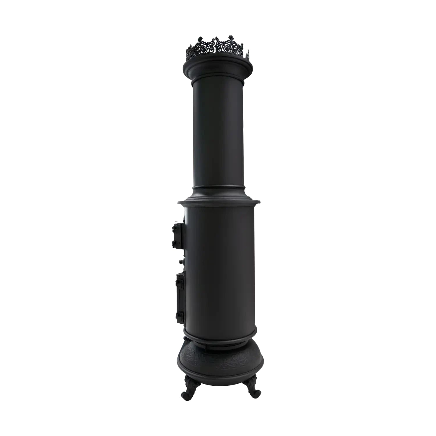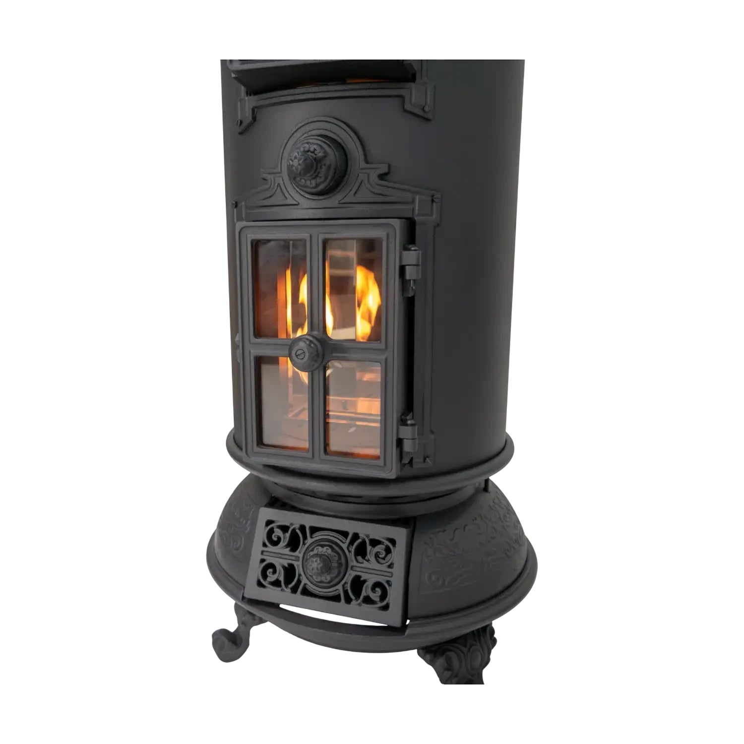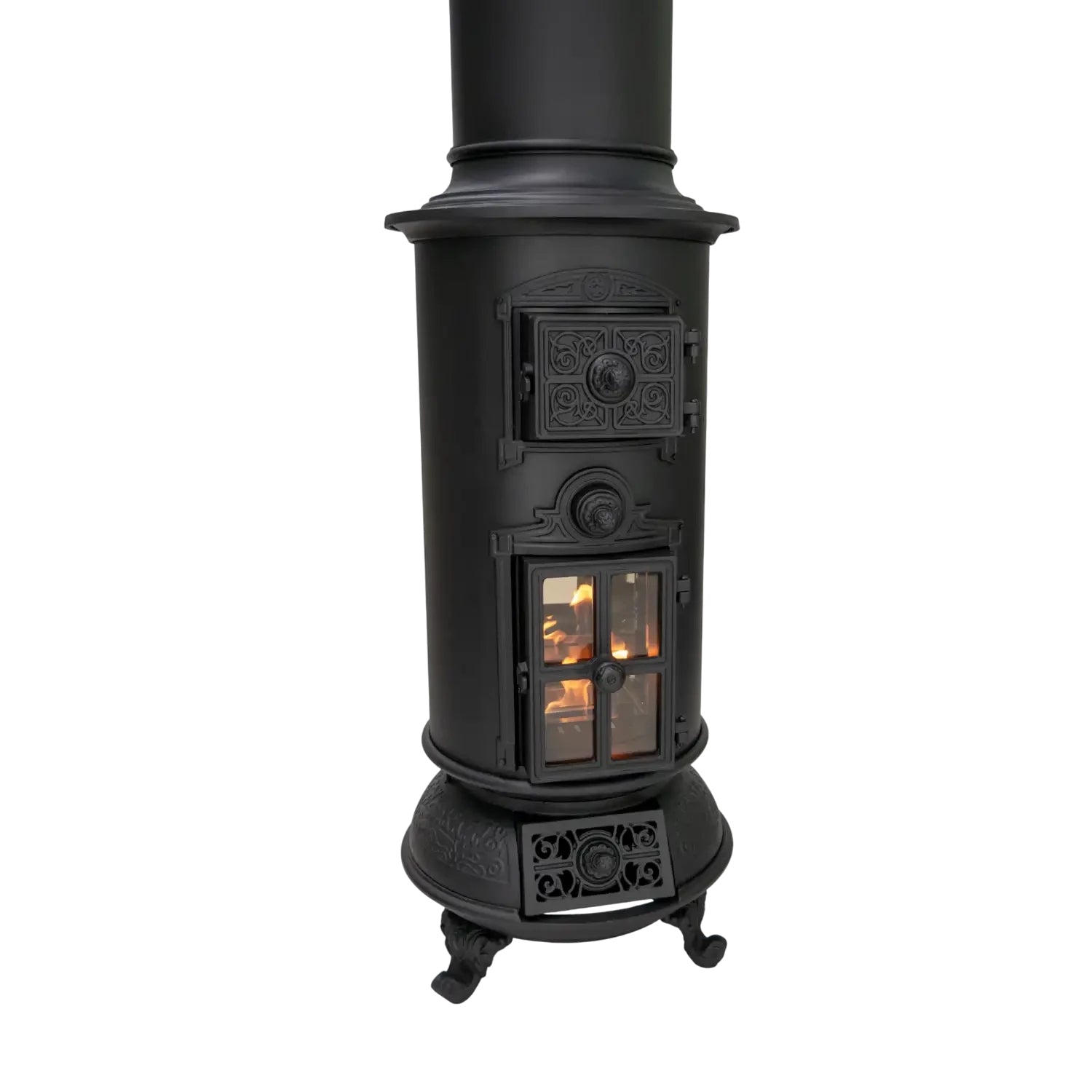 Geniet van de klassieke uitstraling van een authentieke gietijzeren houtkachel, ideaal voor een warm en sfeervol interieur. De sierstukken op de kachel maken het geheel een robuust en karakteristiek pronkstuk.