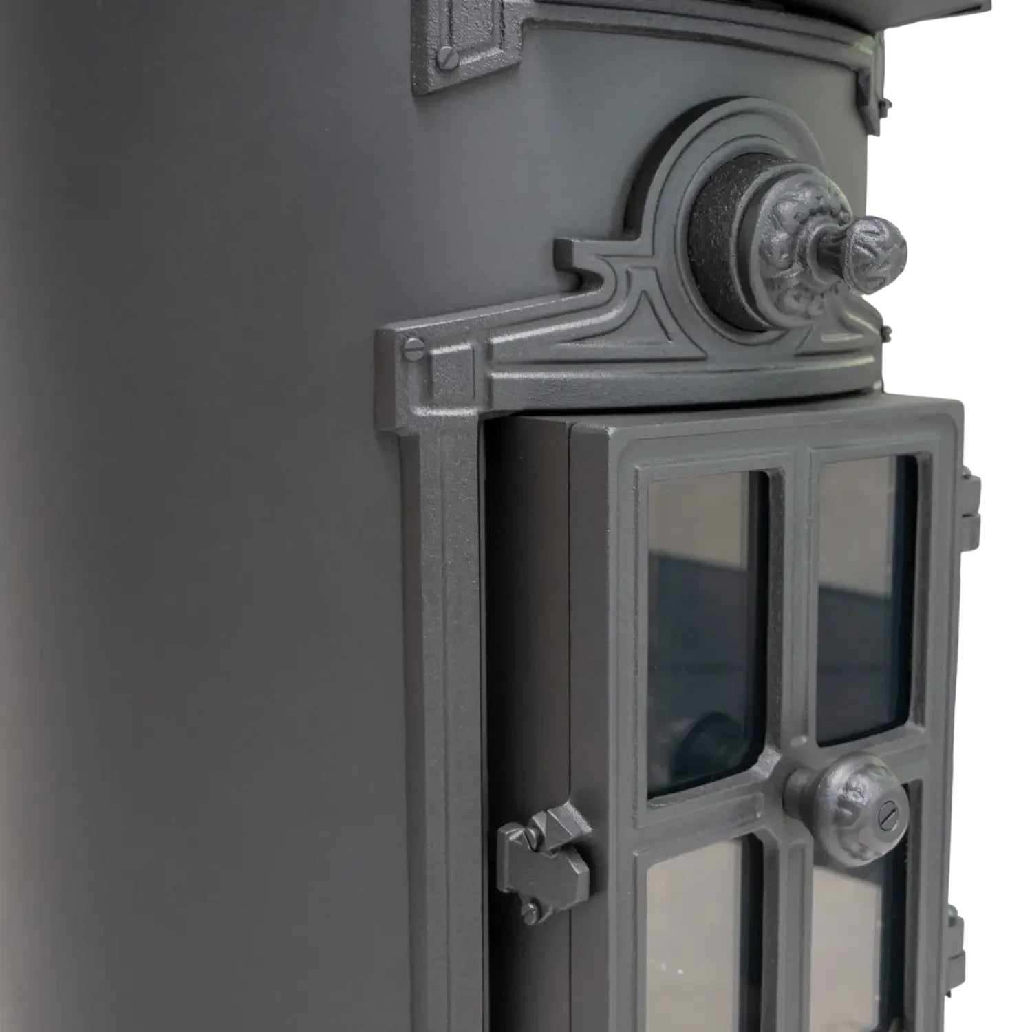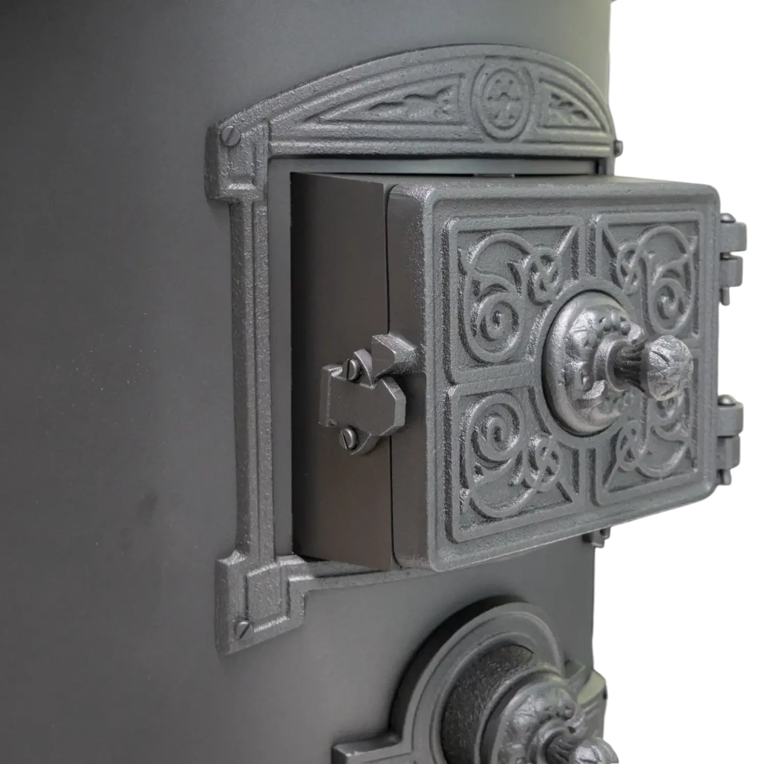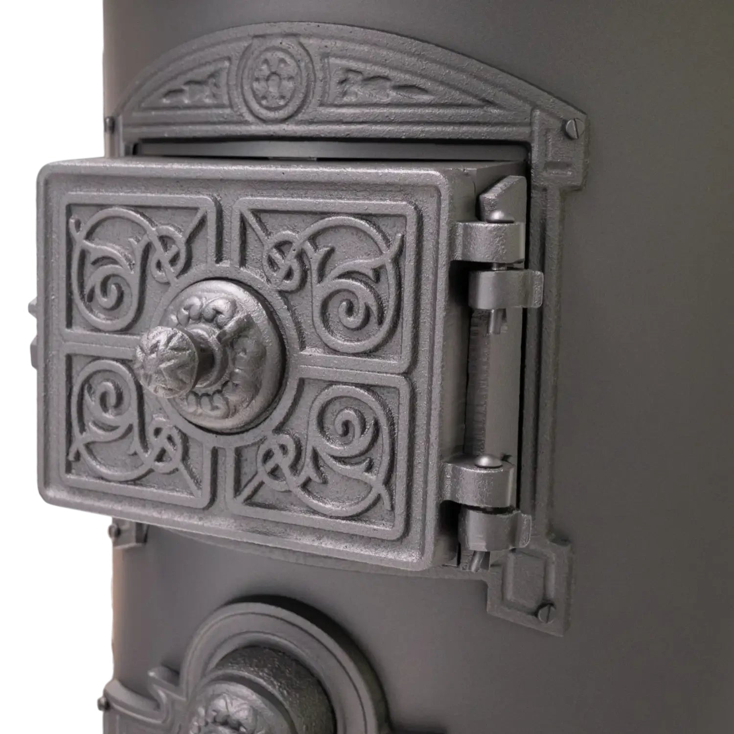 Geniet van de klassieke uitstraling van een authentieke gietijzeren houtkachel, ideaal voor een warm en sfeervol interieur. De sierstukken op de kachel maken het geheel een robuust en karakteristiek pronkstuk.