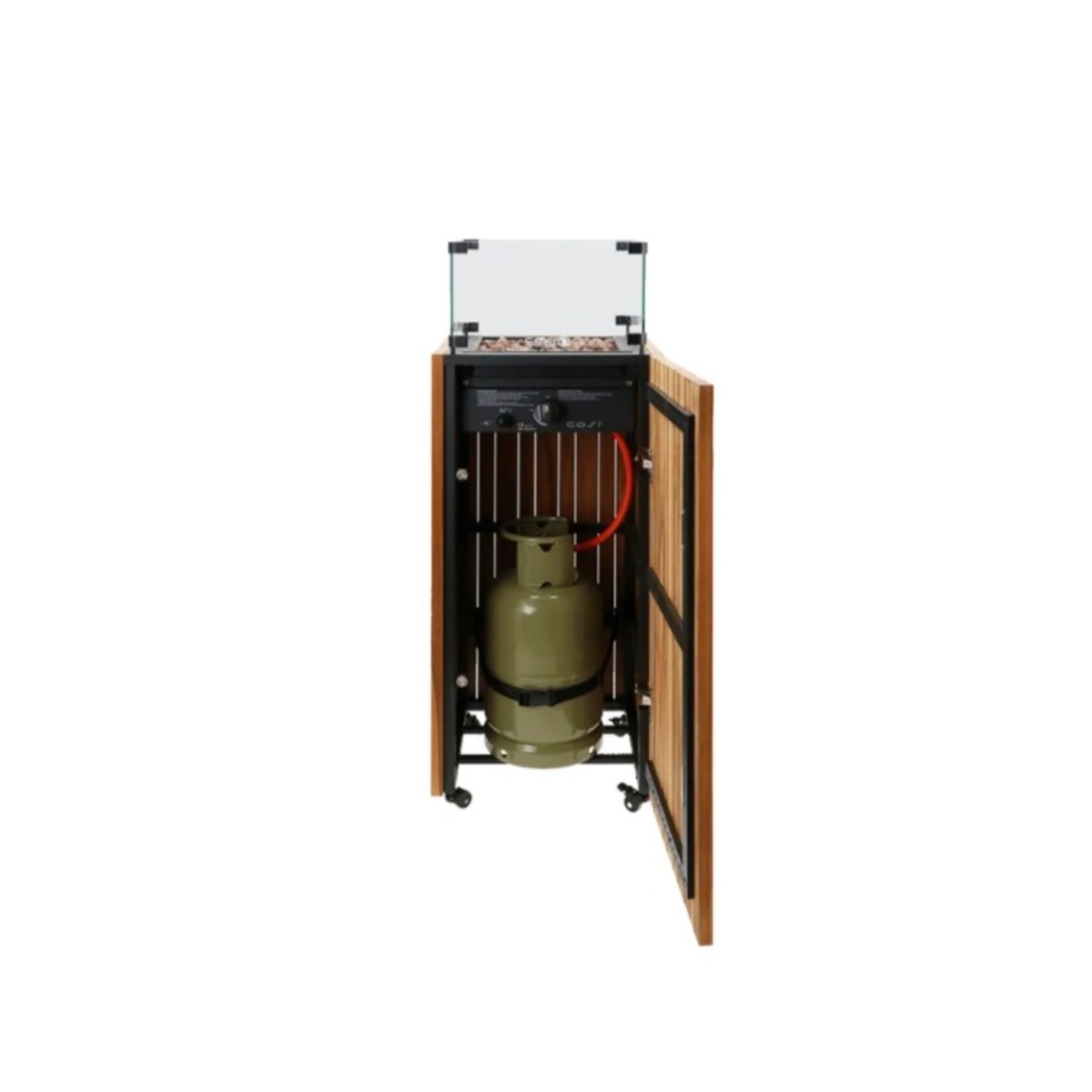 De Cosipillar is niet alleen een blikvanger, maar ook zeer praktisch. Onder de haard is ruimte voor een standaard 5 kg gasfles, waarmee u tot 16 uur van het vuur kunt genieten. Dankzij de handige wieltjes verplaatst u de haard moeiteloos naar de plek waar u hem op dat moment wilt gebruiken.