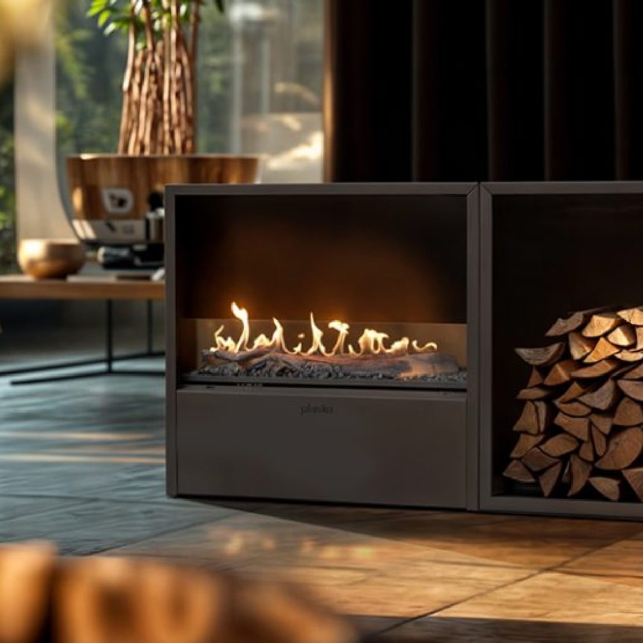 Voeg extra sfeer toe met de optionele decoratieve houtbox. Hiermee combineert u de moderne uitstraling van de haard met een klassiek, landelijk accent – perfect voor wie houdt van warmte én karakter in huis.