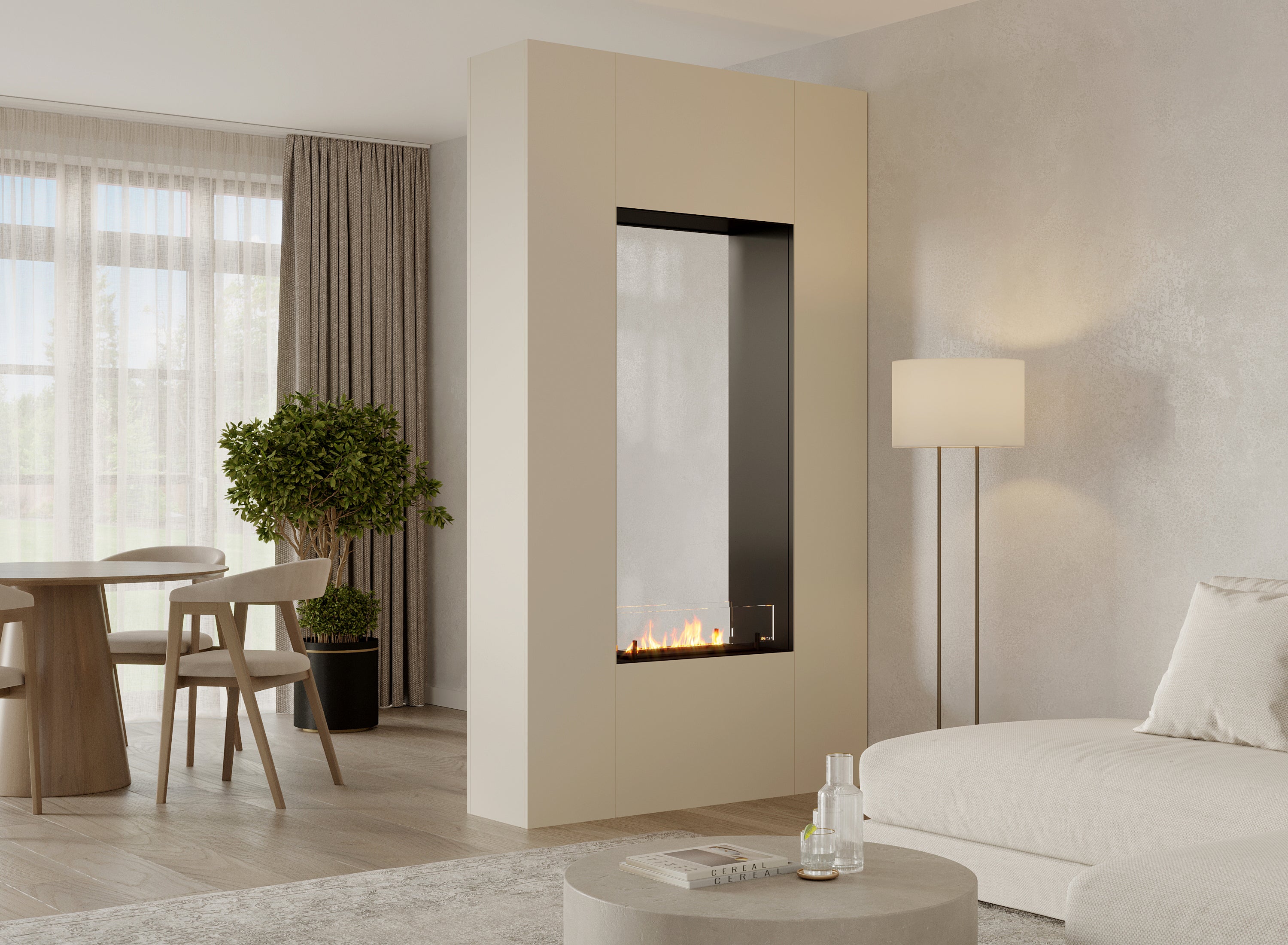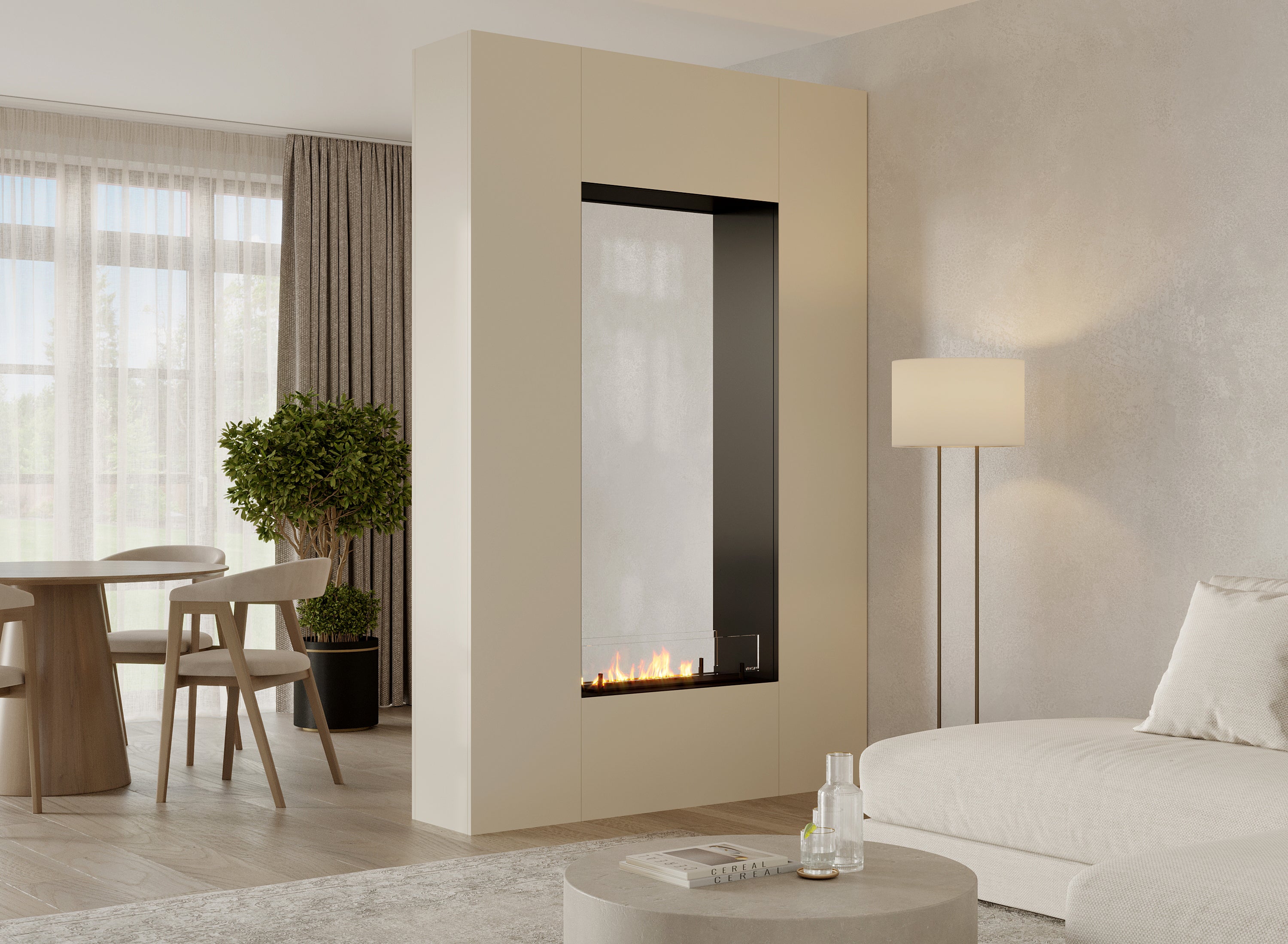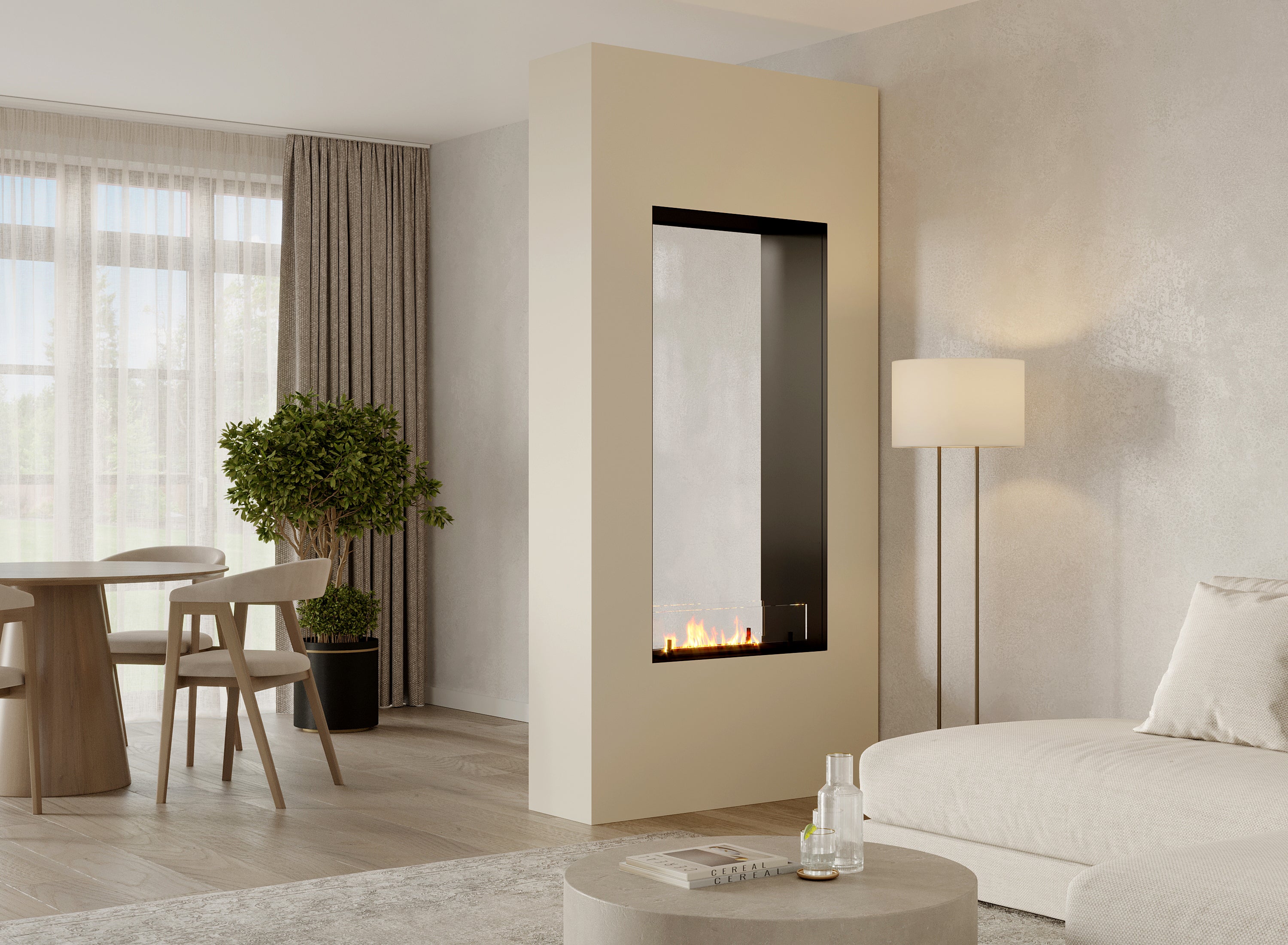 Creëer een slanke en stijlvolle afscheiding met een verticale roomdivider met centrale haardinzet. Het minimalistische, ingetogen ontwerp geeft uw interieur een rustige doch krachtige uitstraling.