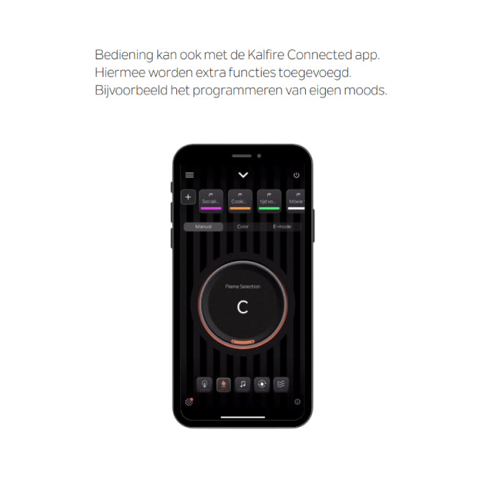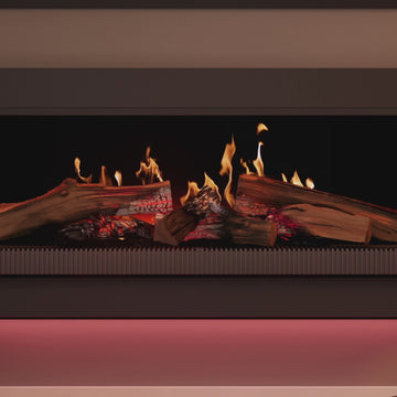 De E-series is standaard uitgerust met ledverlichting die de stammen in de haard sfeervol verlicht. Deze sfeerverlichting in de haard koppel je eenvoudig aan de (optionele) ledstrips die je aan de buitenzijde van de Media Wall of onderzijde van het Design Frame kunt toevoegen. Hiermee verlicht je het gebied rondom je haard en voeg je een nieuwe dimensie toe aan de haard. De verlichting wordt bediend vanaf de afstandsbediening of via de KalfireConnected app van de haard.Gloedbed en gloeiende stammen