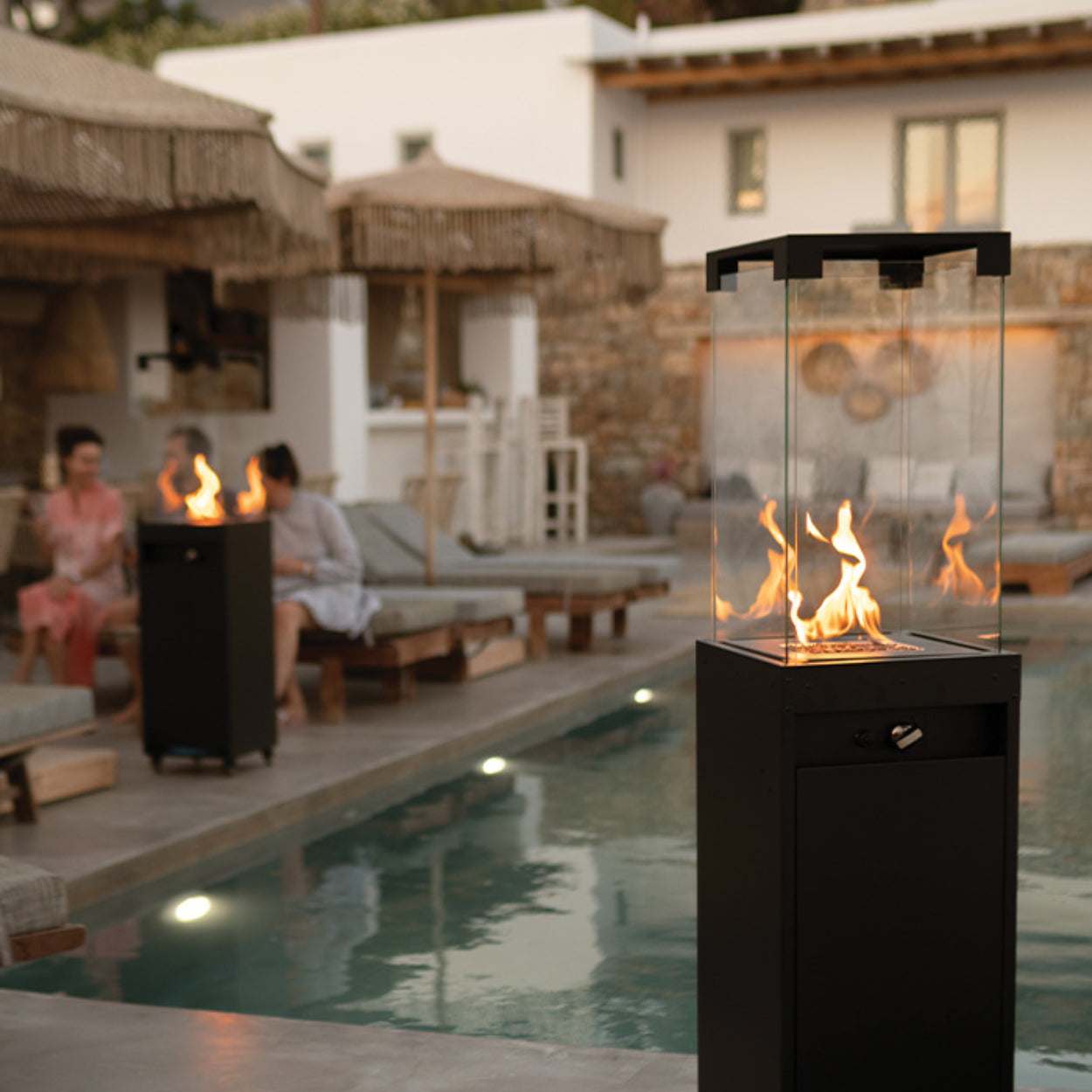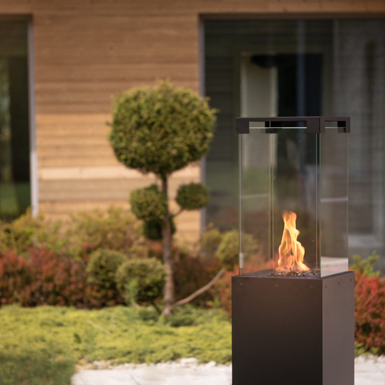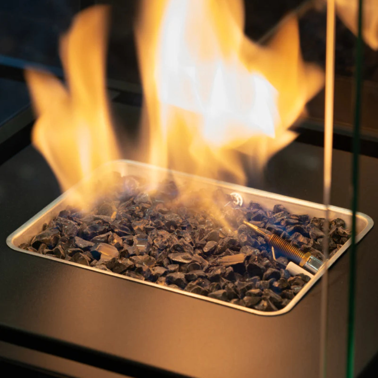 Met zijn transparante glaspanelen en zwarte glazen kiezels biedt Faro een spectaculair 360° zicht op het vlammenspel. Dit maakt hem niet alleen functioneel, maar ook een stijlvolle blikvanger voor elke buitenruimte.