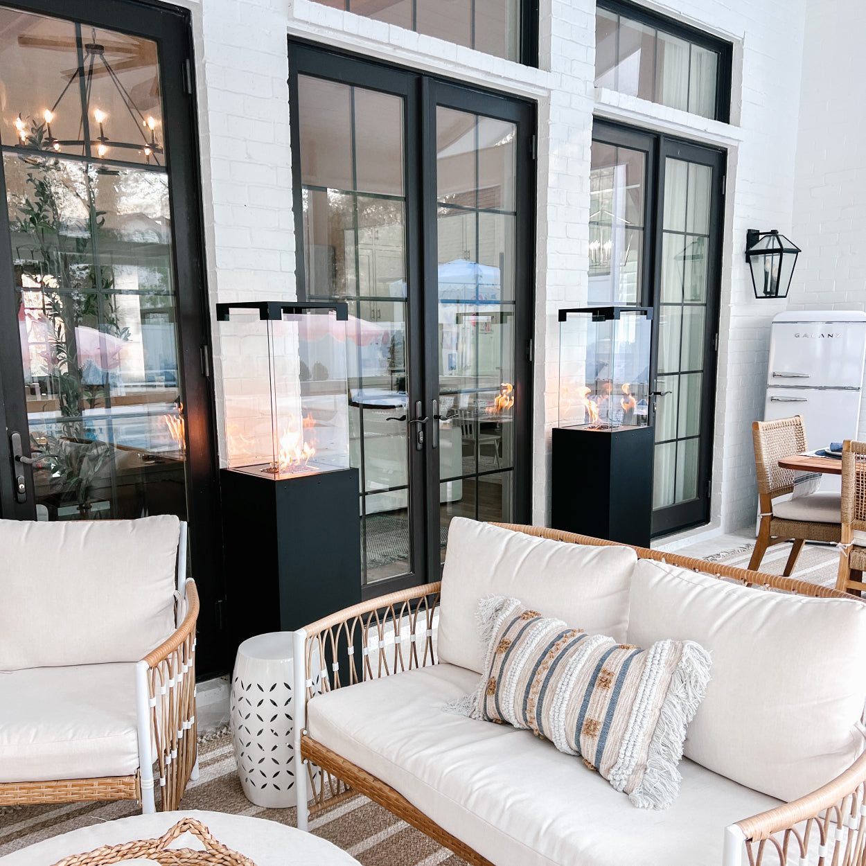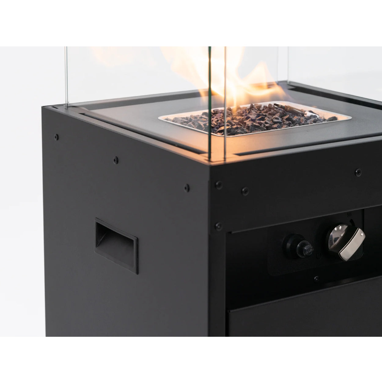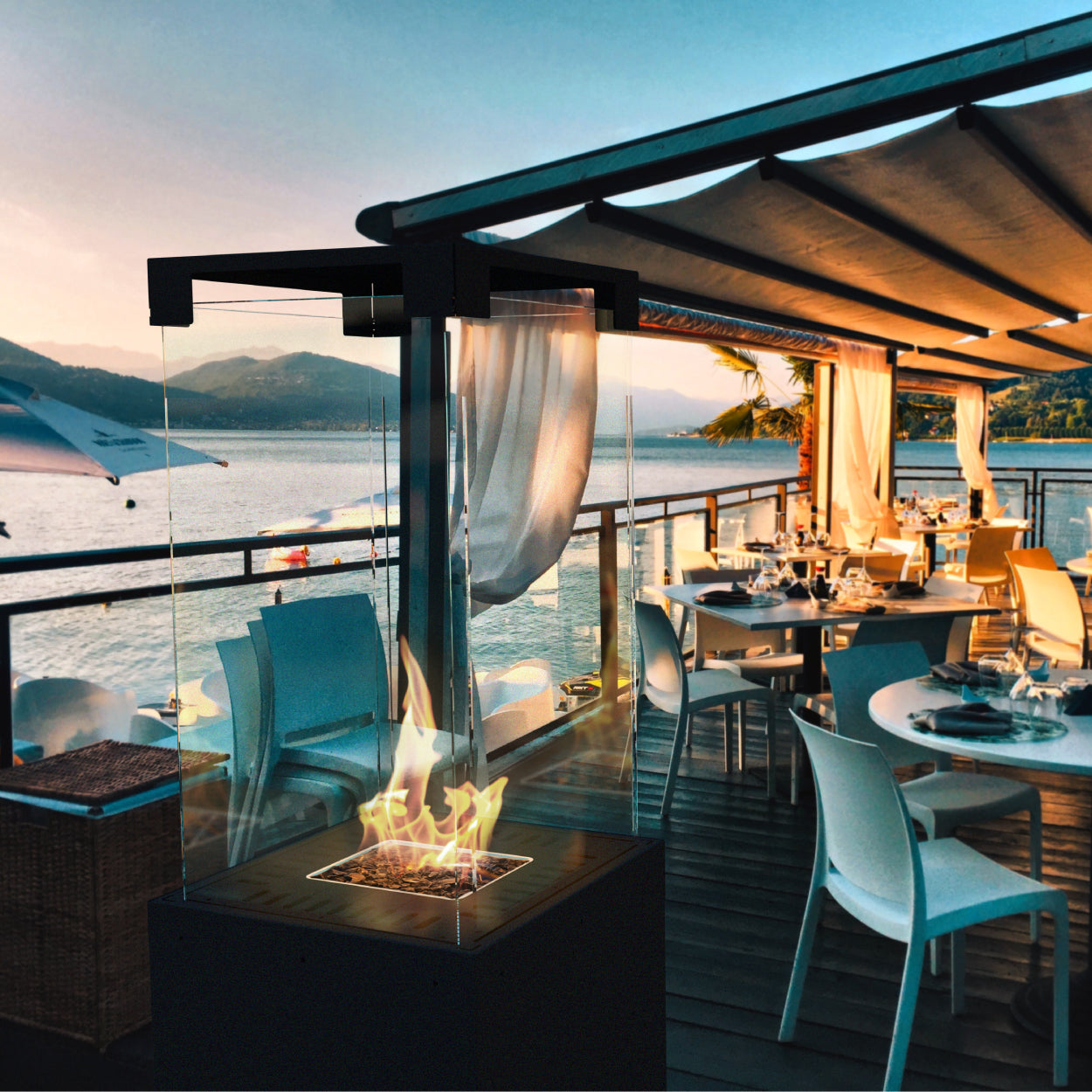 Met zijn transparante glaspanelen en zwarte glazen kiezels biedt Faro een spectaculair 360° zicht op het vlammenspel. Dit maakt hem niet alleen functioneel, maar ook een stijlvolle blikvanger voor elke buitenruimte.