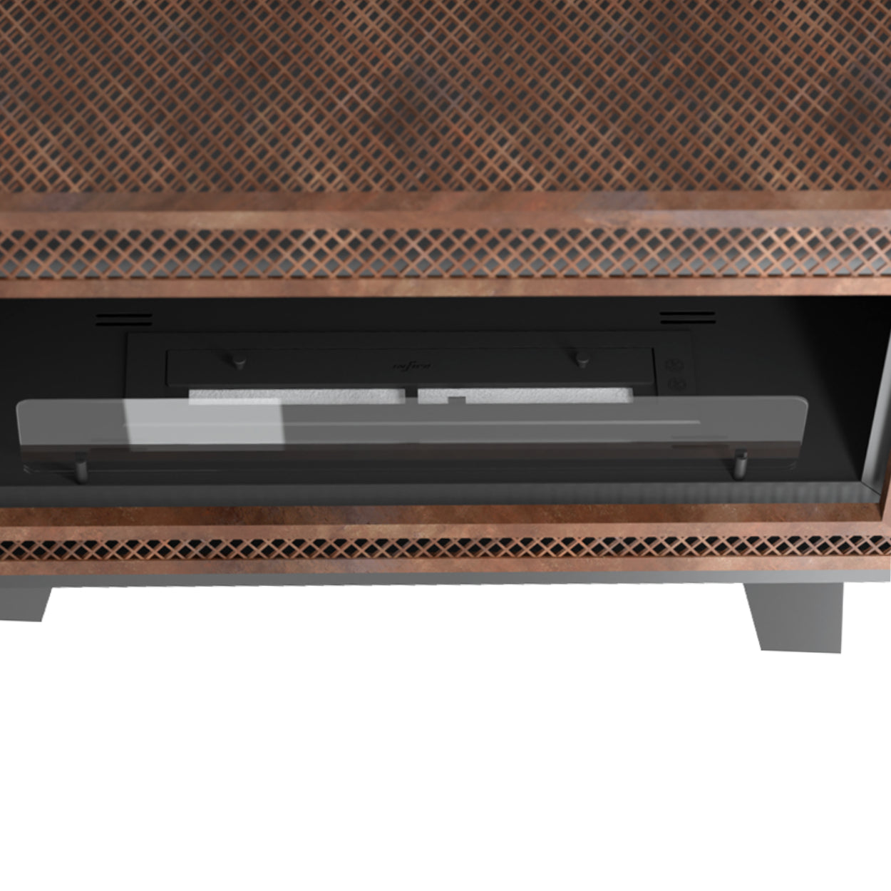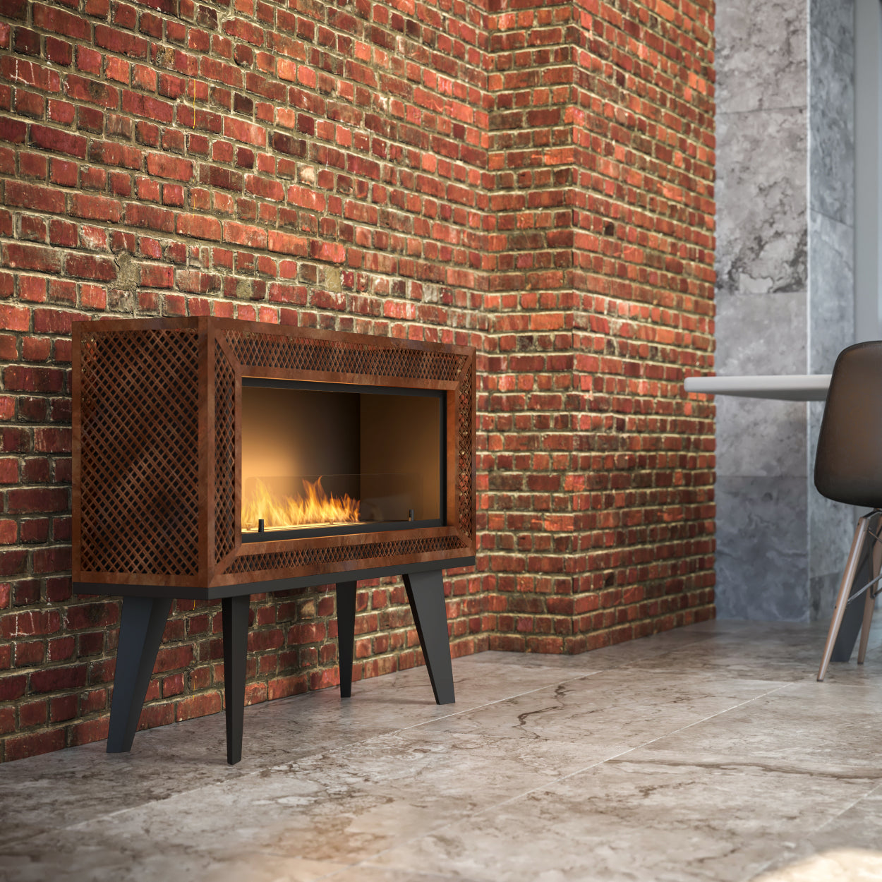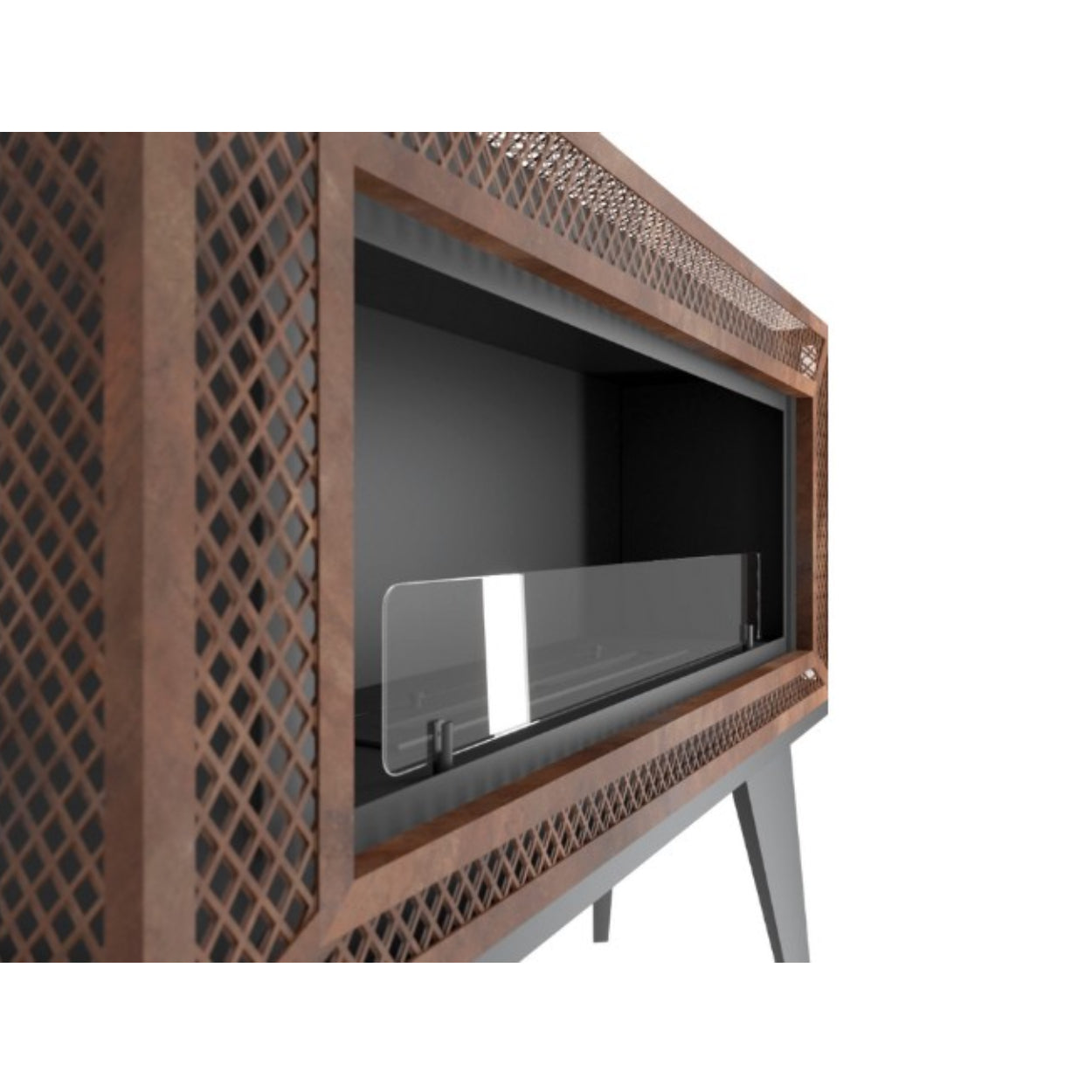 Wat deze haard direct onderscheidt, zijn de karakteristieke houten poten in PRL-stijl en het roestkleurige gaas dat op natuurlijke wijze verouderd oogt. Deze combinatie geeft de haard een robuuste, maar stijlvolle uitstraling. Dankzij de gepolijste afwerking rondom is de haard niet alleen geschikt tegen een muur, maar juist ook als vrijstaand middelpunt in de ruimte.