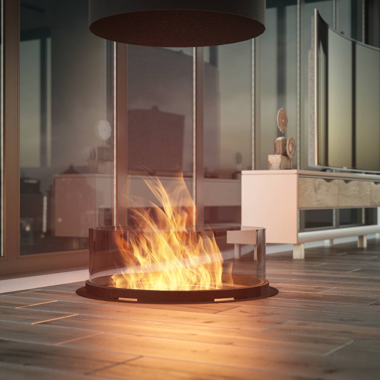 De Inround is niet zomaar een haard, maar een designstatement dat van bovenaf de ruimte transformeert. Door zijn centrale ophanging en volledig zichtbare vlammenspel wordt hij het kloppend hart van uw woonkamer, loft of open ruimte. Een echte blikvanger die luxe en warmte samenbrengt – zonder schoorsteen of gedoe.