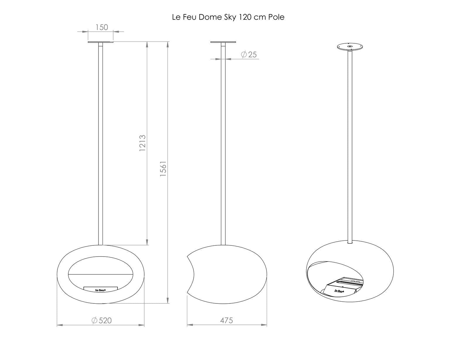 De Sky hangt u eenvoudig op aan het plafond. Wij adviseren een ophanghoogte van 60 cm vanaf de vloer; de koepel zelf is 30 cm hoog. De standaard meegeleverde ophangstang is 120 cm lang, met extra verlengstukken beschikbaar voor uw ideale hoogte. Binnen 5 minuten hangt uw Le Feu Sky dankzij de handige installatievideo die wij voor u klaarzetten.
