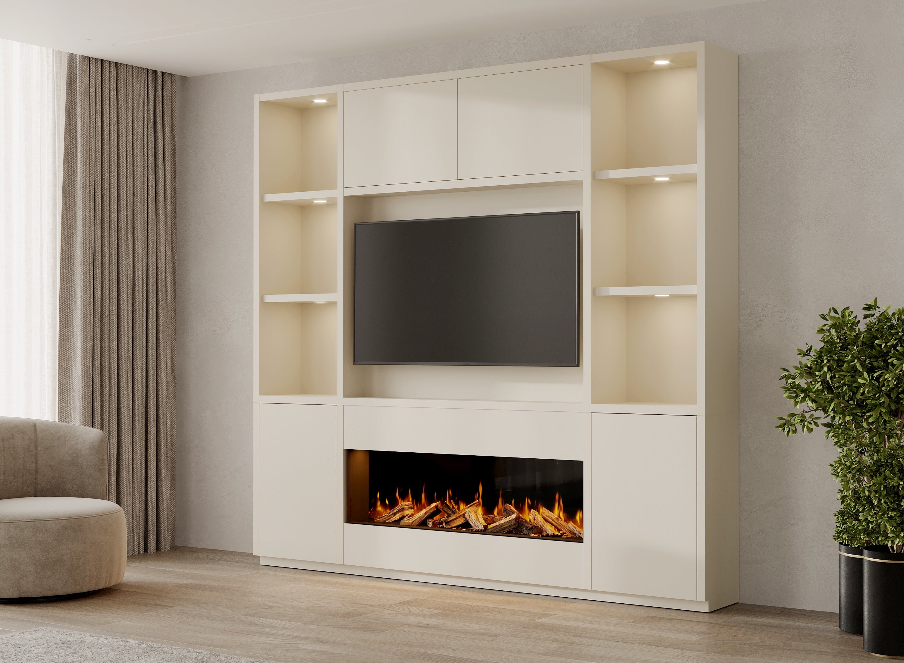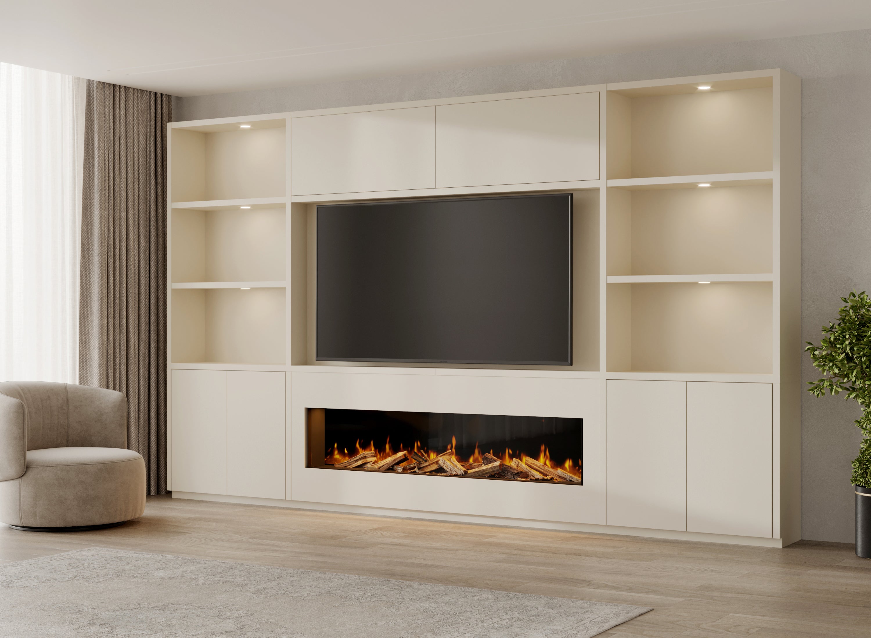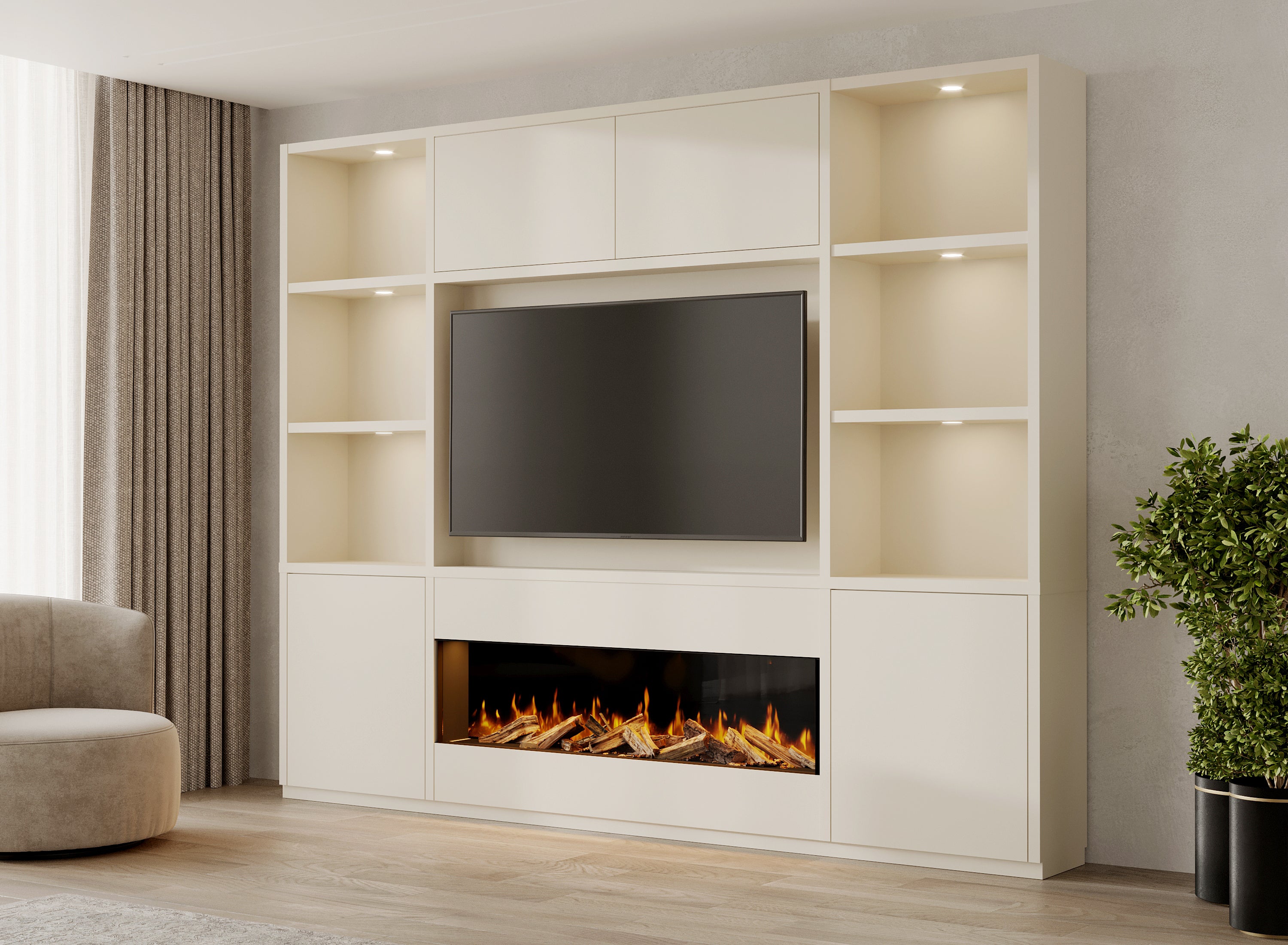 Het meubel wordt geleverd zonder haard, zodat u zelf een elektrische of bio-ethanolhaard kunt kiezen. De juiste inbouwmaten zijn al voorbereid ongeacht welke haard u kiest. Dit geeft u de vrijheid om uw favoriete model en uitstraling te kiezen.