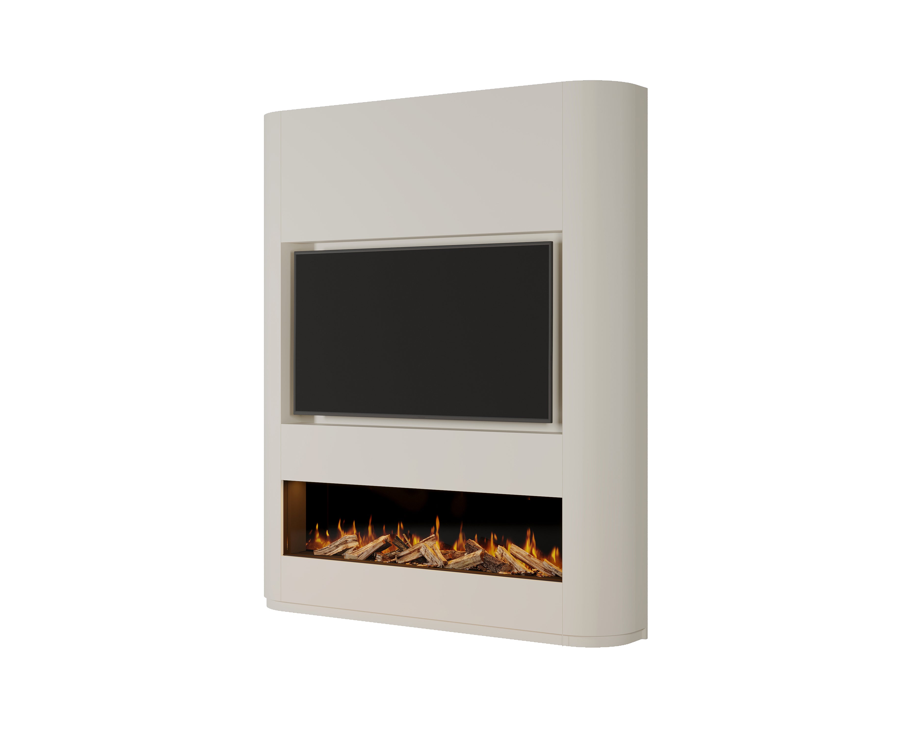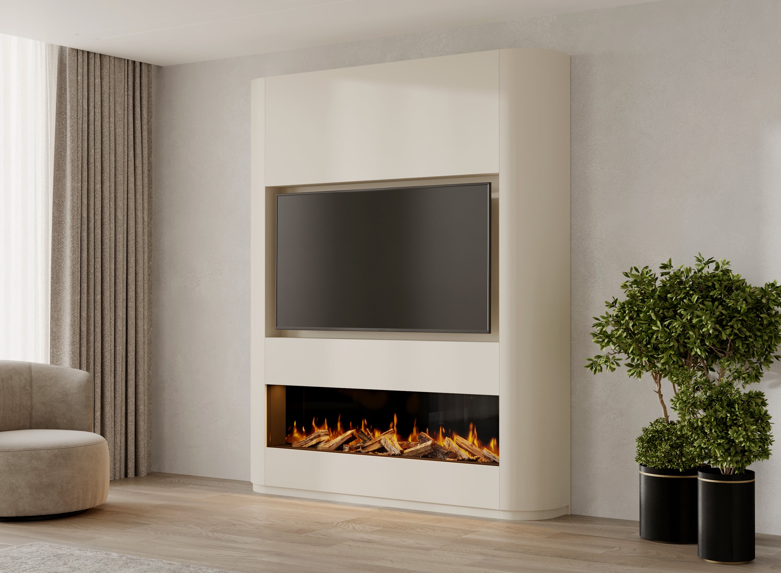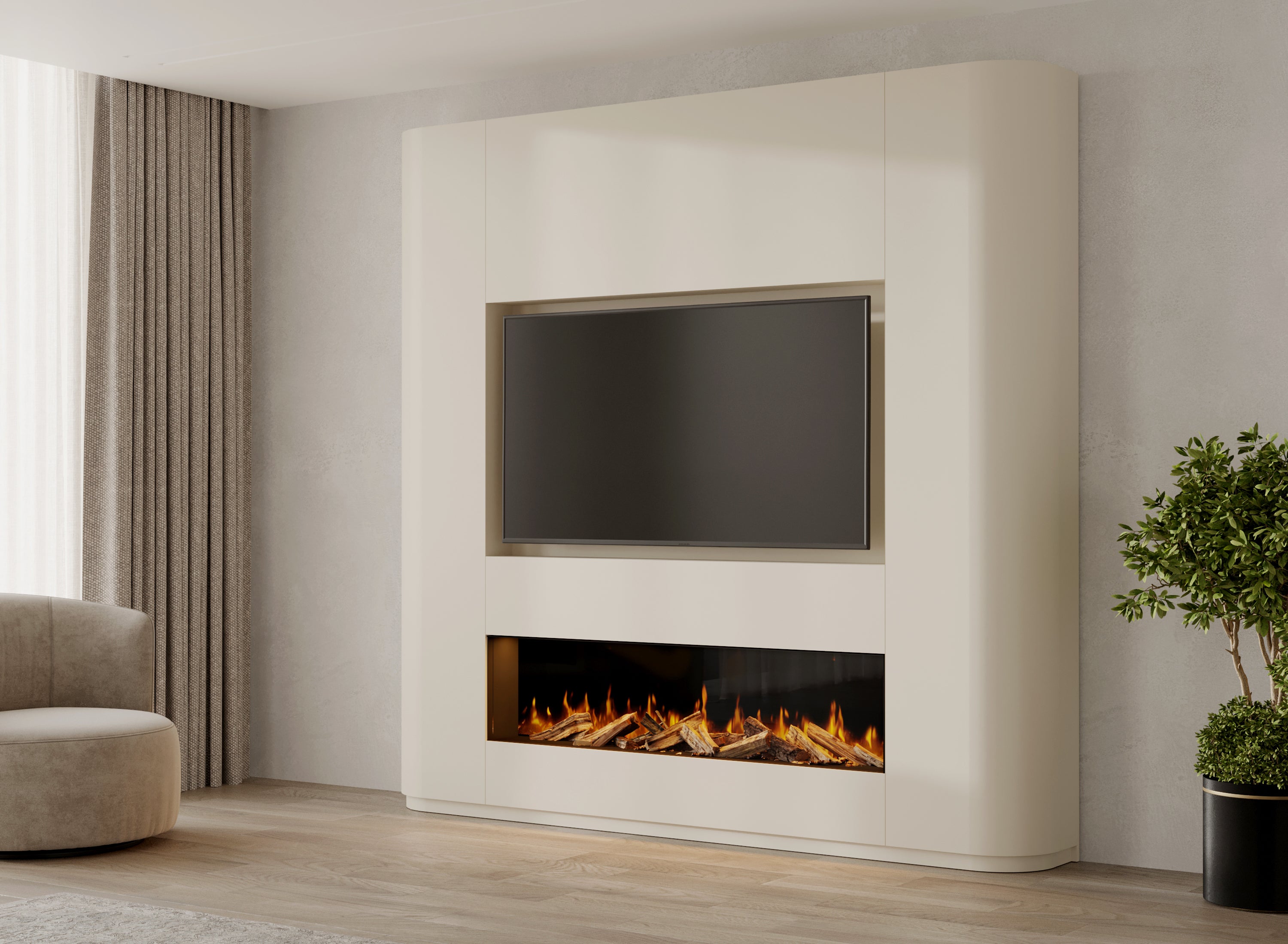 Kies voor stijl en comfort met deze wandopstelling, waarin afgeronde vormen, een brede haard en strakke lijnen perfect samenkomen. De combinatie van moderne materialen, rustige kleuren en een centrale haard zorgt voor een gebalanceerd en sfeervol geheel. Ideaal als blikvanger in een open of strak ingerichte ruimte.