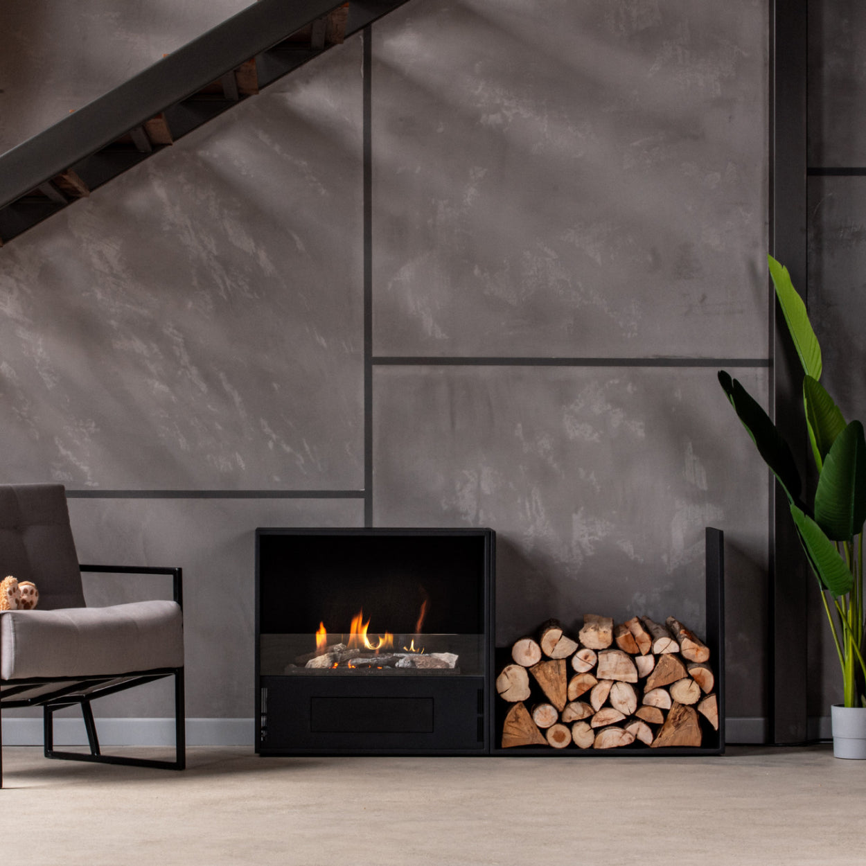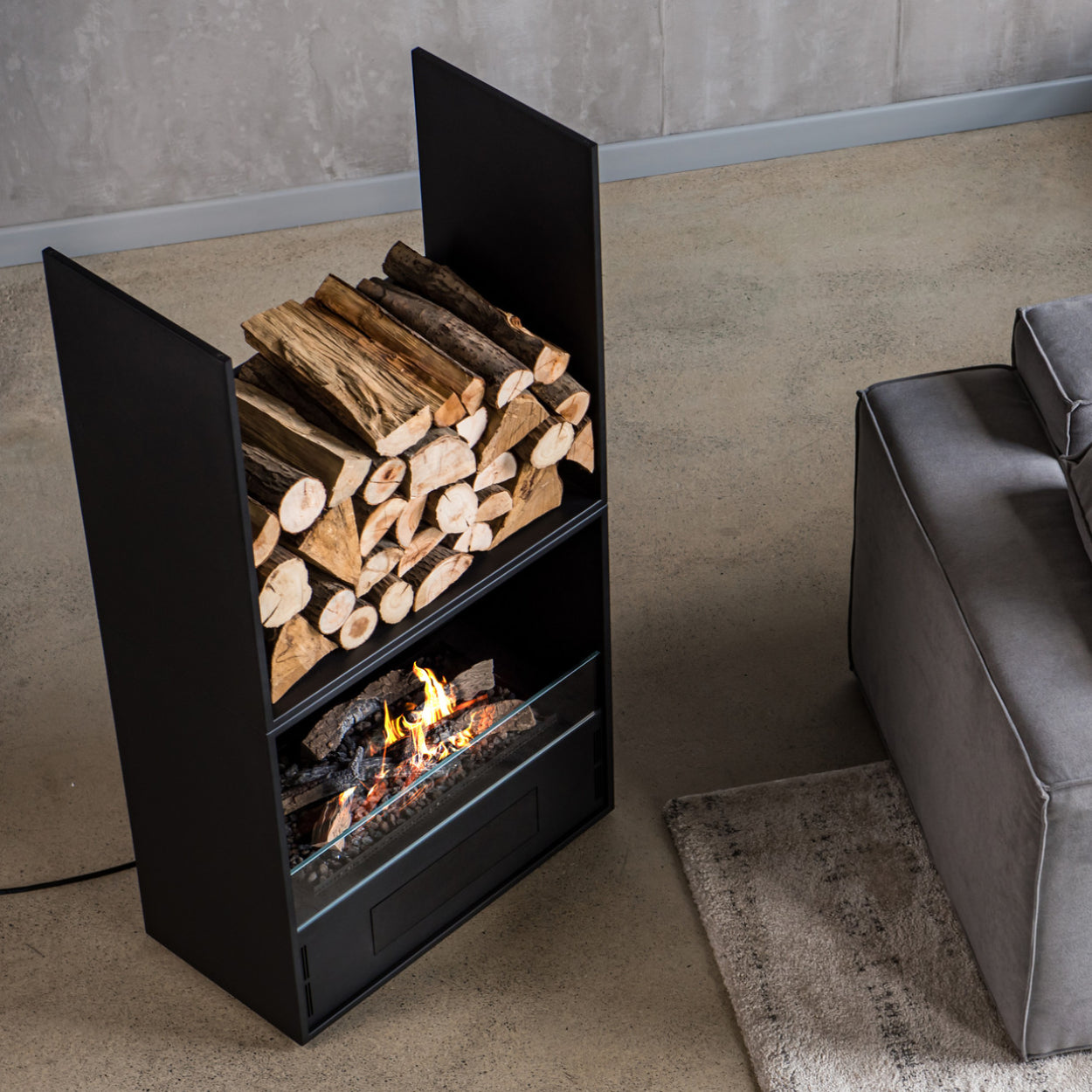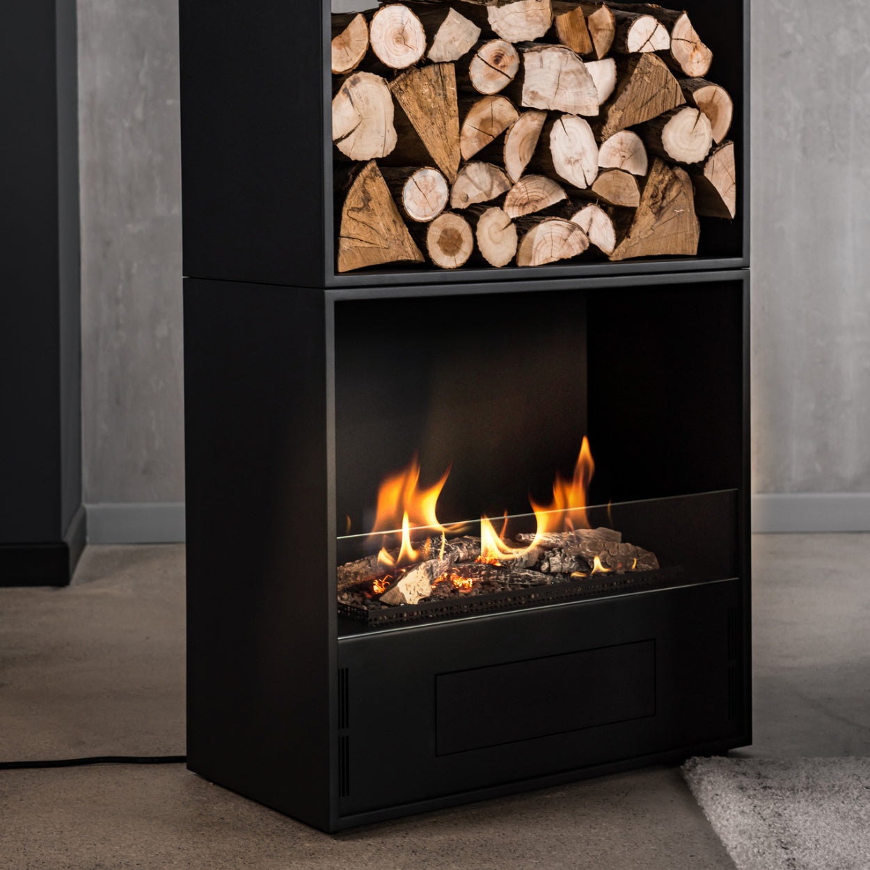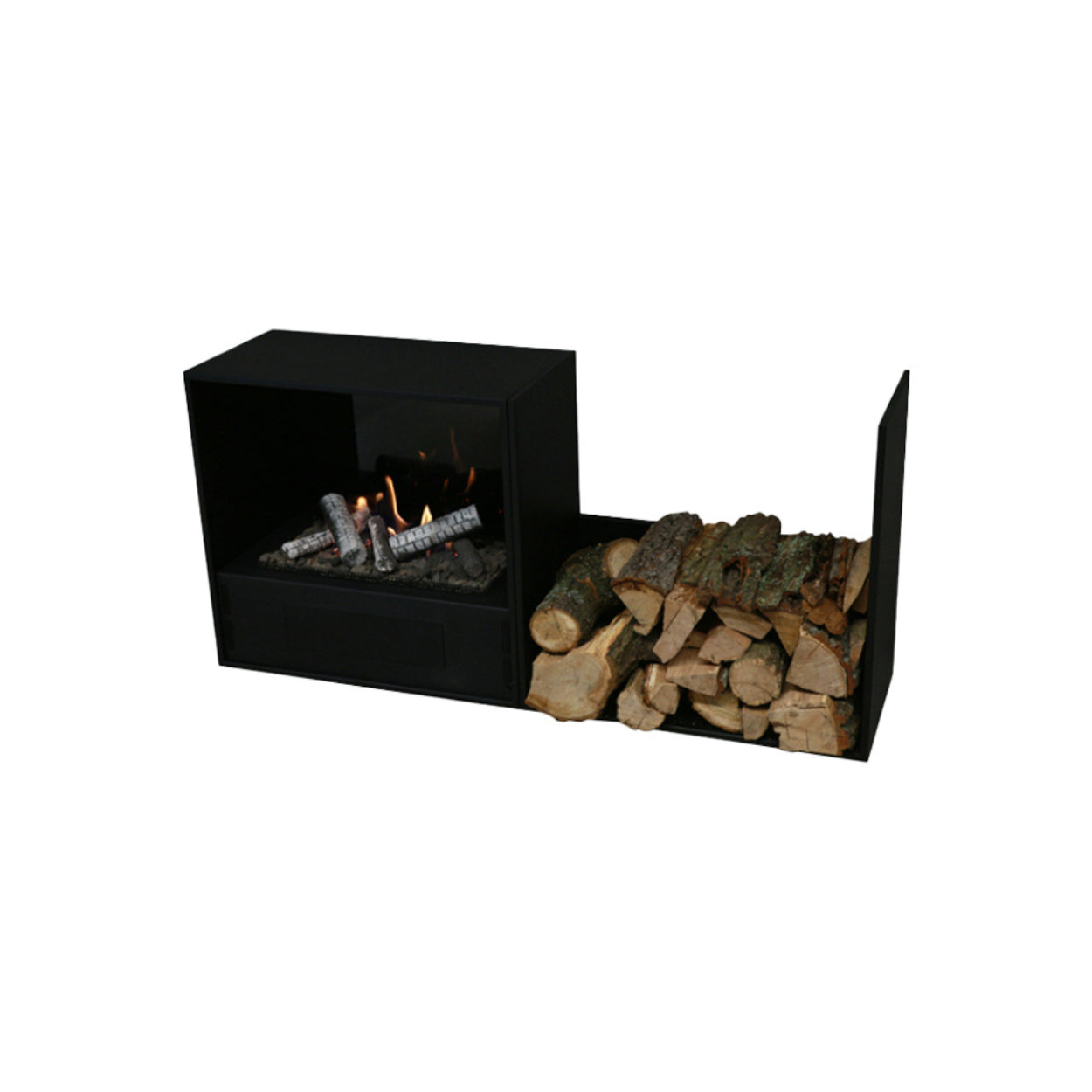 - Strak design: met een elegant zwart stalen frame en een sfeervol vuurbed met stenen, flikkerende kolen en keramische houtstammen.