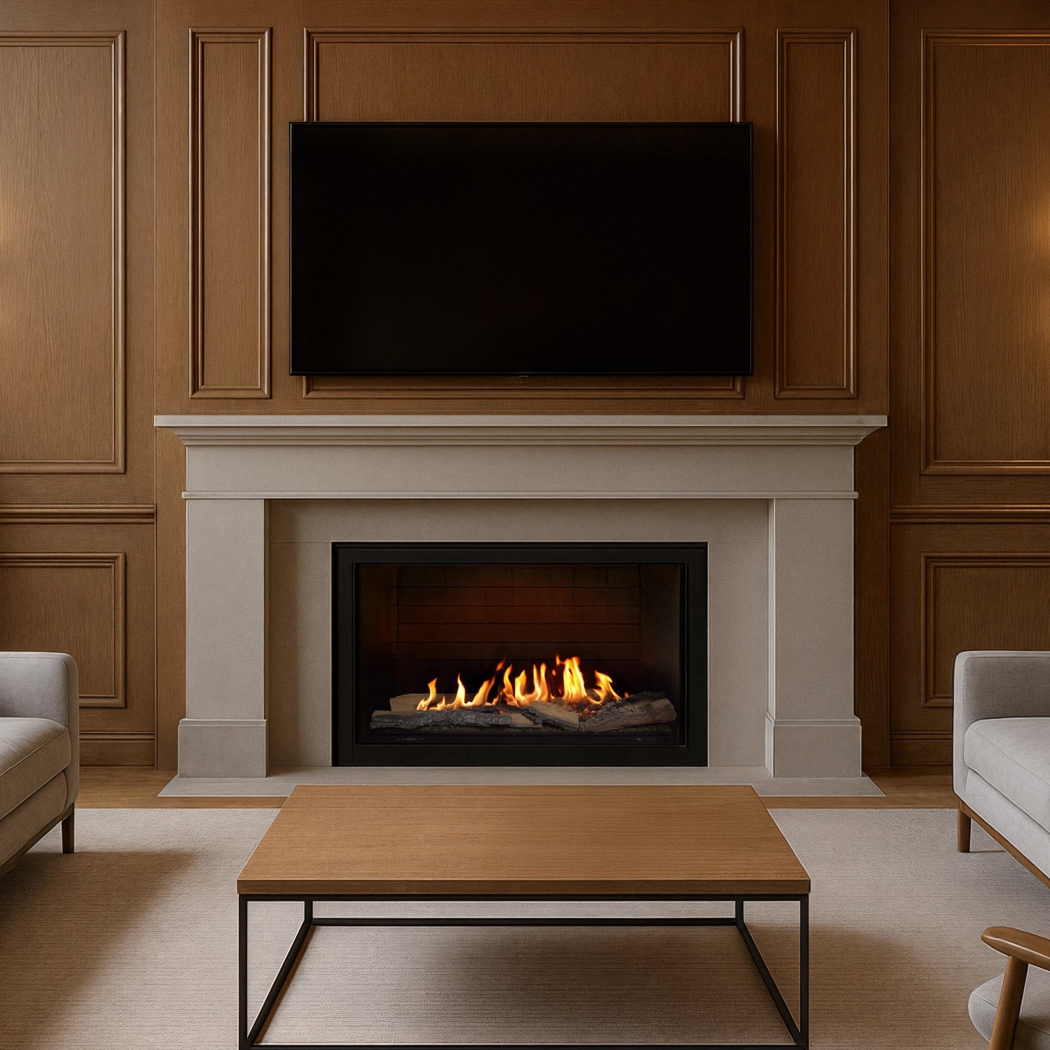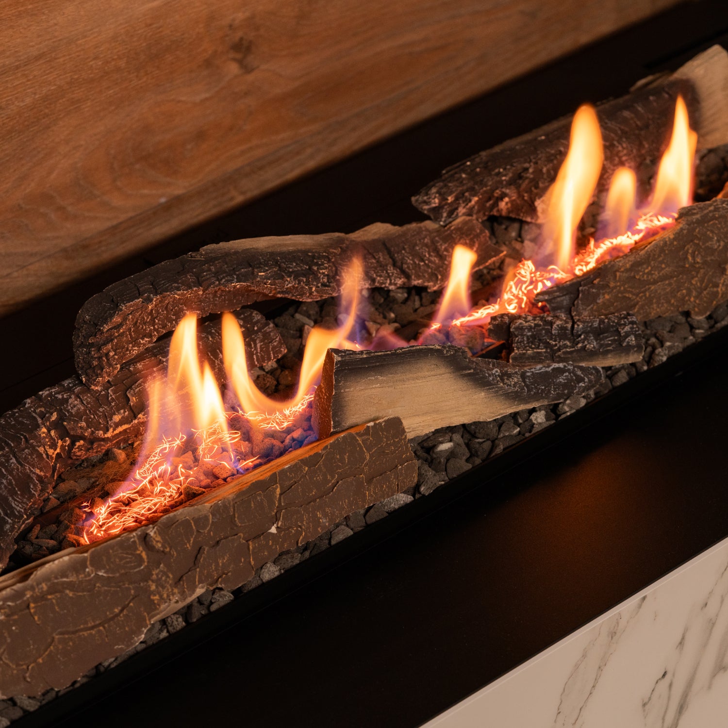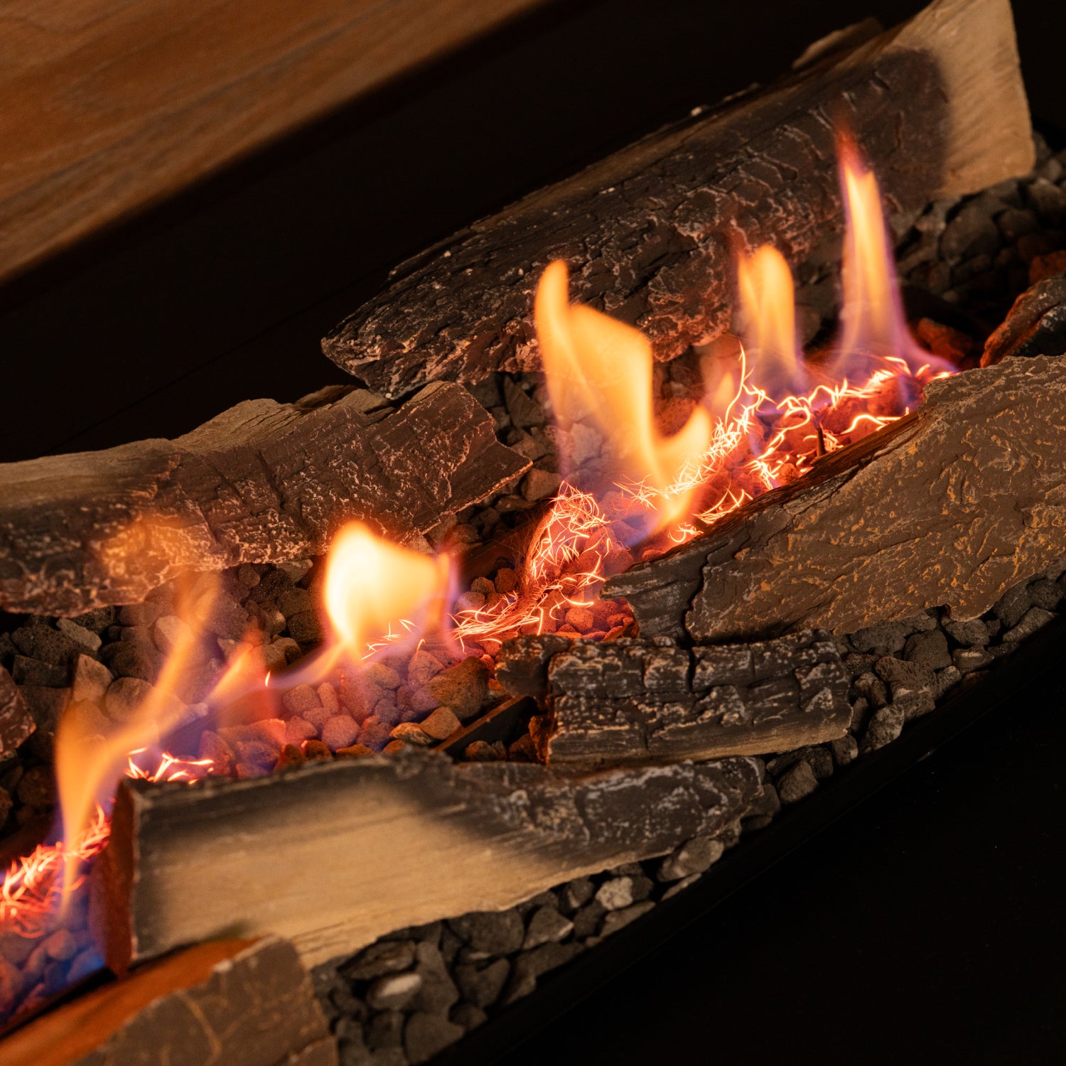 U kunt uw haard verder verfraaien met optionele decoratieve houtblokken, die warmte en elegantie toevoegen aan elk interieur. Dit is standaard inbegrepen.