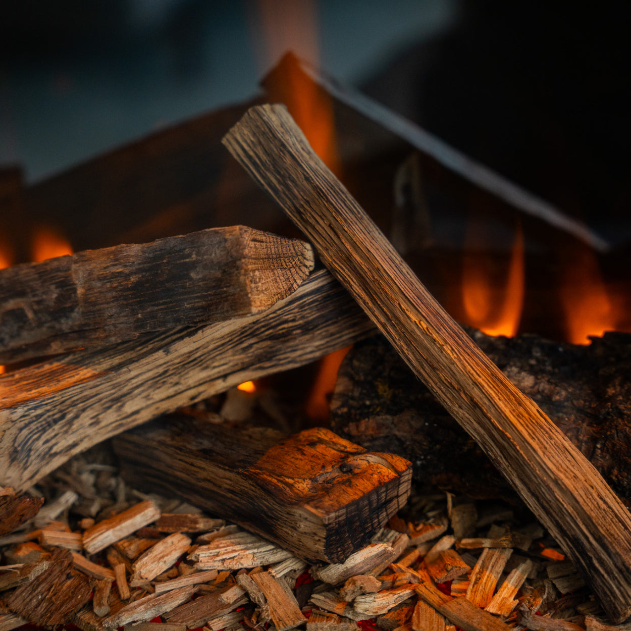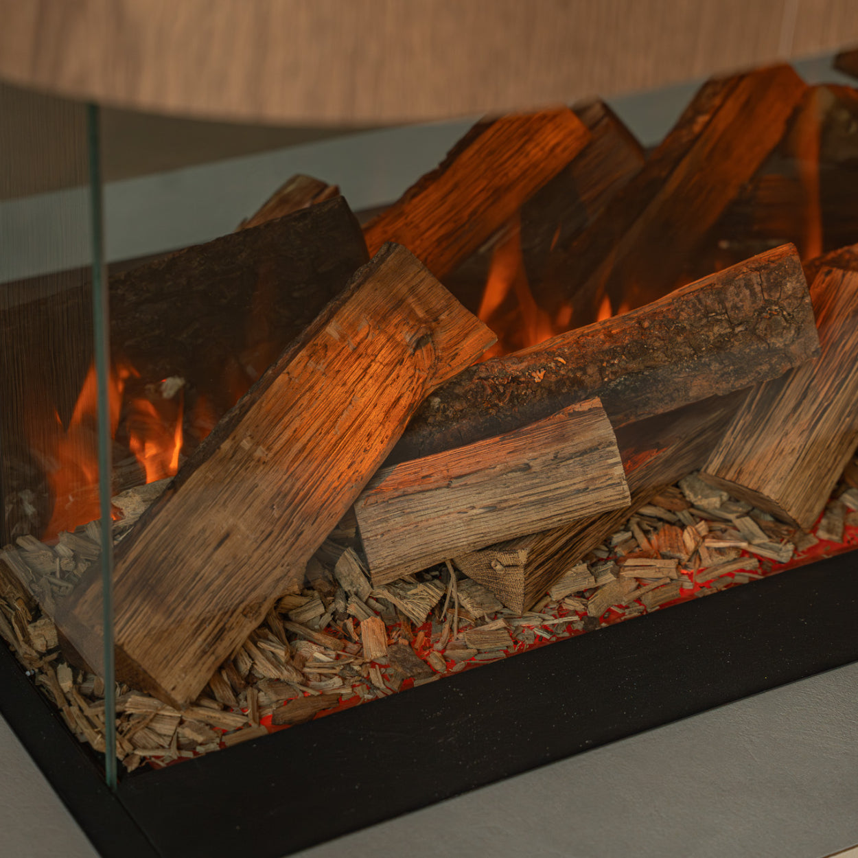 De haard wordt standaard geleverd met Real Logs: handgemaakte, echte houtblokken op een gloeiende ondergrond van houtsnippers en houtskool. Dit zorgt voor een ongeëvenaarde realistische uitstraling, alsof u naar een echte open haard kijkt. Voor extra authenticiteit zijn de Premium Rustic Logs als optionele upgrade beschikbaar, met robuuste, rustieke houtblokken in een kampvuurstijl.
