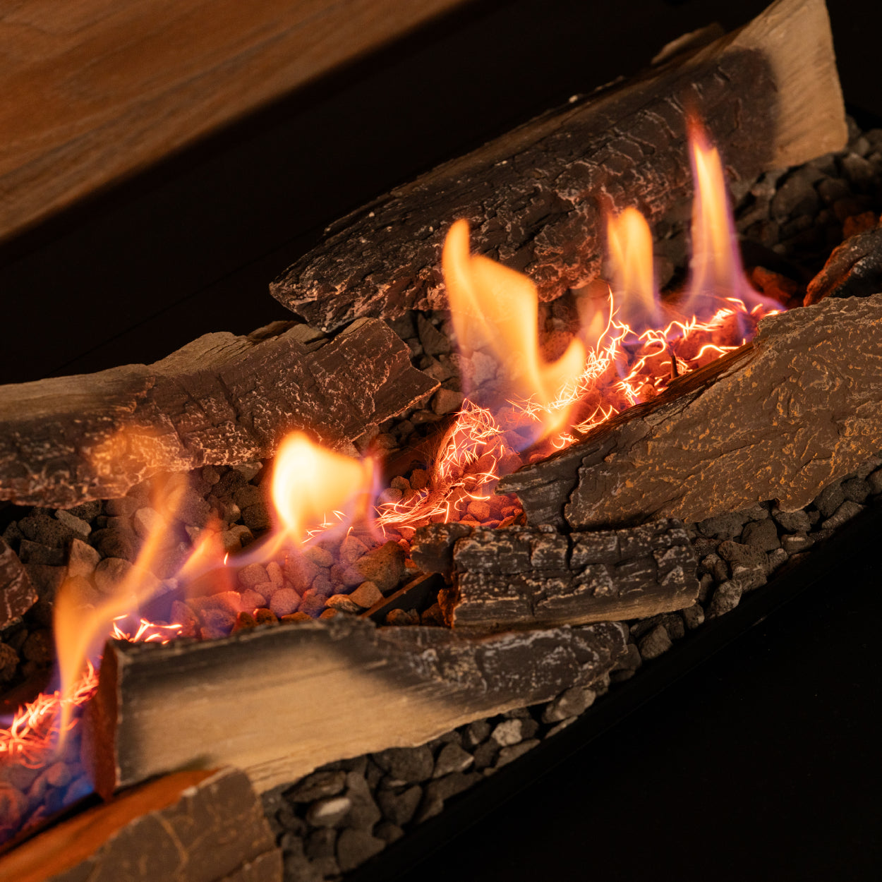 De vlam ontstaat uit ethanol­damp in plaats van vloeibare brandstof. Dat betekent geen contact met open vloeistof, geen rook, roet of geur – maar wél een echte vlam.