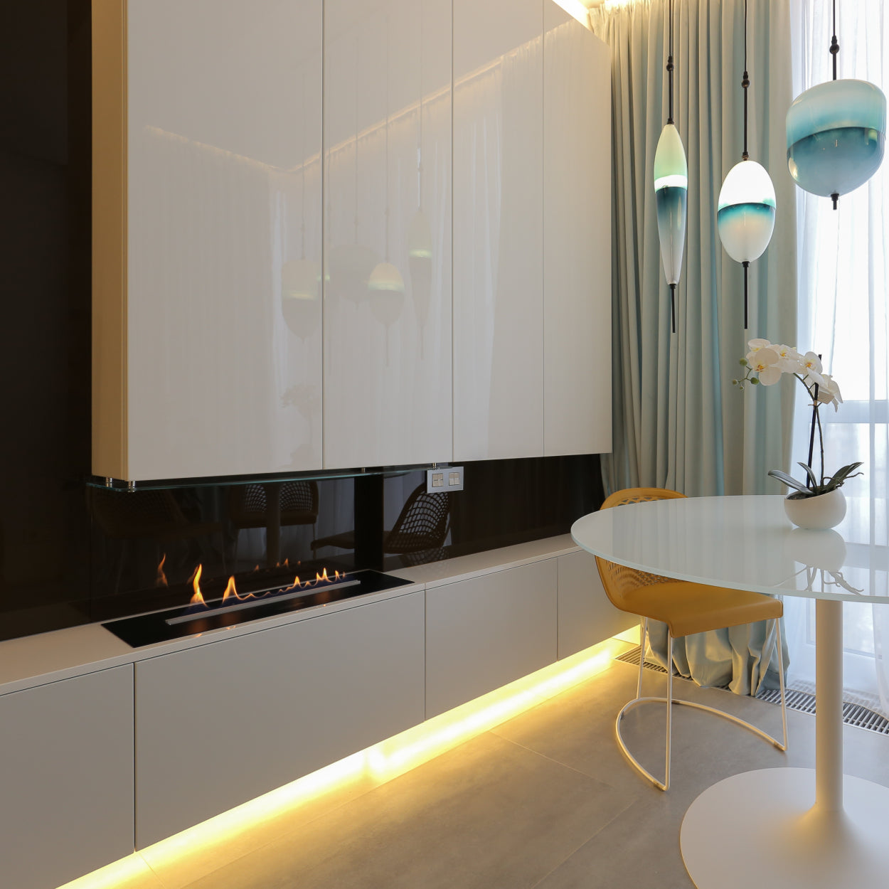 U bepaalt de sfeer met één druk op de knop – via de geïntegreerde touch-bedieningsstrip, de elegante remote, of de app op uw smartphone. Koppelt u de haard aan uw domoticasysteem, dan past hij automatisch het vlamniveau aan uw leefritme aan (optioneel).