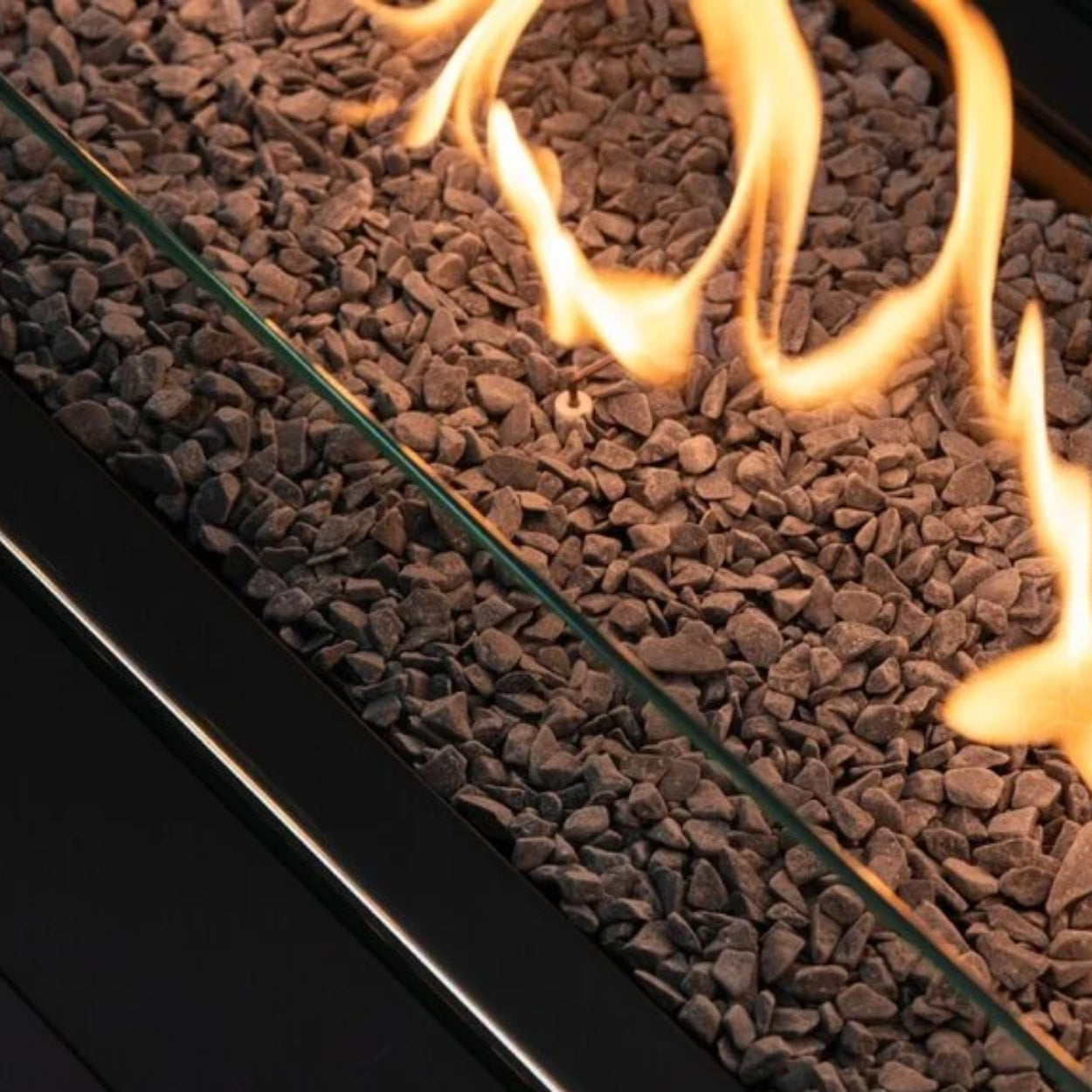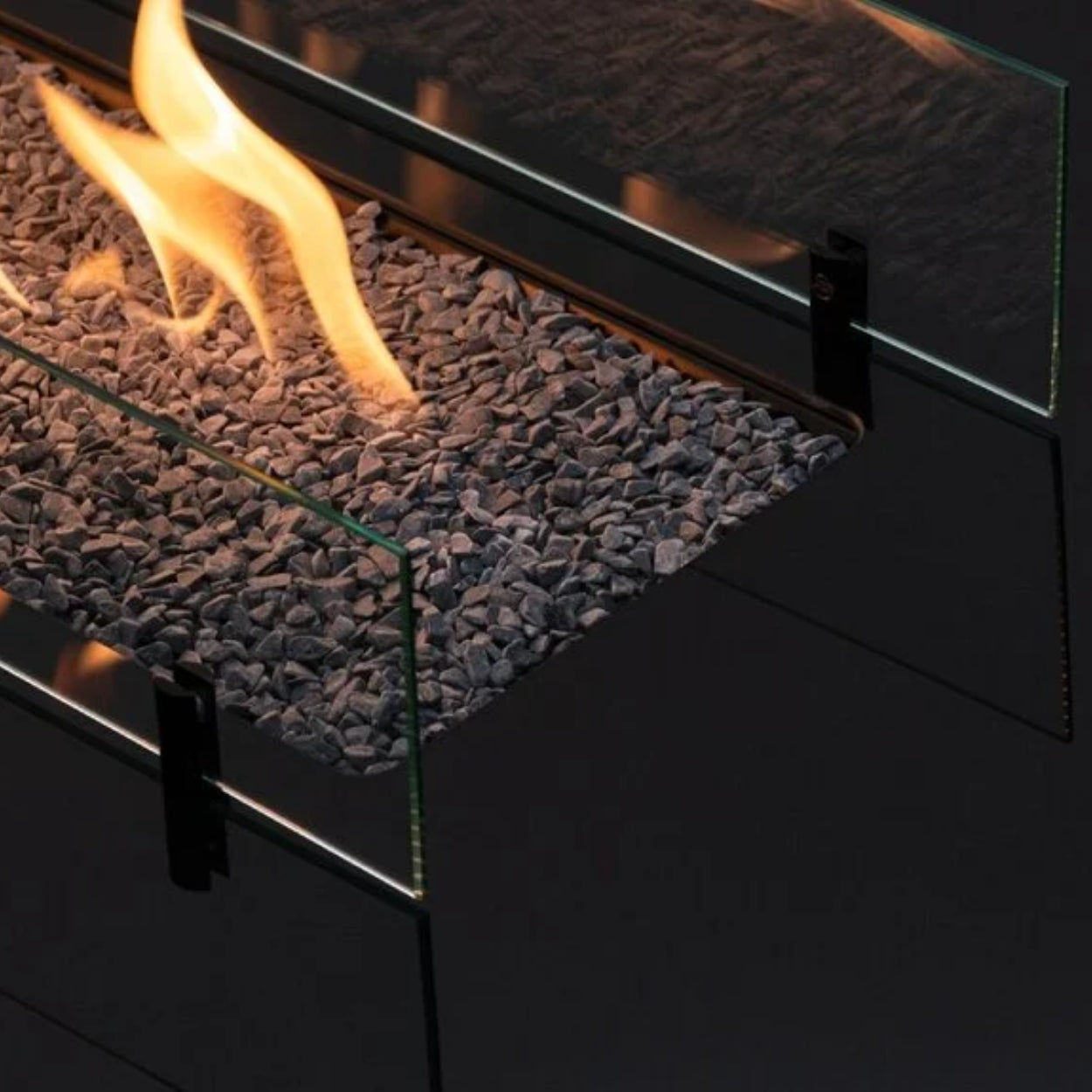 Aan beide zijden wordt de lineaire vlam beschermd én geaccentueerd door elegante glaspanelen. De decoratieve stenen binnenin creëren een romantisch vlammenspel dat elke ontmoeting bijzonder maakt. Dankzij de eenvoudige bediening geniet u binnen enkele minuten van een warme, uitnodigende ambiance.