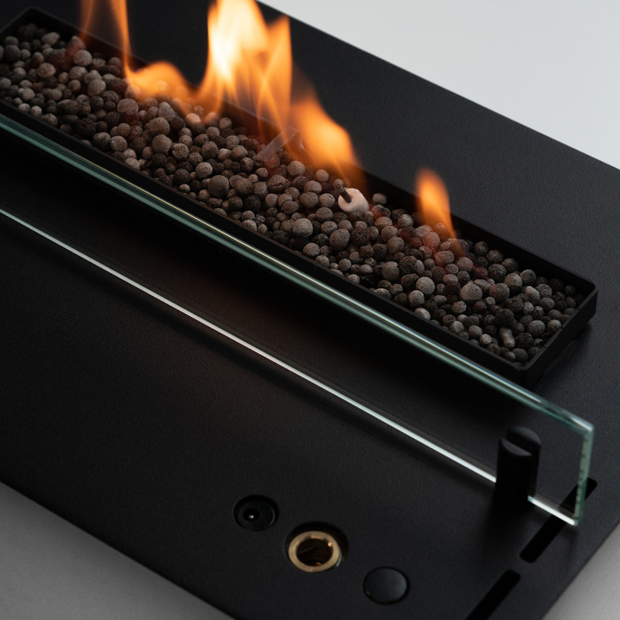 De haard is uitgerust met BEV-technologie® (Burning Ethanol Vapours), waarbij de brandstof eerst wordt verdampt en vervolgens boven de brander wordt ontstoken. Dit betekent dat er geen direct contact is tussen de vloeibare brandstof en de vlam, wat zorgt voor een uiterst veilig verbrandingsproces. Daarnaast waakt een reeks slimme veiligheidssensoren over de werking van het systeem.