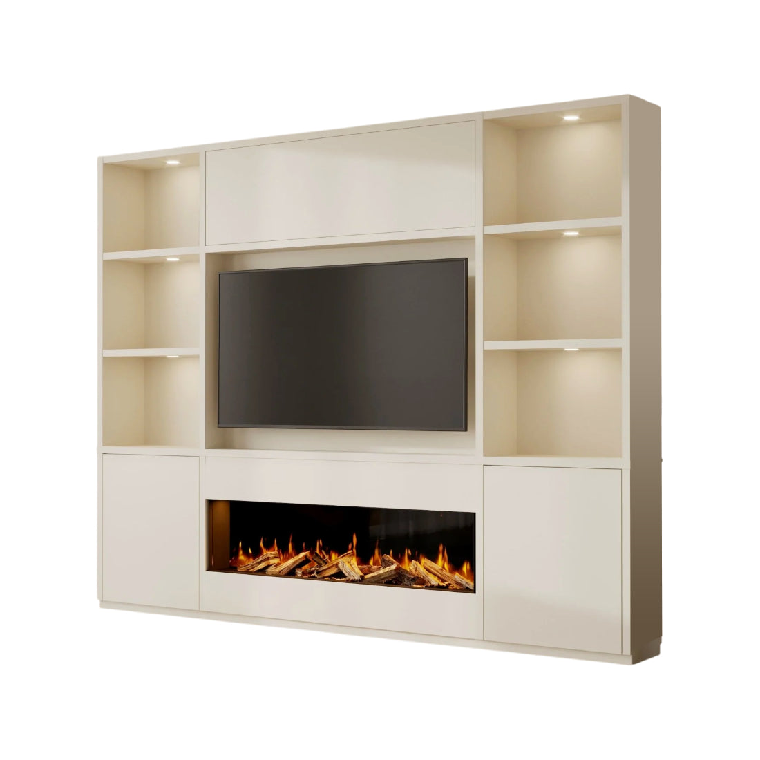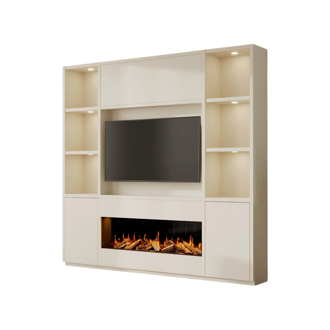 Transformeer uw woonkamer met een cinewall die warmte en elegantie uitstraalt. De open nissen geven ruimte aan persoonlijke accenten en decoraties, terwijl subtiel geplaatste verlichting het vuur en de inrichting laat stralen. Zo brengt u TV meubel design en gezelligheid samen, met een unieke blikvanger die volledig past in uw interieur.