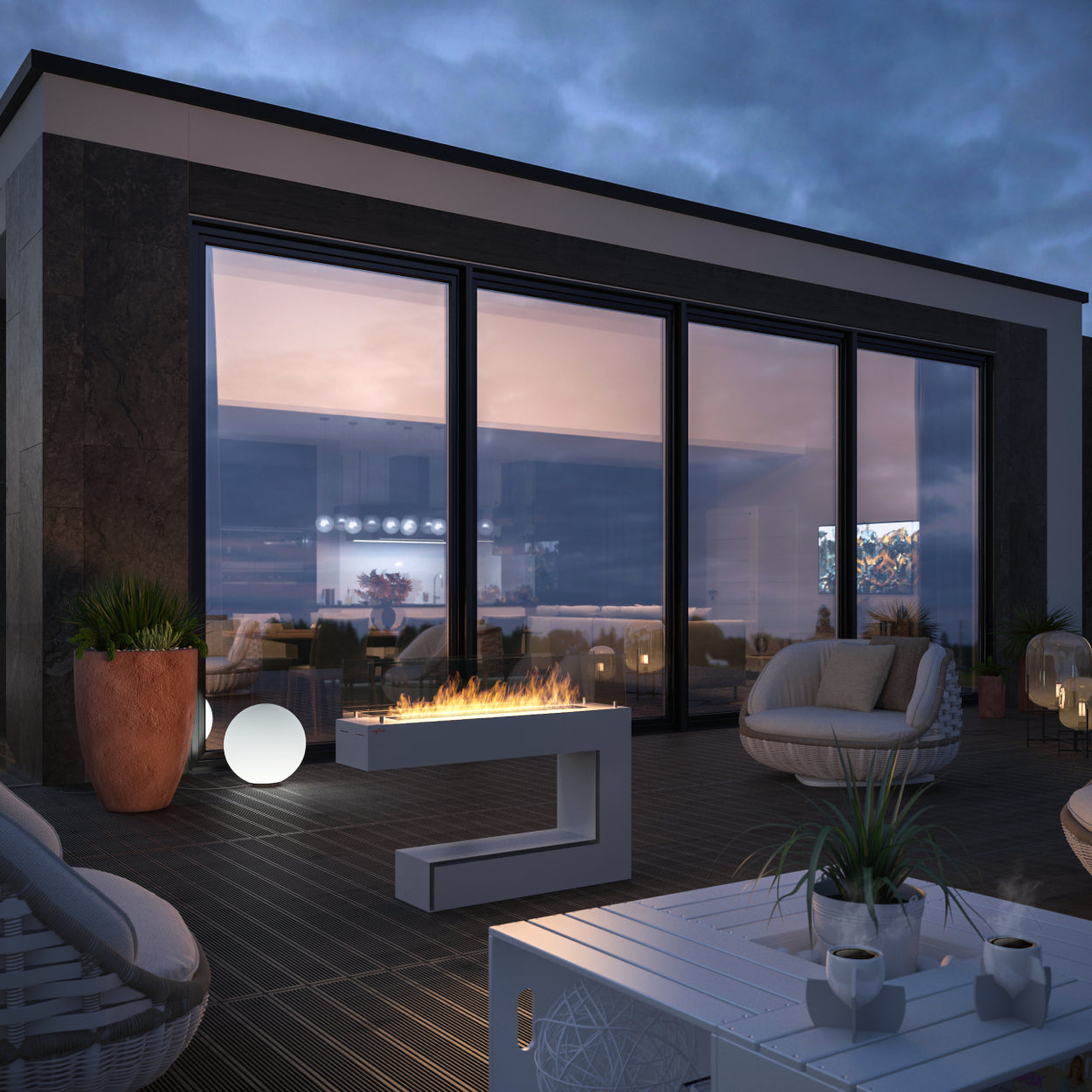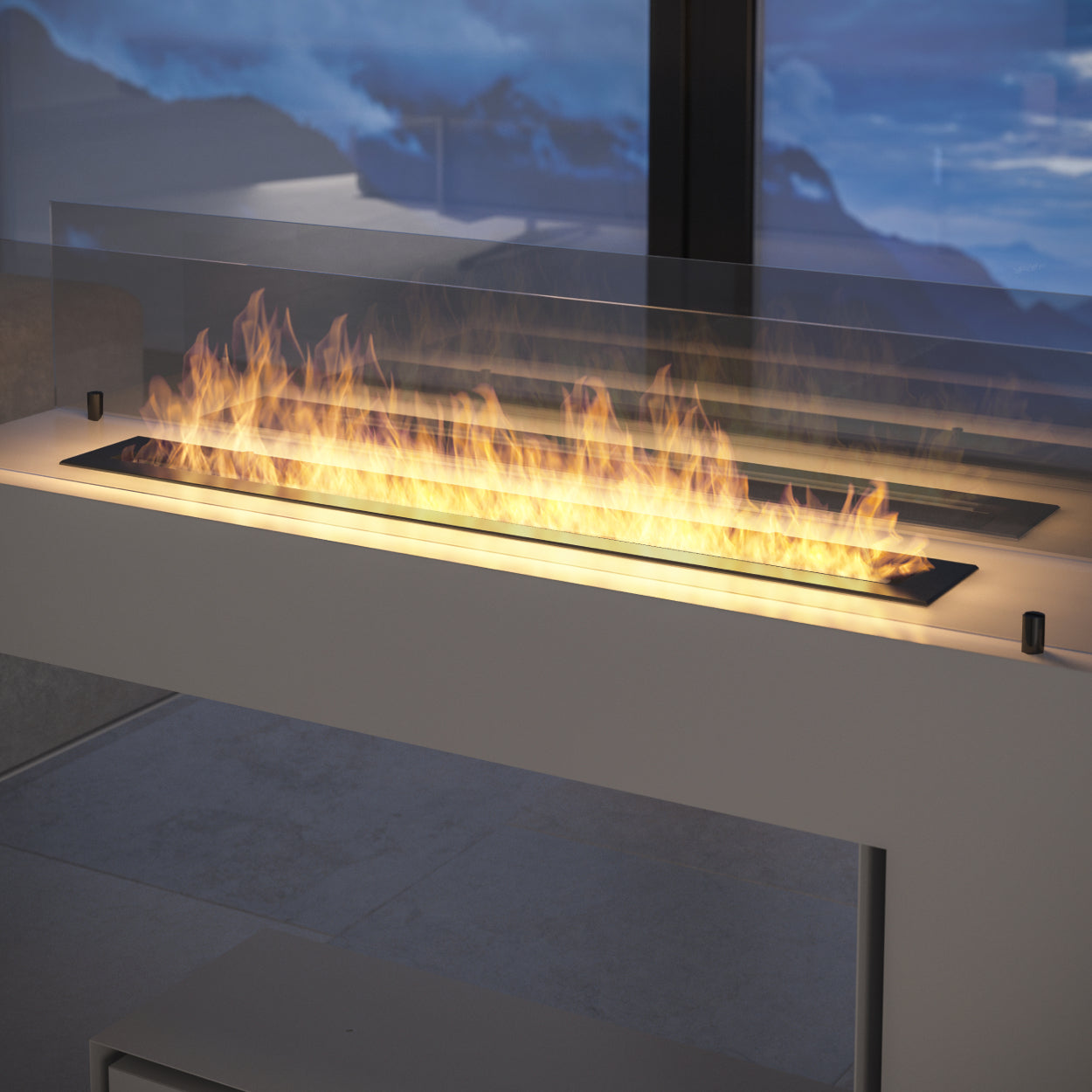 De strakke lijnen, matte witte coating en het getinte veiligheidsglas geven de haard een serene, luxe uitstraling. Het glas omlijst het vuur zonder het te beperken en zorgt voor een gebalanceerd en diep vlambeeld. De geïntegreerde plank onderaan biedt ruimte voor decoratie en versterkt de elegante uitstraling.