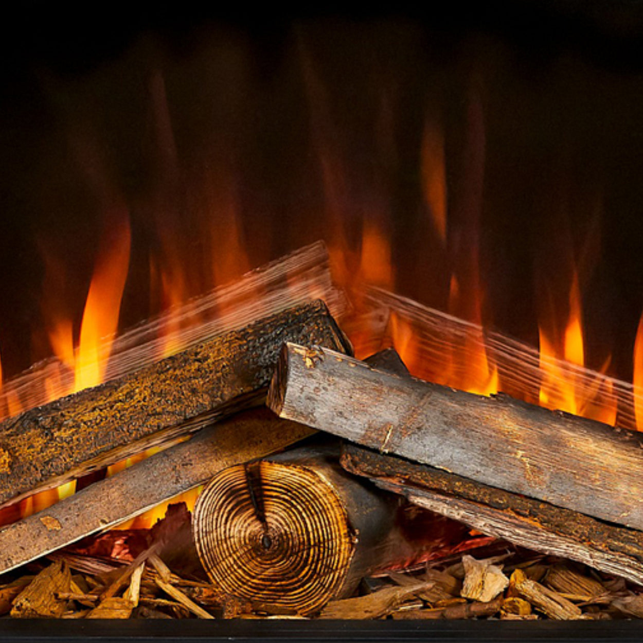 De haard wordt standaard geleverd met een luxe Deluxe Premium houtset en een donkere spiegelachterwand, die de vlammen prachtig reflecteert. De 3D-vlammensimulatie geeft u het gevoel van een echt knapperend vuur – zonder het onderhoud of de rook.