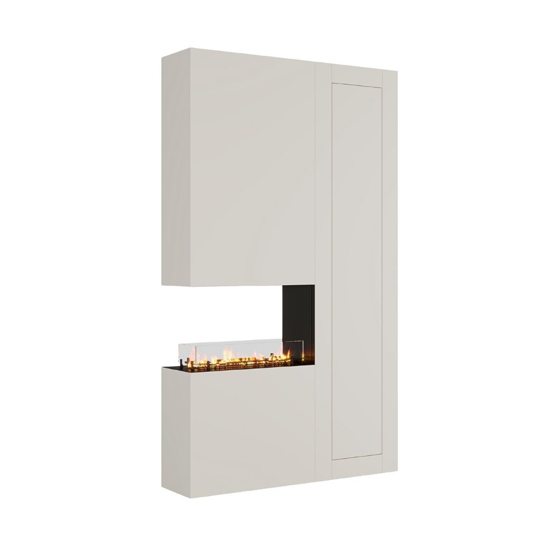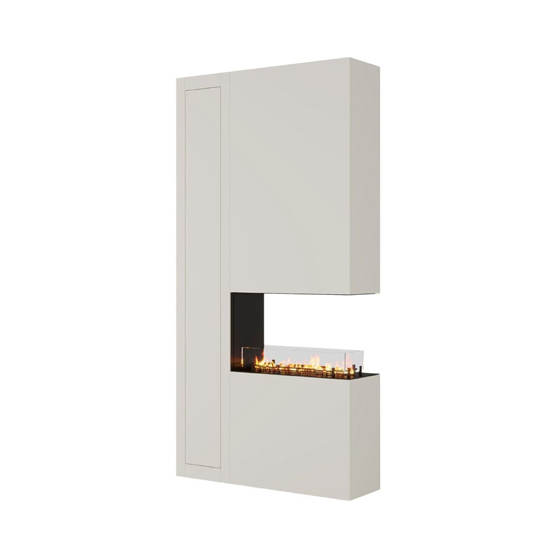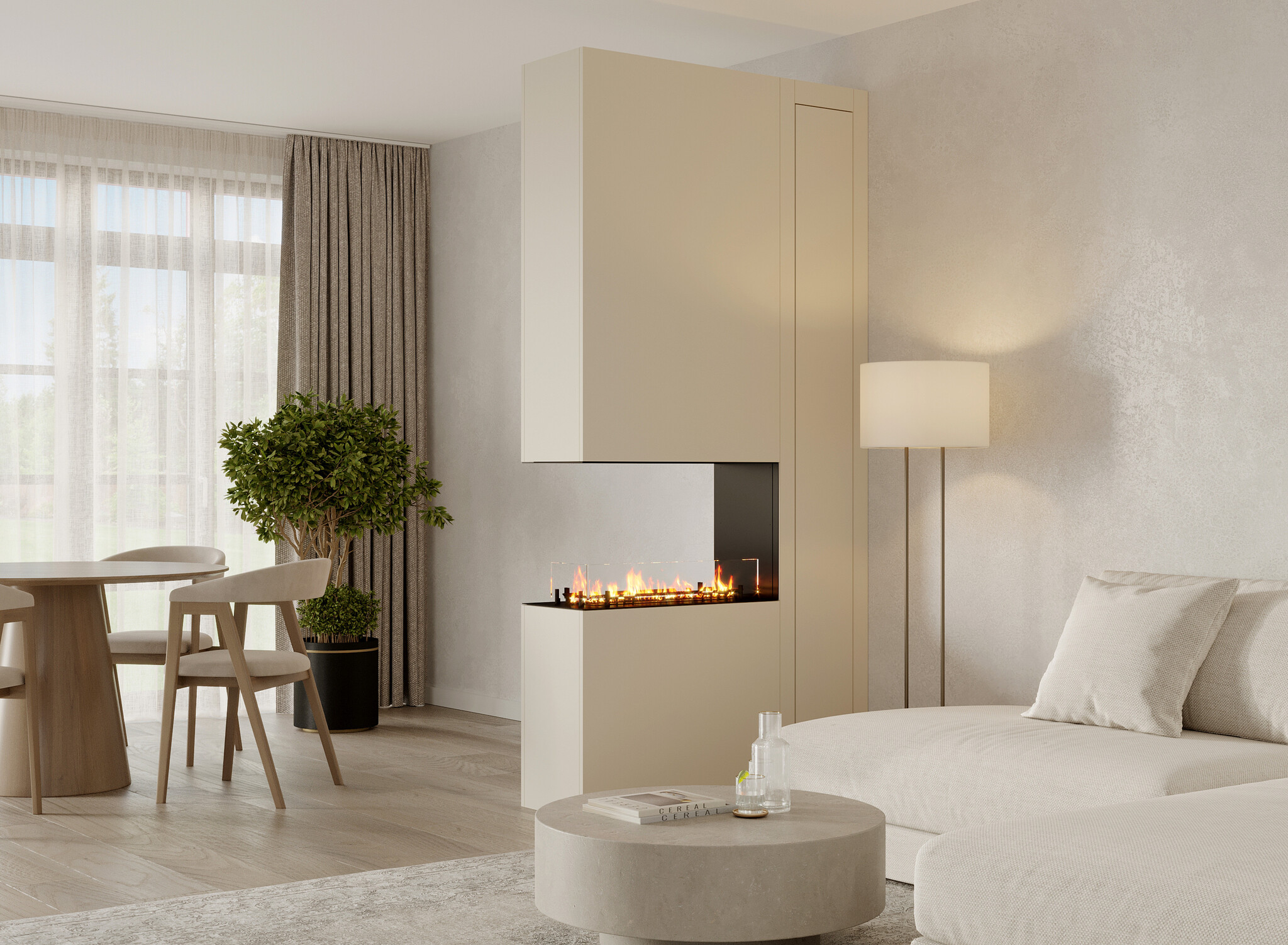 Het ontwerp van Maui is strak, symmetrisch en volledig in lijn met moderne interieurs. De panoramahaard is in het midden van de roomdivider geplaatst, wat zorgt voor een breed en open vuurzicht vanuit meerdere hoeken van de ruimte. Aan één zijde bevindt zich een subtiel geïntegreerde gesloten niskast, die zorgt voor extra opbergruimte – perfect voor accessoires, haardbenodigdheden of mediacomponenten.