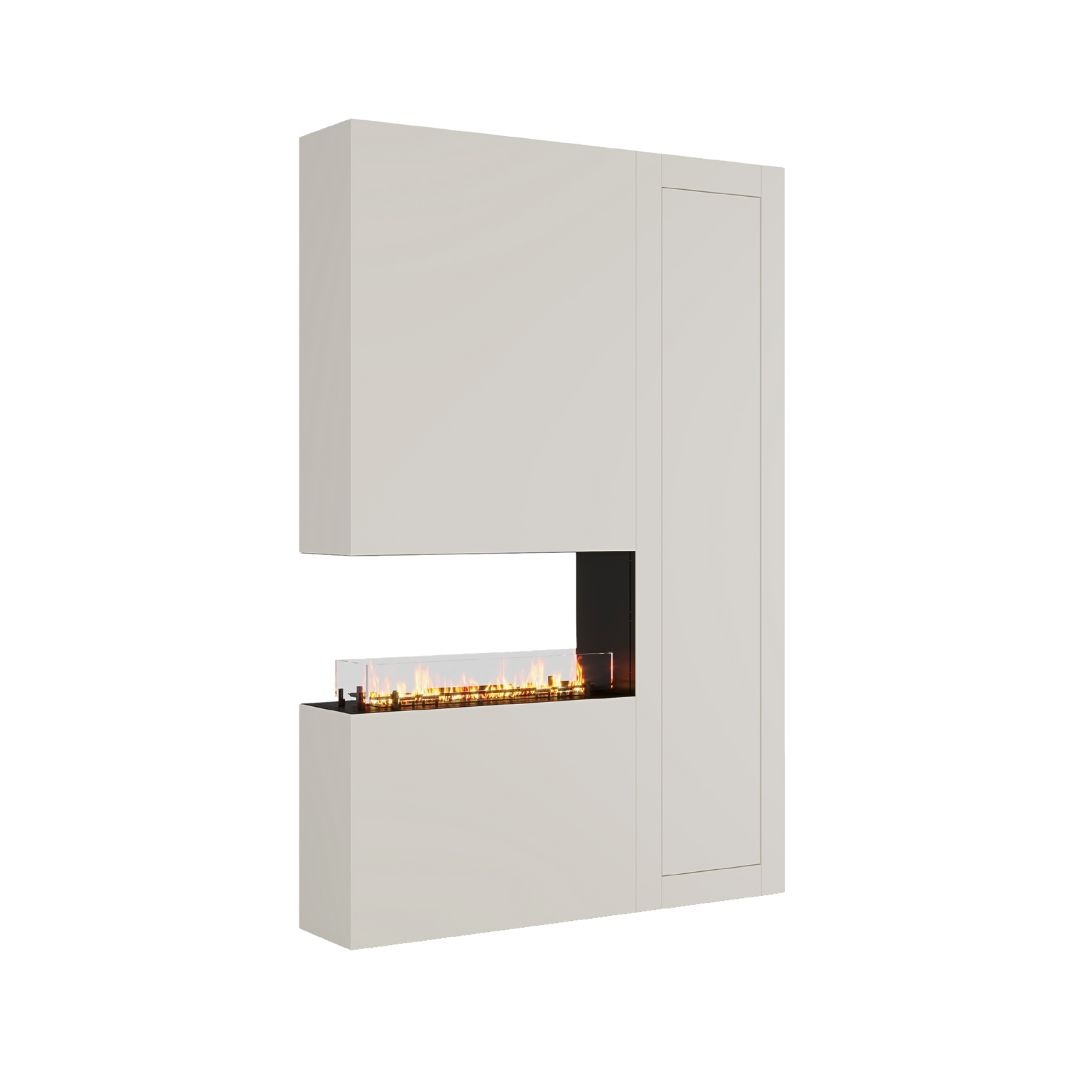 De haard ligt iets boven het midden van de wand, precies in het gezichtsveld, zodat u vanuit elke zithoek kunt genieten van het vlambeeld. Omdat de haard niet standaard wordt meegeleverd, kiest u zelf een model dat bij uw stijl en behoeften past – elektrisch of bio-ethanol. De roomdivider wordt zorgvuldig voorbereid op een veilige en esthetisch kloppende inbouw.