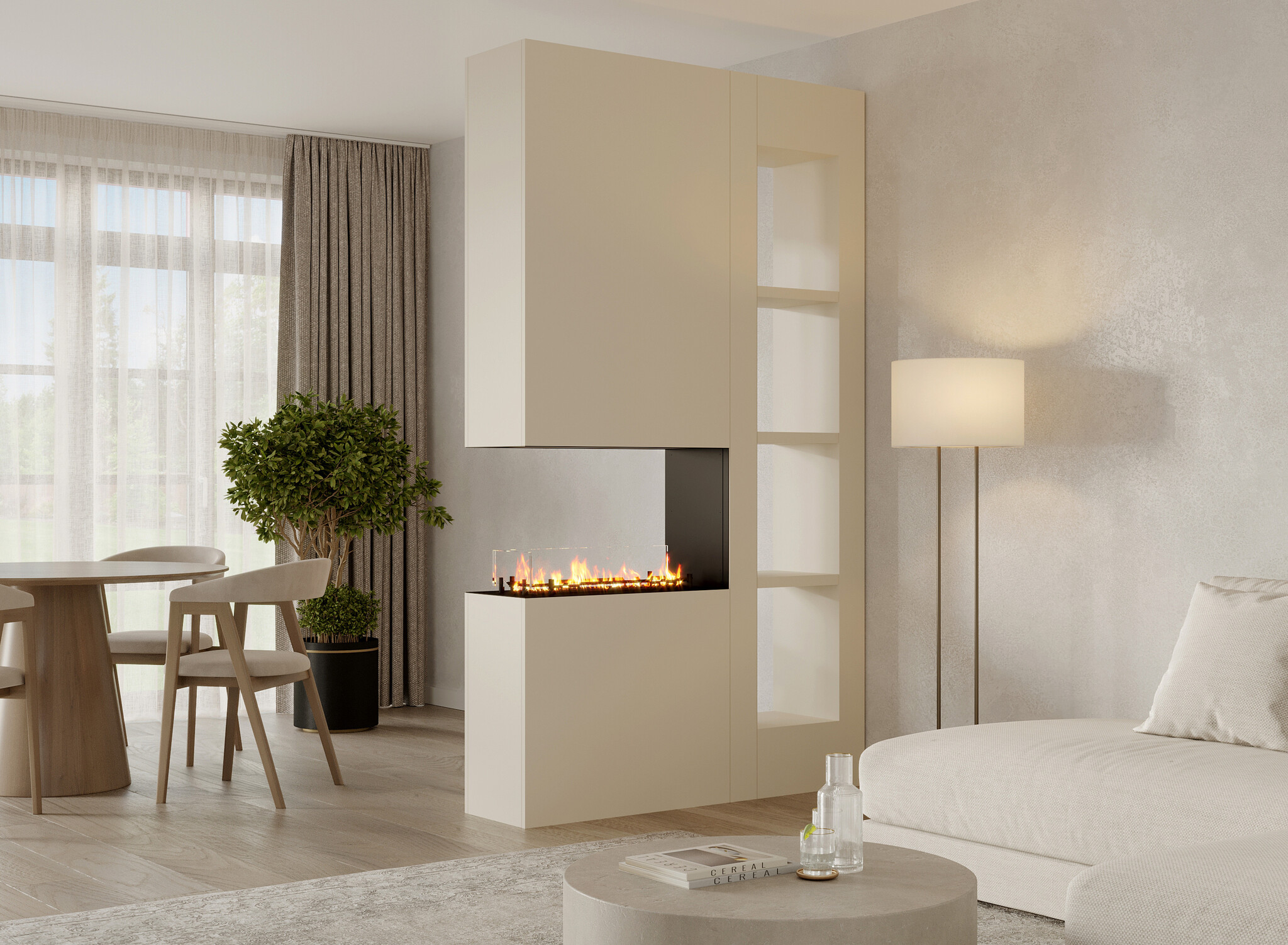 Nova is een stijlvolle roomdivider die ruimtes verdeelt zonder ze volledig af te sluiten. De kracht zit in de balans tussen het brede panoramische vuurzicht en de open niskast die ruimte biedt voor persoonlijke accenten. Dit meubel is ideaal voor wie sfeer, opbergruimte en openheid wil combineren in één strak vormgegeven geheel.
