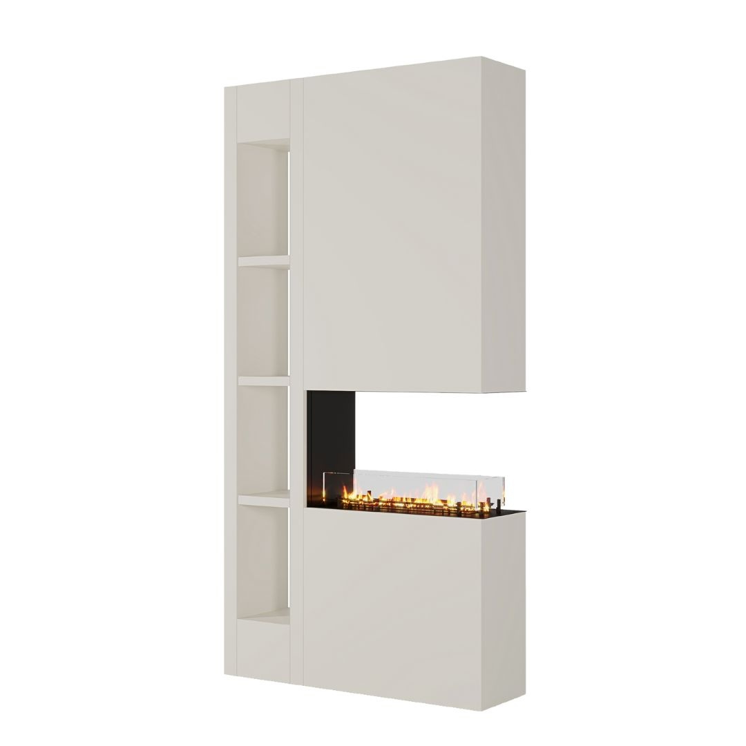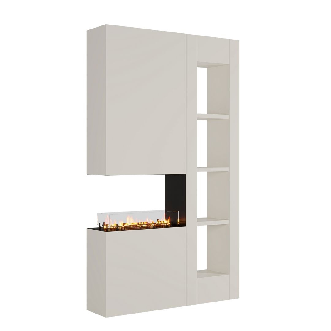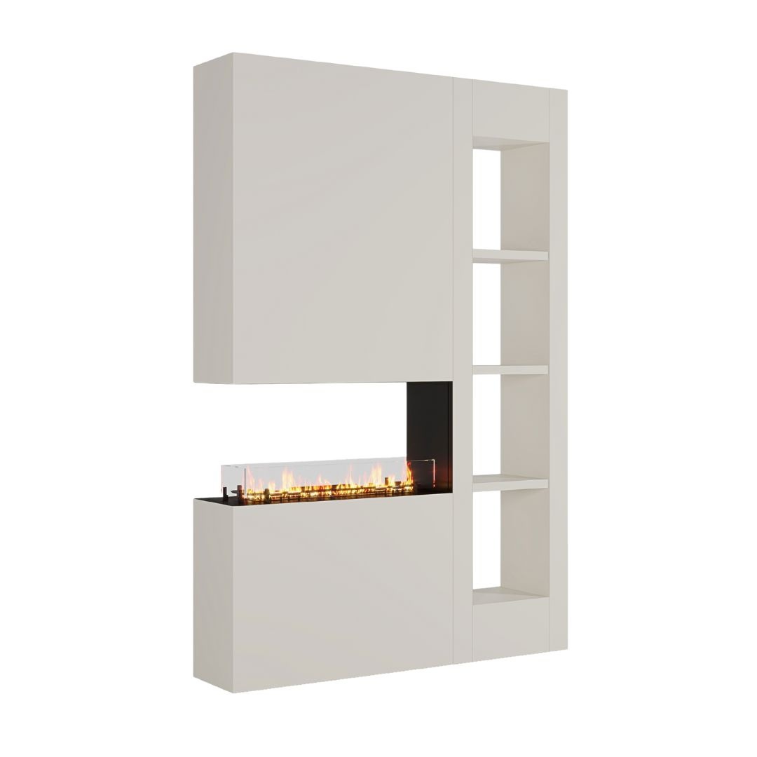Centraal in het meubel bevindt zich een panoramahaard, subtiel ingebouwd in het midden van de wand. Dankzij het brede vuurzicht is de vlam goed zichtbaar vanuit meerdere hoeken. Daarboven of ernaast (afhankelijk van de uitvoering) bevindt zich een open nis – perfect voor het plaatsen van decoratieve objecten zoals boeken, kunst of haardaccessoires.