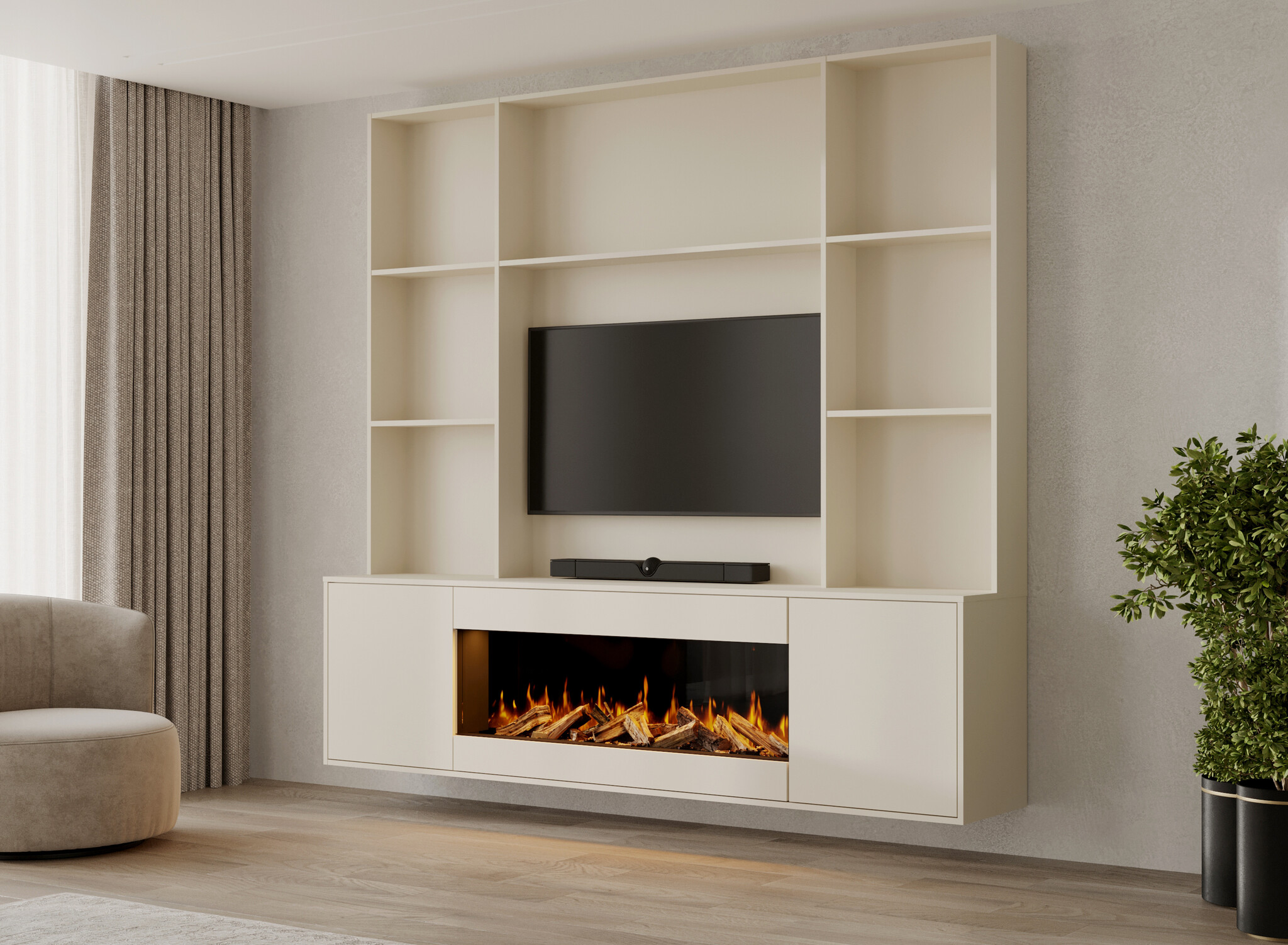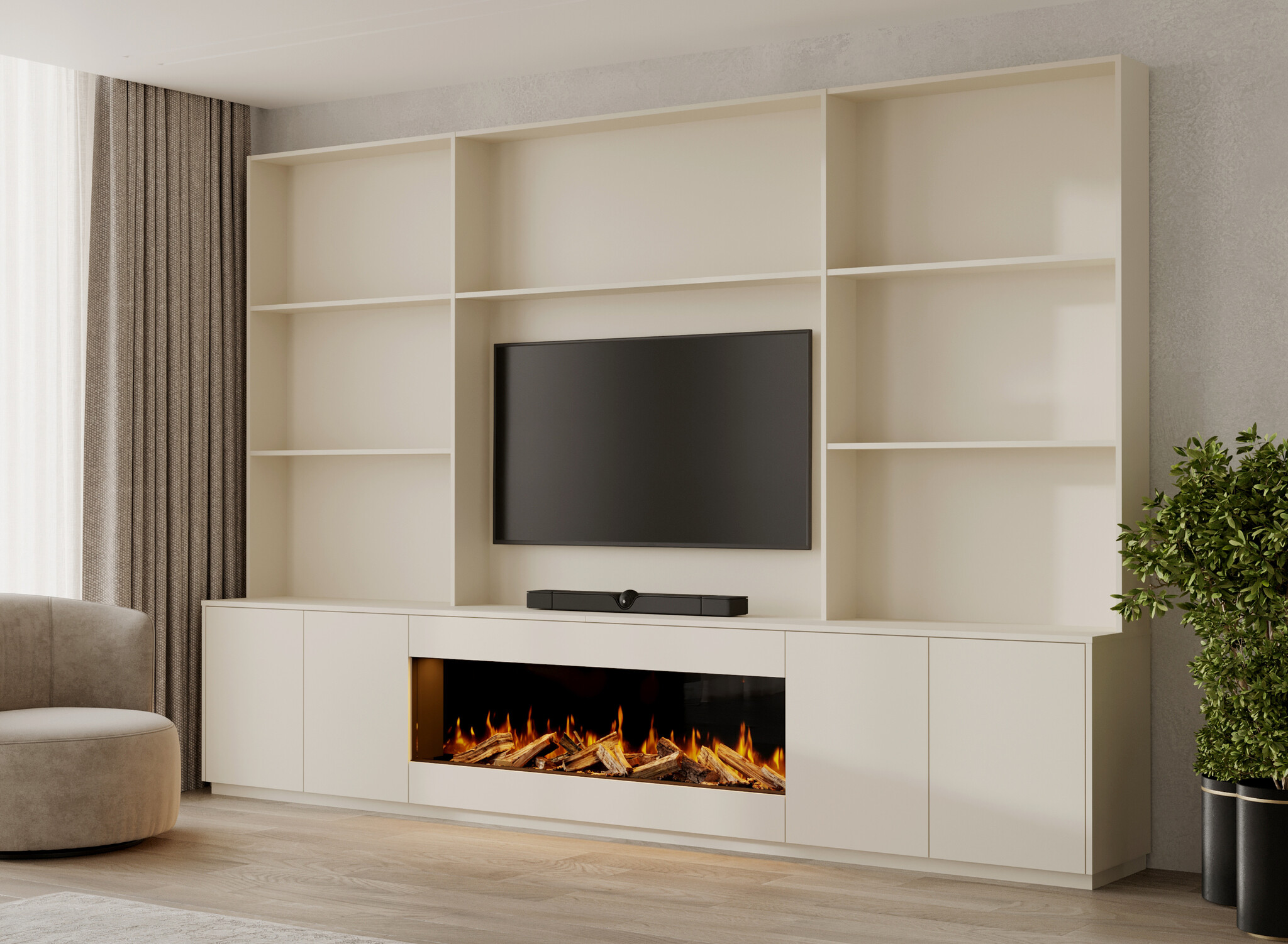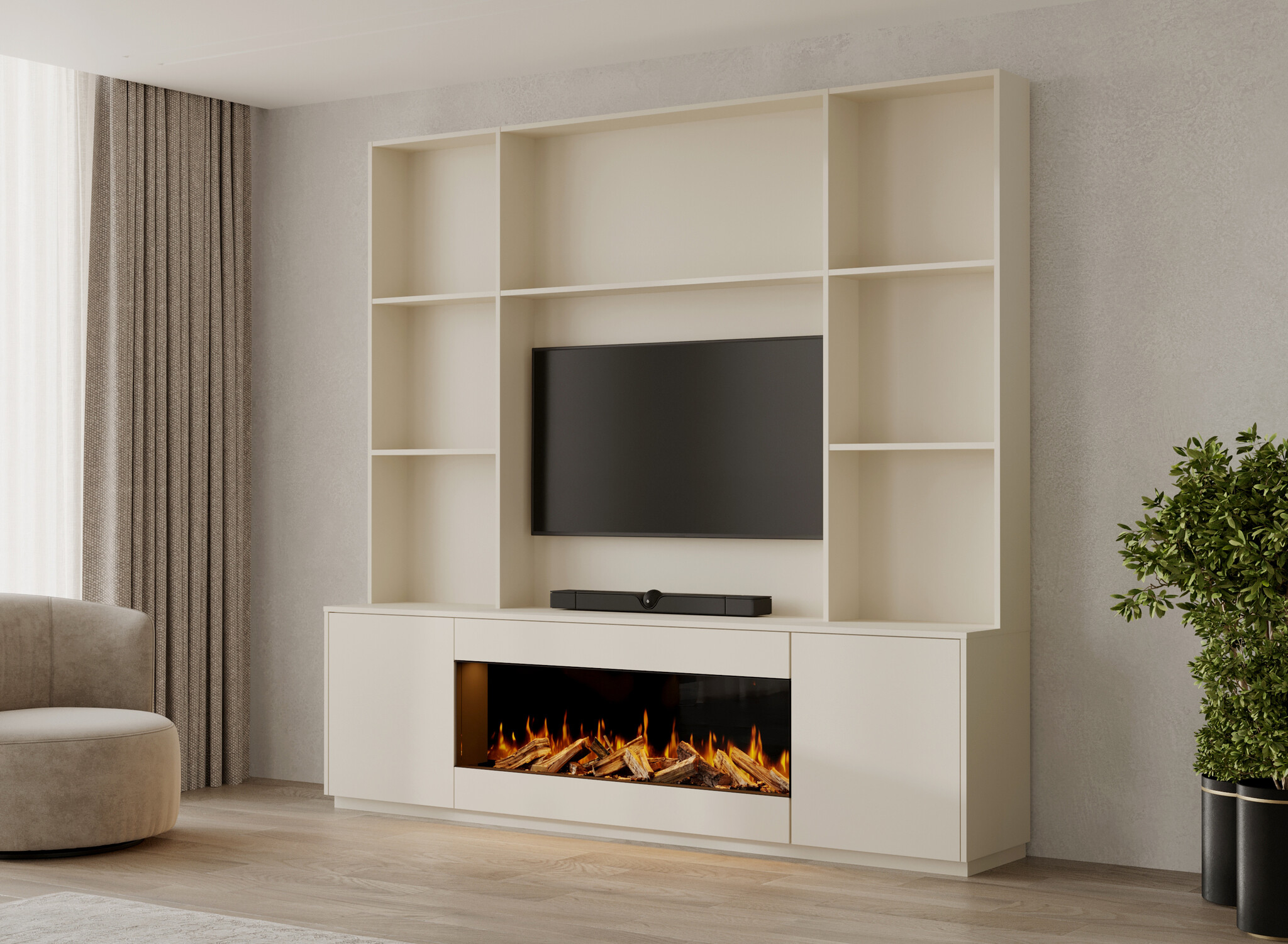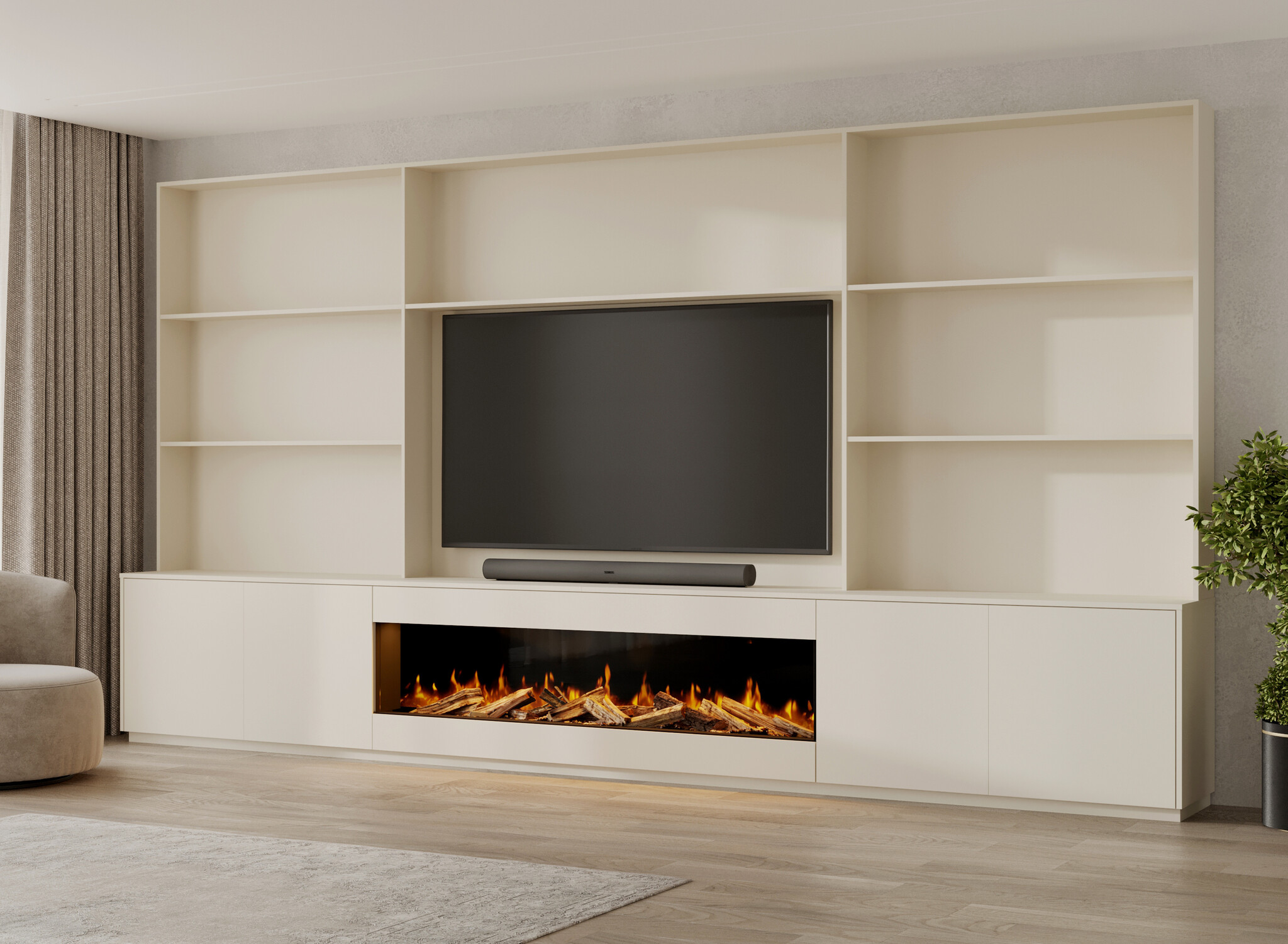 De haard wordt niet standaard meegeleverd, zodat u volledige vrijheid heeft in uw keuze. Malani is geschikt voor zowel elektrische als bio-ethanolhaarden. De uitsparing in het dressoir wordt afgestemd op het type haard, zodat deze naadloos in het ontwerp wordt opgenomen. Hierdoor blijft de tv-wand één harmonieus geheel, met het vlambeeld subtiel aanwezig onder de tv.