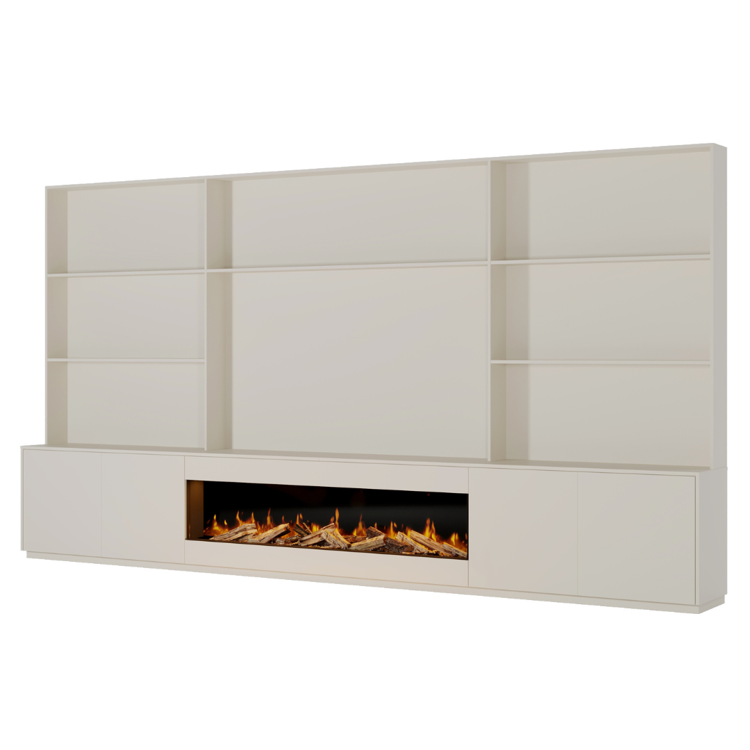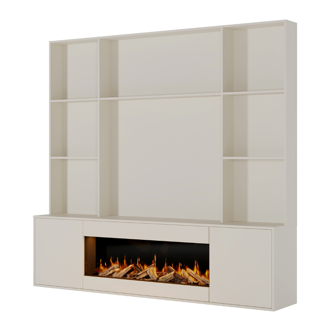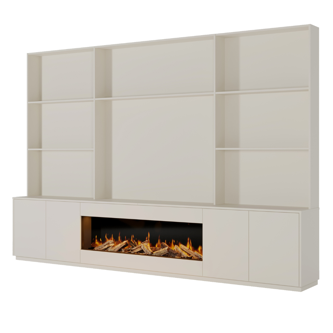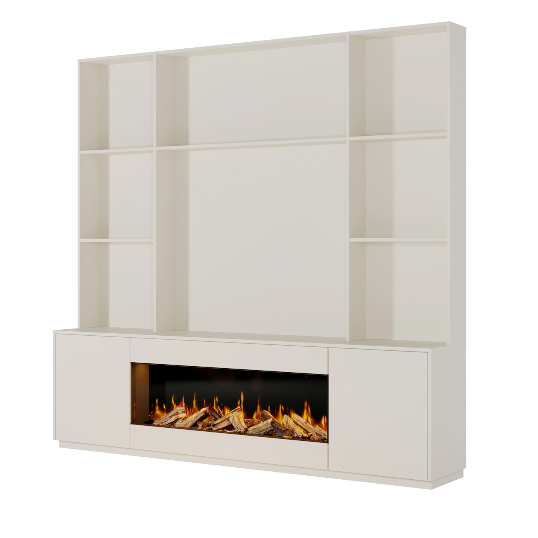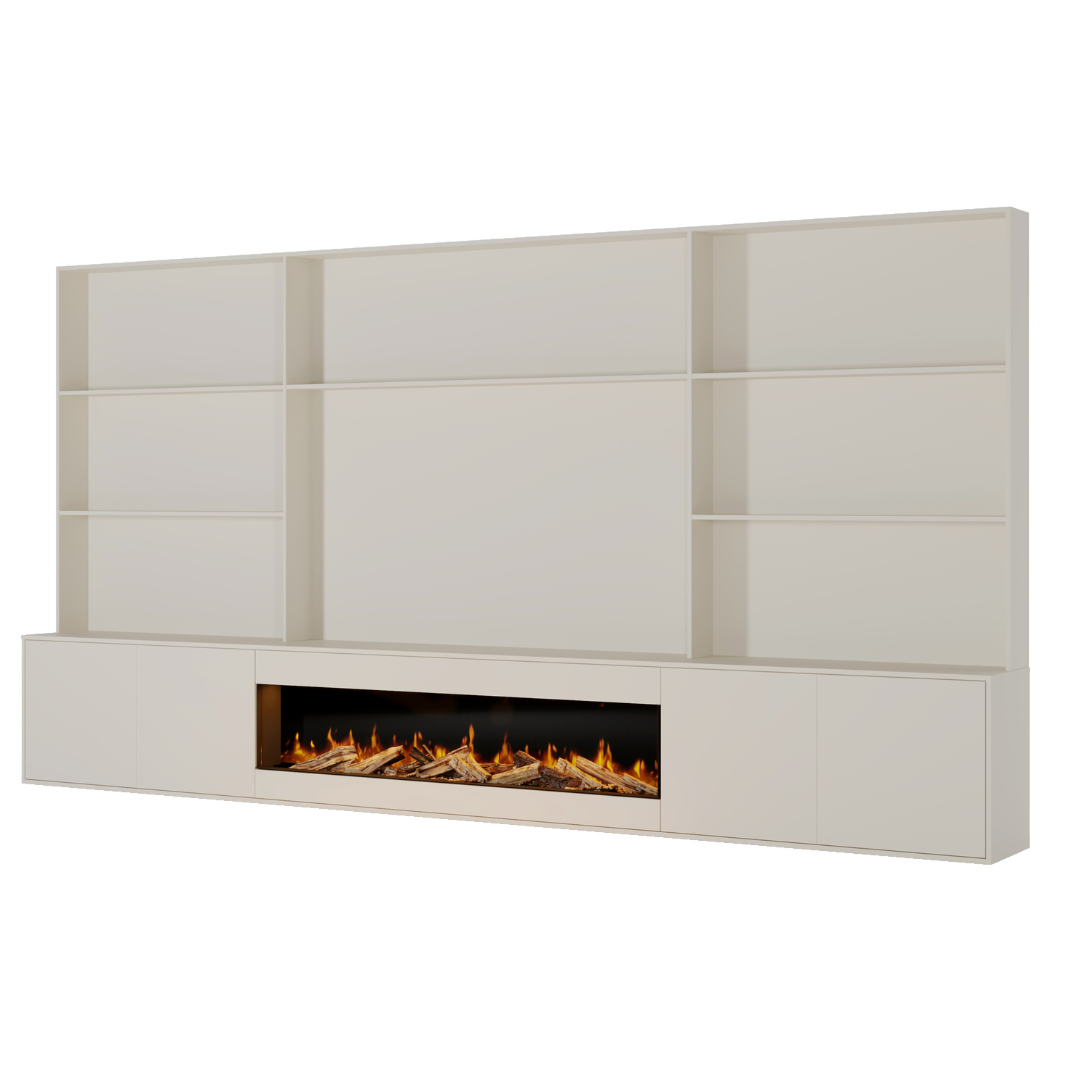 De haard wordt niet standaard meegeleverd, zodat u volledige vrijheid heeft in uw keuze. Malani is geschikt voor zowel elektrische als bio-ethanolhaarden. De uitsparing in het dressoir wordt afgestemd op het type haard, zodat deze naadloos in het ontwerp wordt opgenomen. Hierdoor blijft de tv-wand één harmonieus geheel, met het vlambeeld subtiel aanwezig onder de tv.