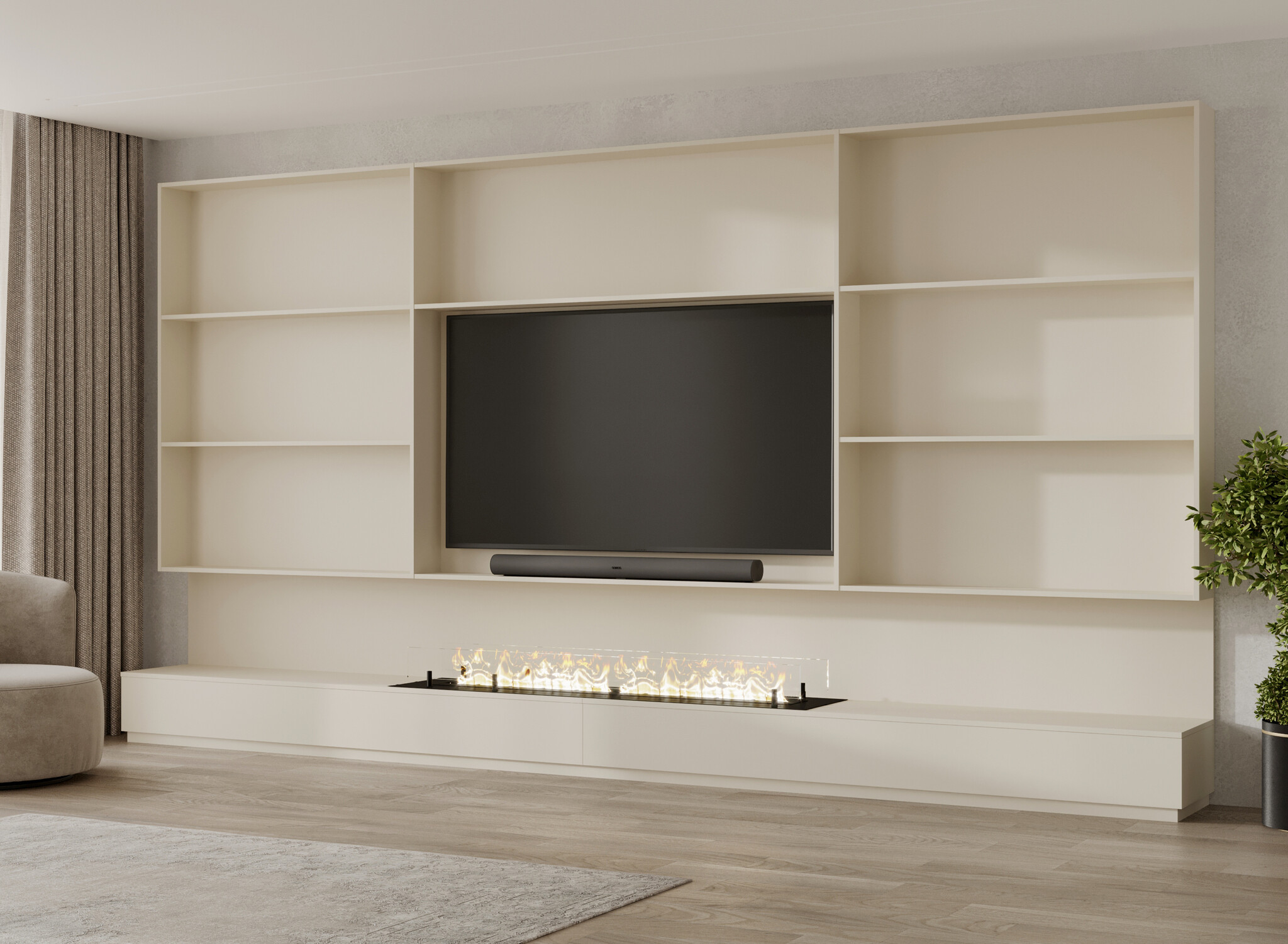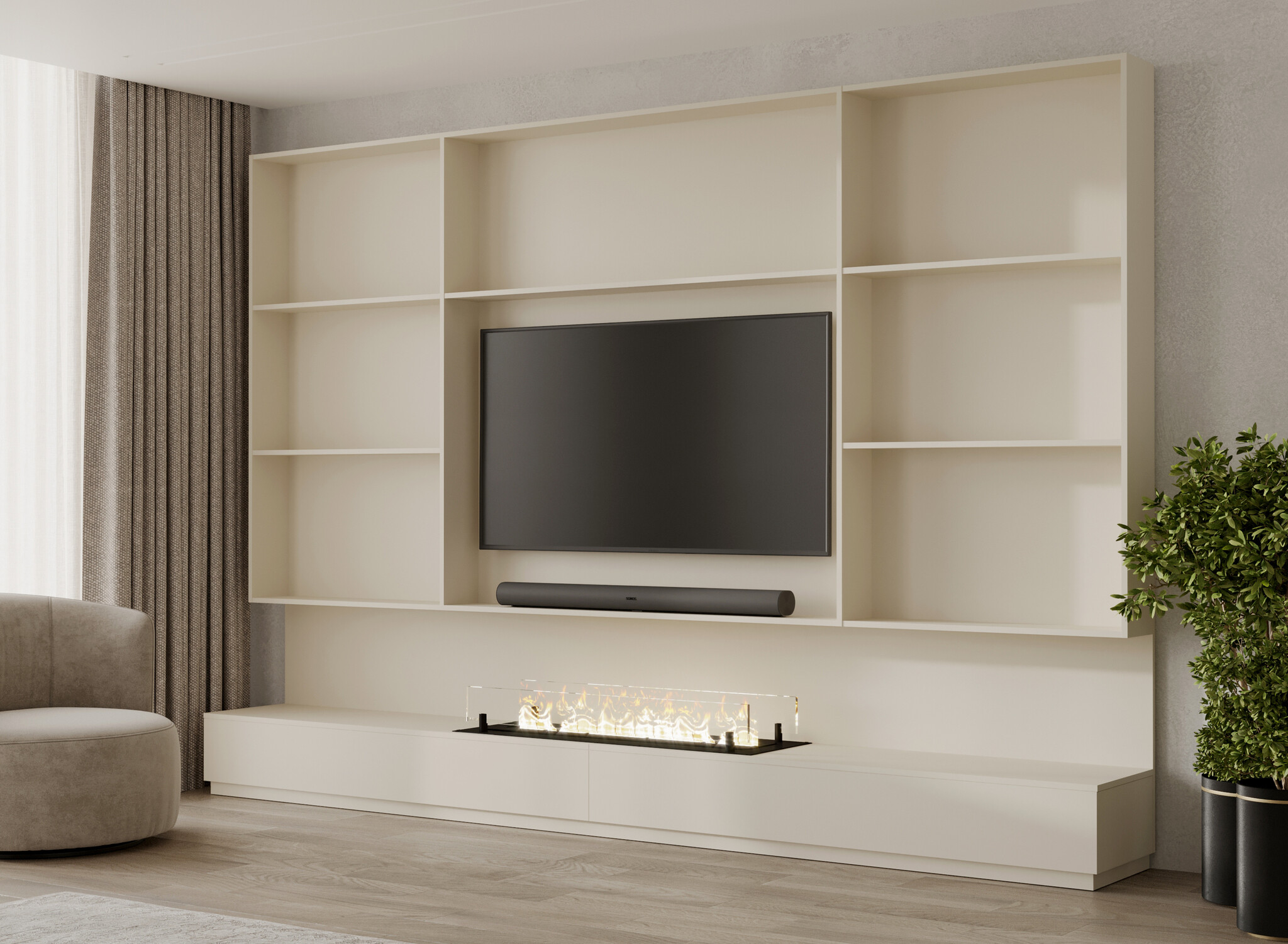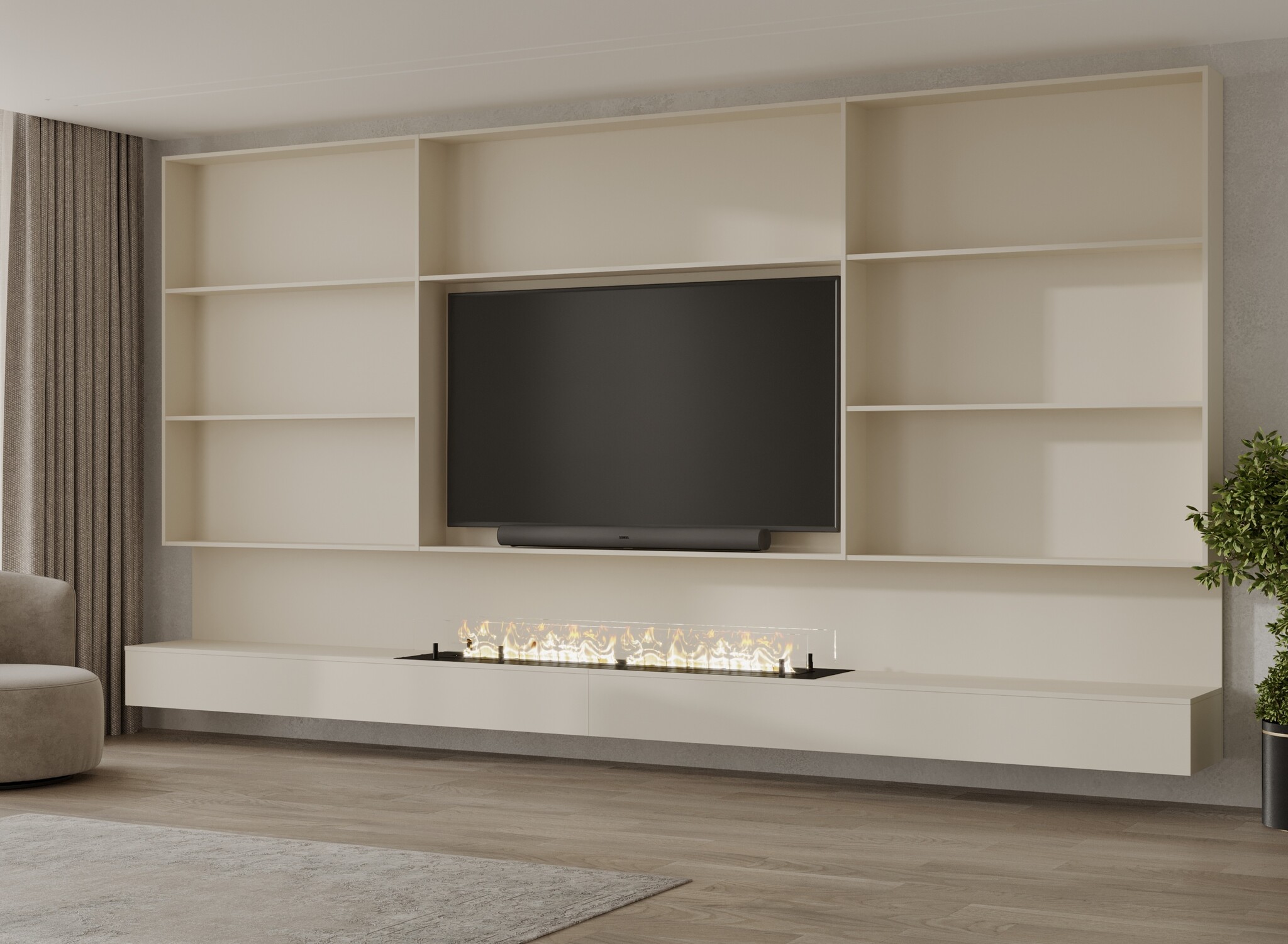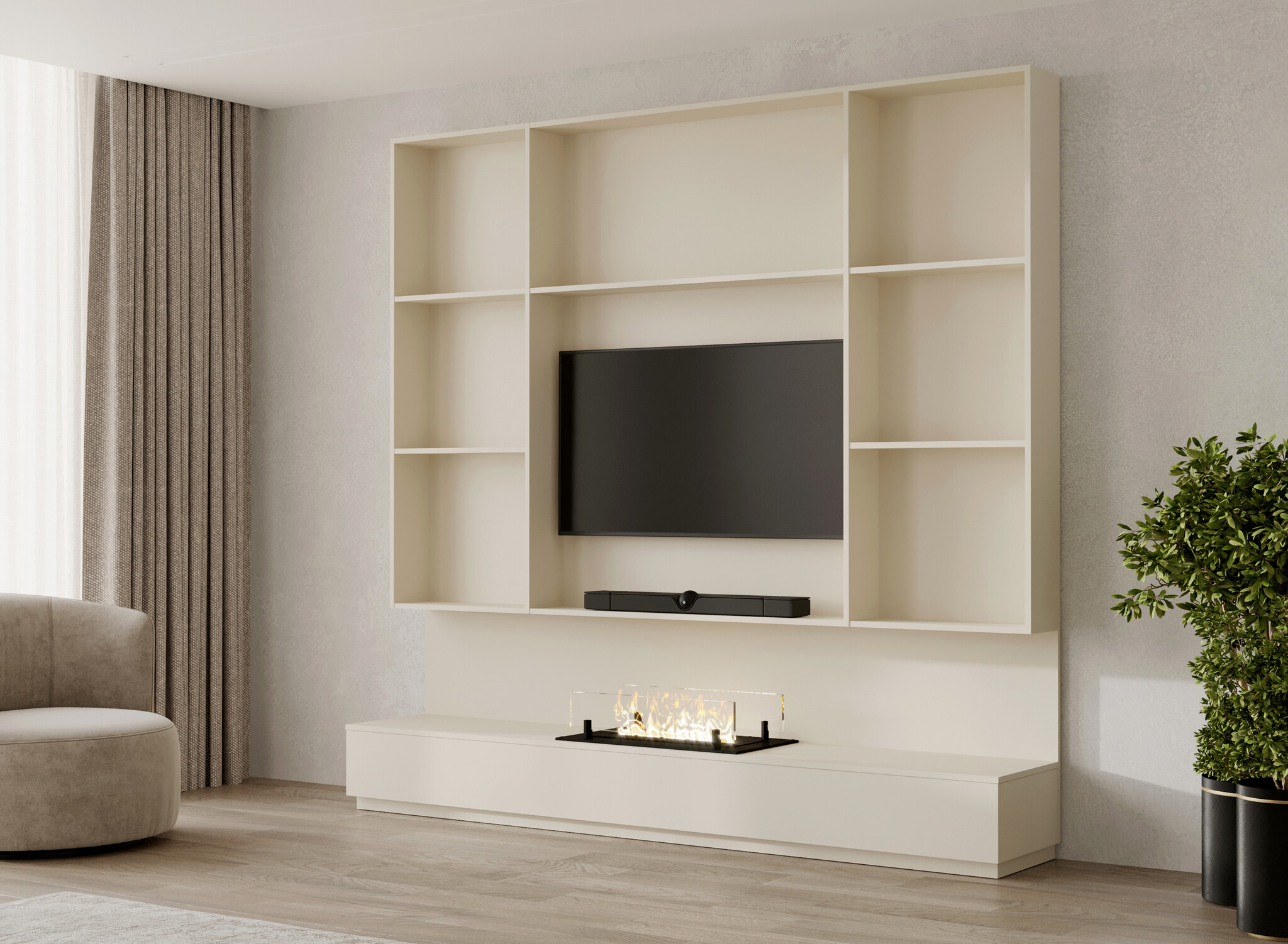 Shayn is een luxe tv-meubel dat elegantie en rust samenbrengt. De kastopbouw beschikt over open nissen voor decoratieve accenten, terwijl de onderzijde bestaat uit een strak vormgegeven dressoir. Het onderscheidende kenmerk van dit model is de geïntegreerde haard in de topplaat van het dressoir — een verfijnde oplossing die zorgt voor een harmonieuze balans tussen beeld, warmte en stijl. Verkrijgbaar als staand meubel met plint of in een zwevende uitvoering.